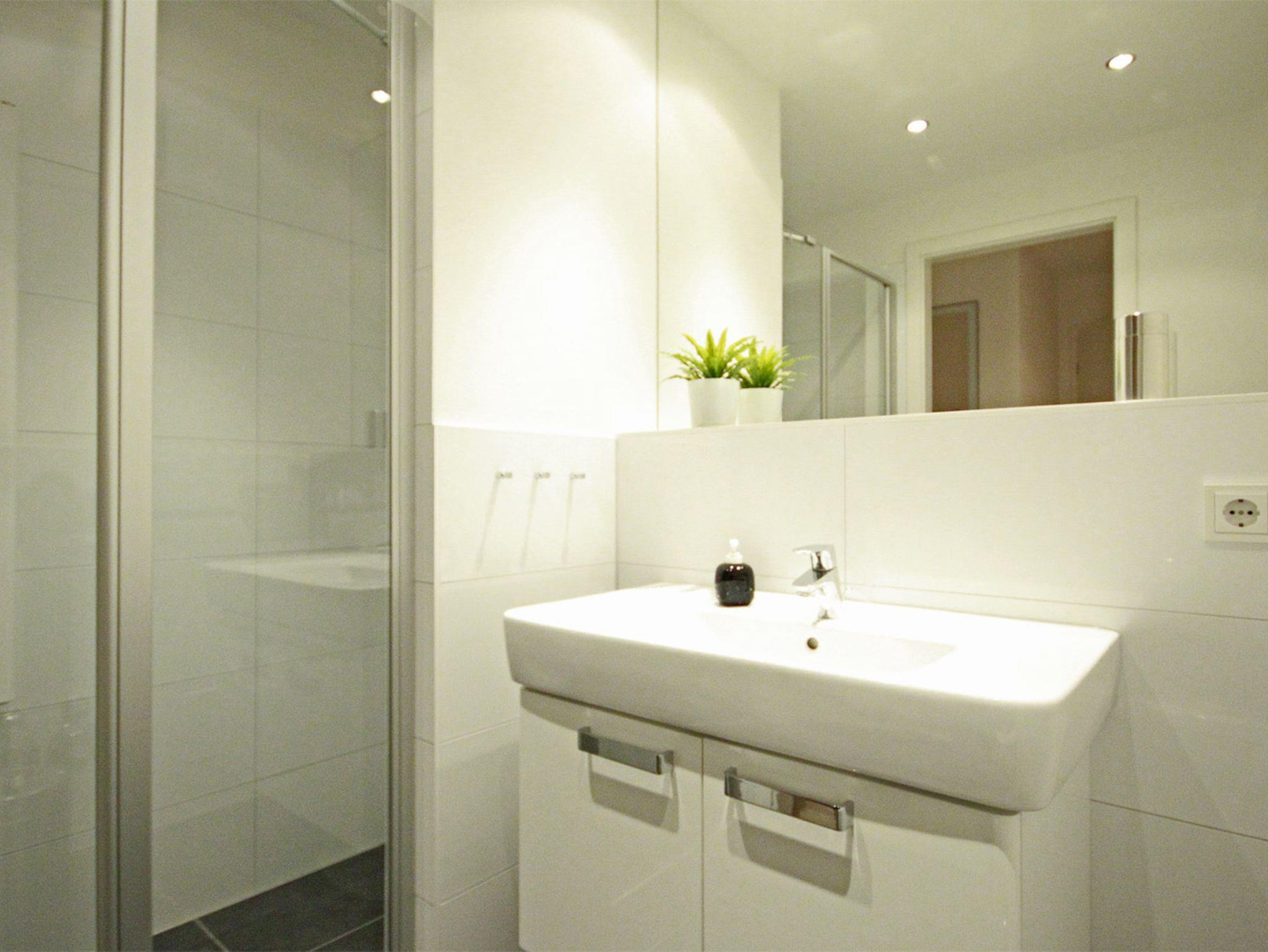 Neben einem Bad mit begehbarer Dusche, WC und Waschbecken verfügt die Wohnung über ein Gäste-WC.