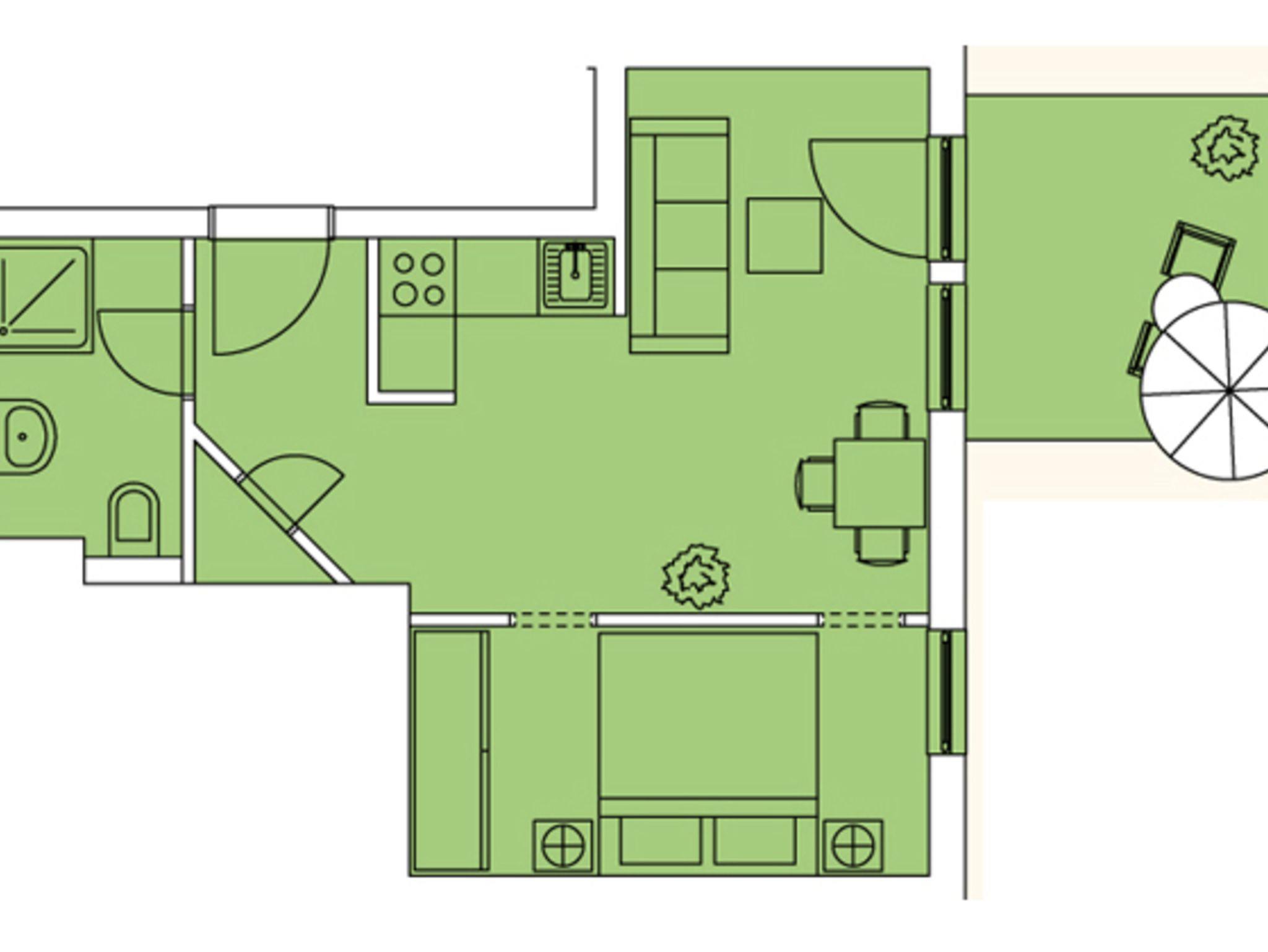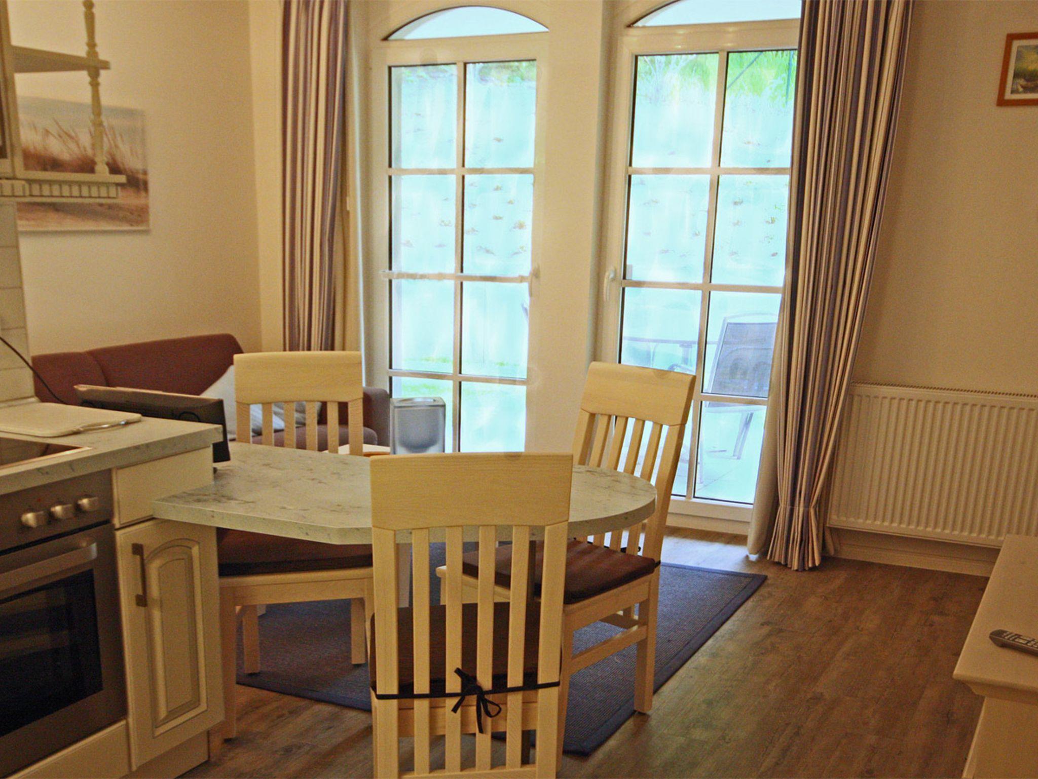 Die Ferienwohnung Strandläufer ist modern eingerichtet und hat eine private Terrasse mit vier Sitzplätzen, von der aus man einen seitlichen, eingeschränkten Meerblick durch die Kiefernbäume hat. Die Unterkunft bietet Platz für zwei Erwachsene und zwei Kinder bis 12 Jahren, für die ein Schlafsofa im Wohnbereich bereitsteht. Dort befindet sich außerdem eine Trennwand, hinter der der Schlafbereich mit Doppelbett ist. Der kombinierte Wohn-/Schlafbereich ist mit einem Fernseher, einem Radio und einem CD-Player ausgestattet.