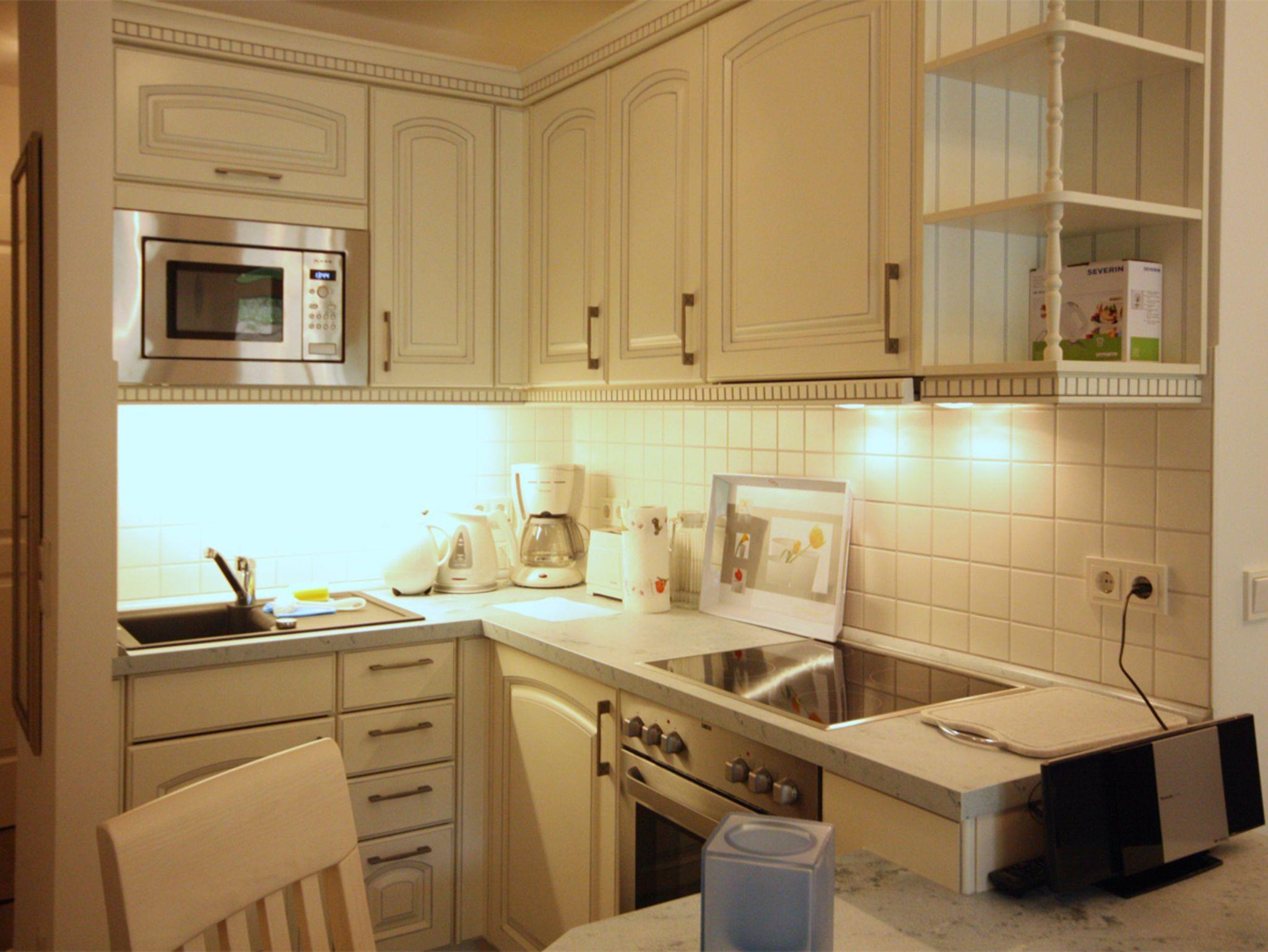 Die Küchenzeile hat einen Herd mit zwei Kochplatten, einen Kühlschrank, eine Kaffeemaschine, einen Toaster sowie eine Mikrowelle. Sie ist in den Wohnbereich integriert.