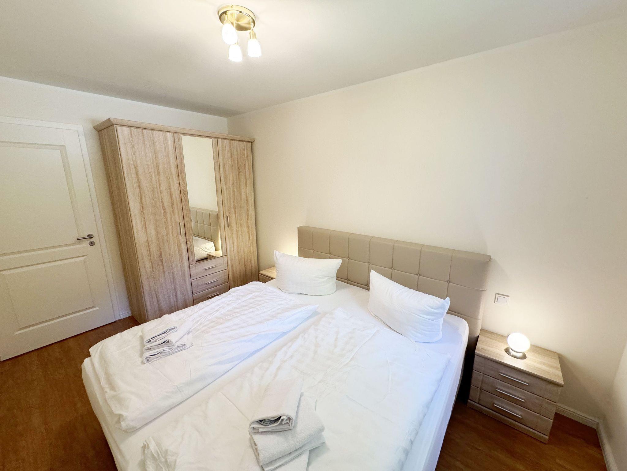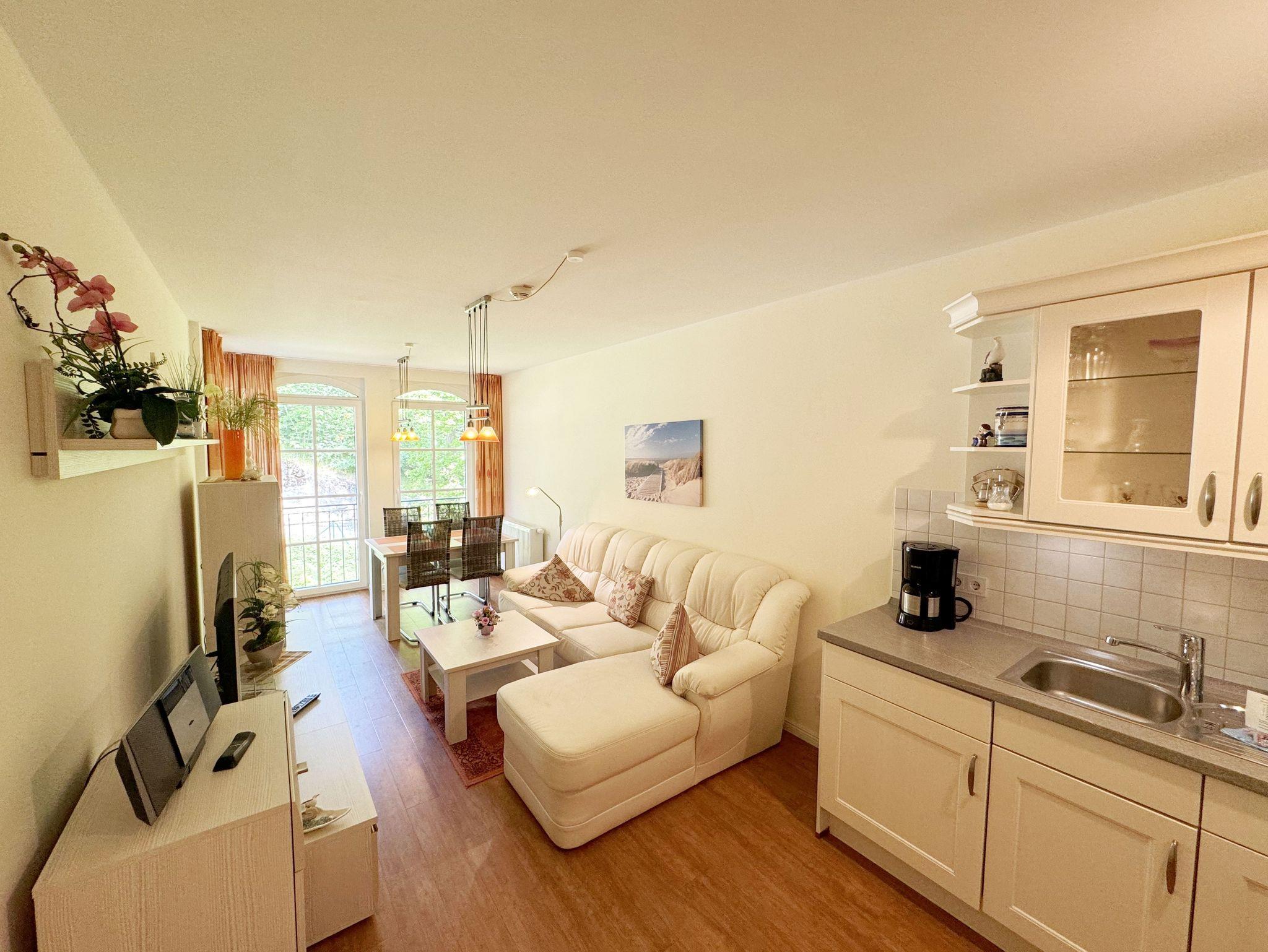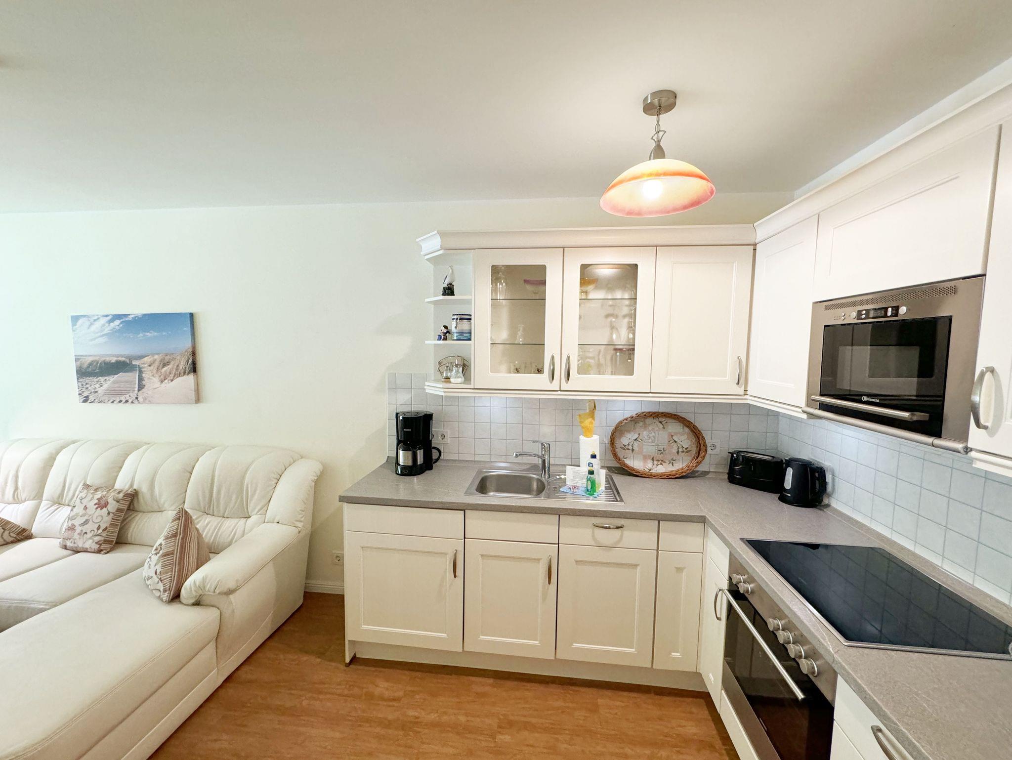 Die Nichtraucher/Ferienwohnung Strandperle (A.1.22) ist mit viel Liebe zum Detail ausgestattet und eingerichtet worden. Sie wohnen in einer ca. 41 qm 2-Zimmer Wohnung, die für max. 2 Personen ausgelegt ist. Die Wohnung Strandperle befindet sich in der 1. Etage und ist bequem per Fahrstuhl von der Tiefgarage zu erreichen. In der Wohnung finden Sie einen kombinierten Wohn/Koch- und Essbereich. Die integrierte Küchenzeile lässt mit Mikrowelle, Backofen, Ceranfeld, Spülmaschine, Kühlschrank mit Gefrierfach, Kaffeemaschine, Toaster, Wasserkocher und anderen praktischen Helfern keine Wünsche offen. Im Wohnbereich ist weiterhin eine Essecke, eine gemütliche Couch sowie ein Smart-TV, DVD-Player und ein Radio mit CD und eine Leselampe. Ein Internetanschluss (WLAN/LAN) ist für Sie inklusive. Der Balkon ist vom Wohn/Essbereich begehbar und komplett möbliert. Von hier aus schauen Sie in Richtung Kiefern und Dünen. Drei große bis zum Boden reichende Glastüren/fenster geben dem Zimmer eine besondere Note. Das Schlafzimmer ist mit einem Boxspringbett (1,80m x 2,00m), Ablagefläche und einem Kleiderschrank sowie Insektenschutzgitter ausgestattet. Das Bad verfügt über eine ebenerdige Dusche, Waschbecken, WC, Haarfön, Kosmetikspiegel und Handtuchheizkörper. Eine kleine Abstellkammer finden Sie im Flurbereich. Ein eigener PKW-Stellplatz (Nr.30, Einfahrtshöhe 2,00m) befindet sich in der Tiefgarage des Hauses. Im Keller des Hauses haben Sie die Möglichkeit eine Waschmaschine/Trockner gegen Gebühr zu nutzen. Mit dem Fahrstuhl des Hauses A gelangen sie in das Untergeschoss der Meeresblickanlage, wo Sie ein großzügiger und heller Wellnessbereich erwartet. Hier können sie in einem Pool kleine Bahnen schwimmen, in 2 Saunen Ihren Kreislauf in Schwung bringen, in einem dazugehörigen Ruheraum Ihren Körper wieder beruhigen, in einer Schneckendusche sowie weiteren Duschen das kühle Nass genießen und auf einer Außenterrasse mit Außendusche die frische Luft einatmen. Die Erstausstattung von einem Wäschepaket (die komplette Bettwäsche, 1 Duschhandtuch, 2 kleine Handtücher) ist im Mietpreis ab 7 Nächten pro Person inbegriffen. Bei einer Belegung unter 7 Nächten können Sie diese durch Eigenmitnahme ergänzen bzw. bis 14 Tage vor Anreise gegen einen Aufpreis dazu buchen. Ab 2 Wäschepaketen erhalten Sie einmalig 1 Geschirrhandtuch und 1 Duschvorleger hinzu. Haustiere sind nicht erlaubt.