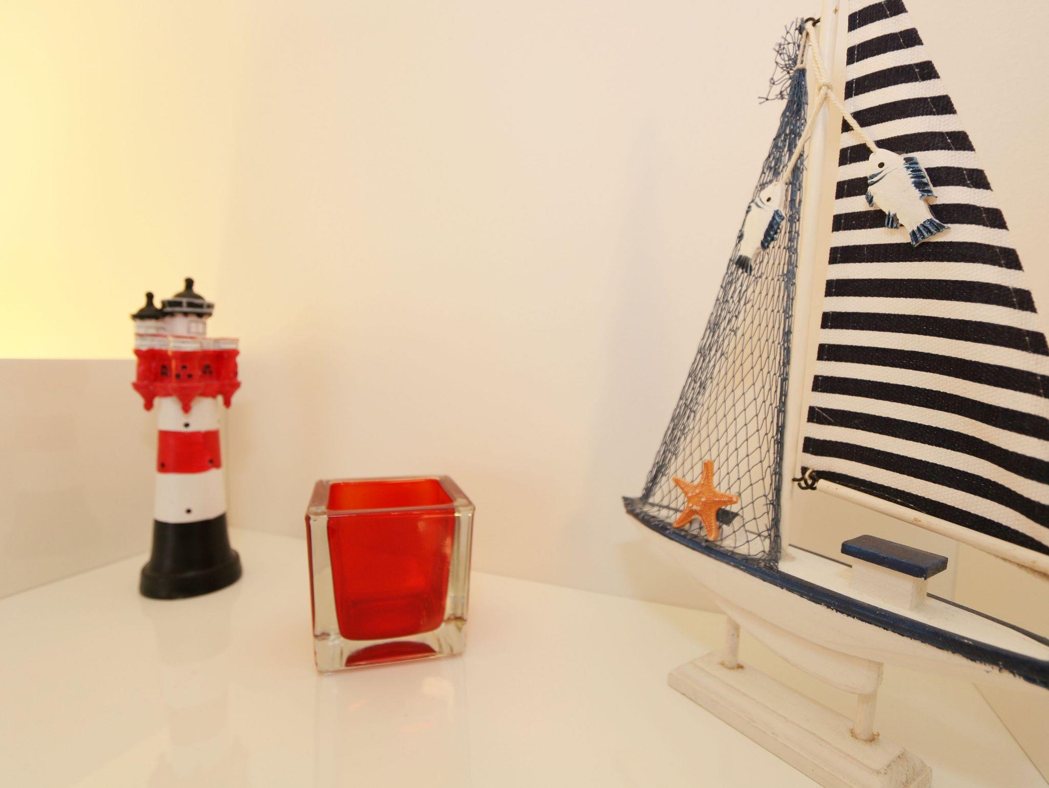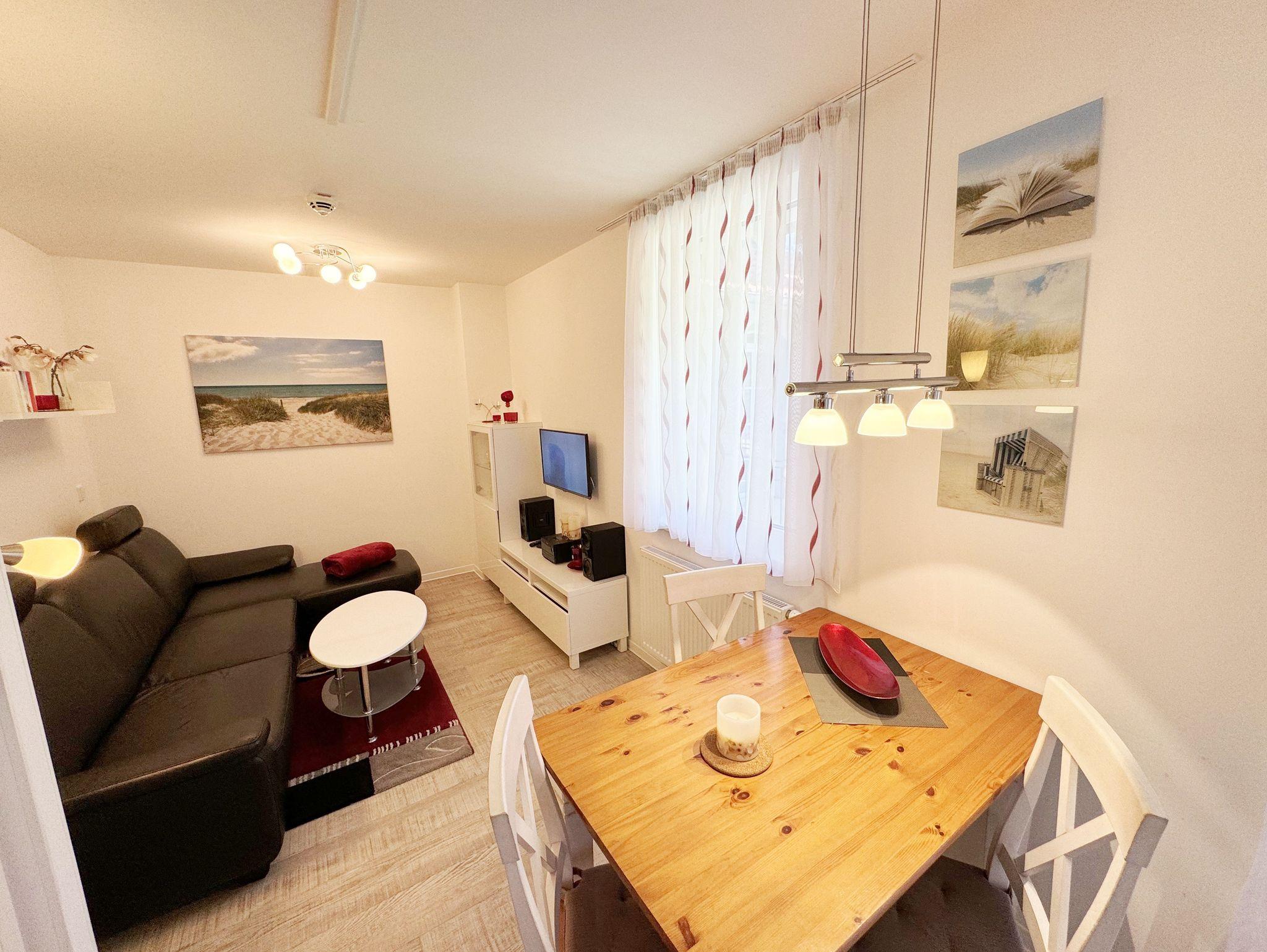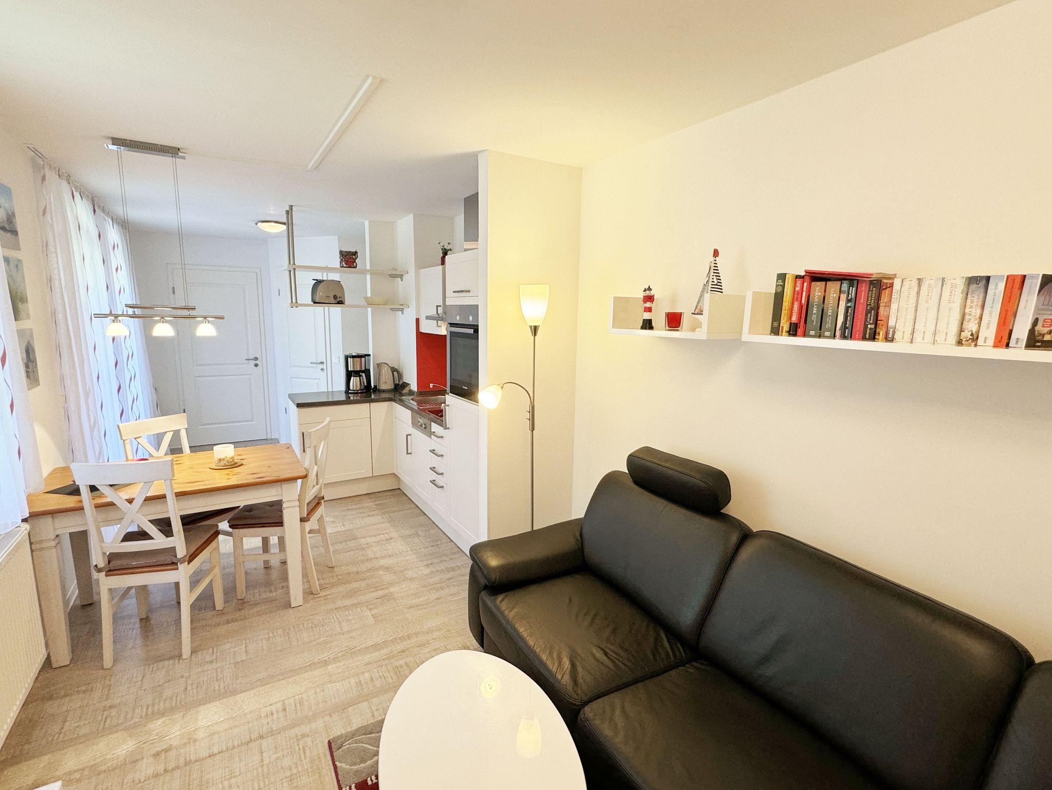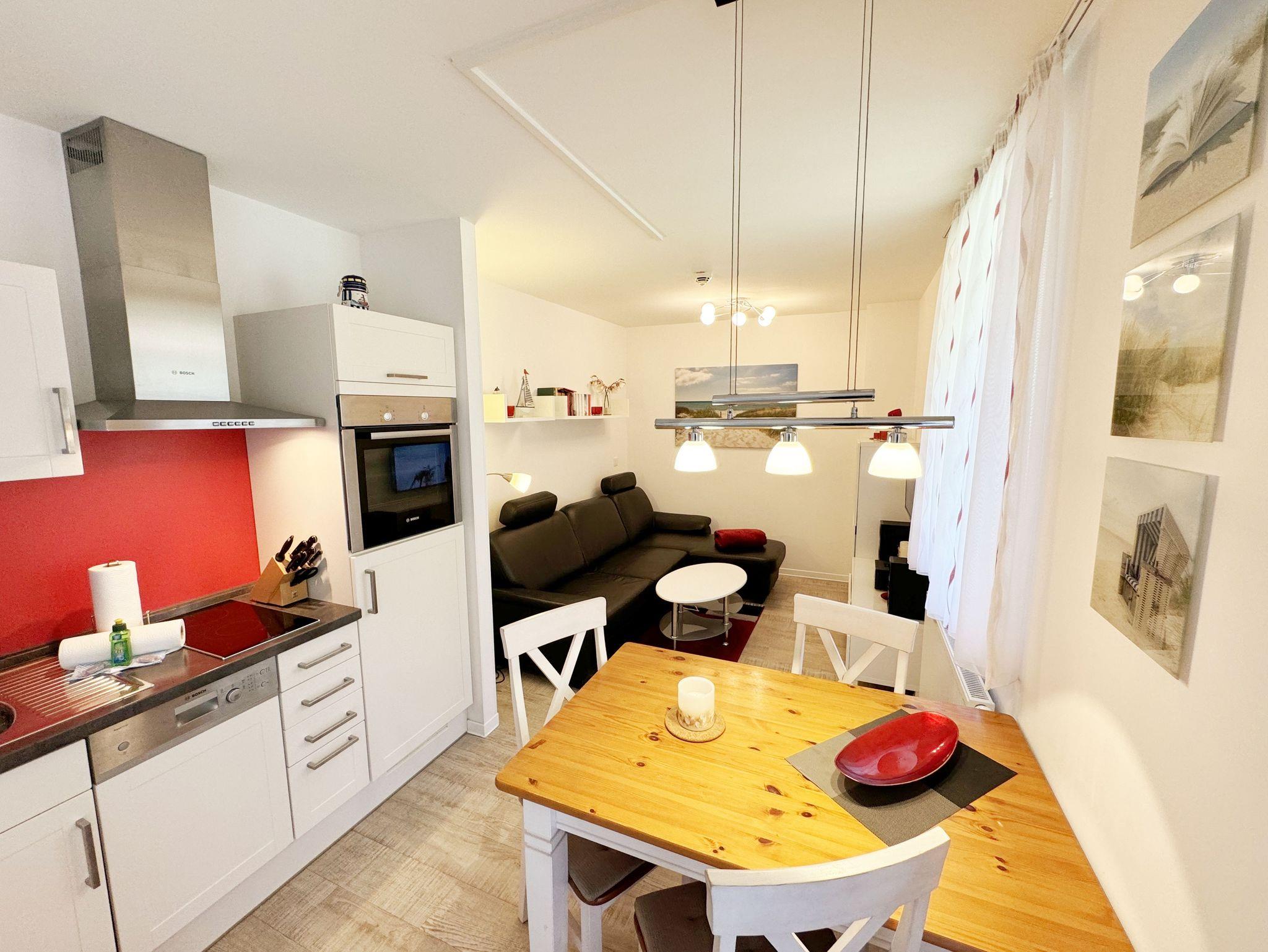 Ihre Nichtraucher-Ferienwohnung ist mit viel Liebe zum Detail ausgestattet und eingerichtet worden. Sie wohnen in einer ca. 42 qm 2-Zimmer Wohnung, die für max. 2 Personen ausgelegt ist. Die Wohnung A.2.23 befindet sich in der 2. Etage und ist per Fahrstuhl von der Tiefgarage bequem zu erreichen. In der Wohnung finden Sie einen kombinierten Wohn/Koch- und Essbereich. Die integrierte Küchenzeile lässt mit Backofen, 2 Zonen-Ceranfeld, Spülmaschine, Kühlschrank mit Gefrierfach, Kaffeemaschine, Wasserkocher, Toaster und anderen praktischen Kochutensilien keine Wünsche offen. Im Wohnbereich befindet sich eine Essecke, eine gemütliche Couch, LCD-TV, DVD-Player und eine Musikanlage mit USB und IPhone/IPod Dock Station sind vorhanden. Auch auf einen Internetanschluss (WLAN) müssen Sie im Urlaub nicht verzichten. Dieser ist für Sie inklusive! Der große Balkon ist vom Wohn/Essbereich begehbar und möbliert. Das Schlafzimmer ist mit einem Doppelbett (1,80m x 2,00m), verstellbare Lattenroste, Nachttischkonsolen, einem Kleiderschrank und einem weiteren Flachbild-TV ausgestattet. Das Bad verfügt über eine ebenerdige Dusche, Waschbecken, WC, Handtuchheizkörper sowie einen Fön. Ein kleiner Abstellraum gehört zur Wohnung dazu. Hier finden untereinander Reinigungsutensilien sowie einen Wäscheständer. 1 kleiner Hund (keine Katzen) ist gegen eine Gebühr ein gern gesehener Gast. Ein eigener PKW-Stellplatz (Nr. 105, Einfahrtshöhe 2,00m) befindet sich in der Tiefgarage des Hauses. Im Keller des Hauses haben Sie die Möglichkeit eine Waschmaschine/Trockner gegen Gebühr zu nutzen. Mit dem Fahrstuhl des Hauses A gelangen sie in das Untergeschoss der Meeresblickanlage, wo Sie ein großzügiger und heller Wellnessbereich erwartet. Hier können sie in einem Pool kleine Bahnen schwimmen, in 2 Saunen Ihren Kreislauf in Schwung bringen, in einem dazugehörigen Ruheraum Ihren Körper wieder beruhigen, in einer Schneckendusche sowie weiteren Duschen das kühle Nass genießen und auf einer Außenterrasse mit Außendusche die frische Luft einatmen. Die Erstausstattung eines Wäschepaketes (komplette Bettwäsche, 1 Duschhandtuch, 2 kleine Handtücher) können Sie bis 14 Tage vor Anreise gegen einen Aufpreis dazu buchen oder durch eigene ergänzen. Ab 2 gebuchten Paketen erhalten Sie einmalig 1 Geschirrhandtuch und 1 Duschvorleger hinzu.