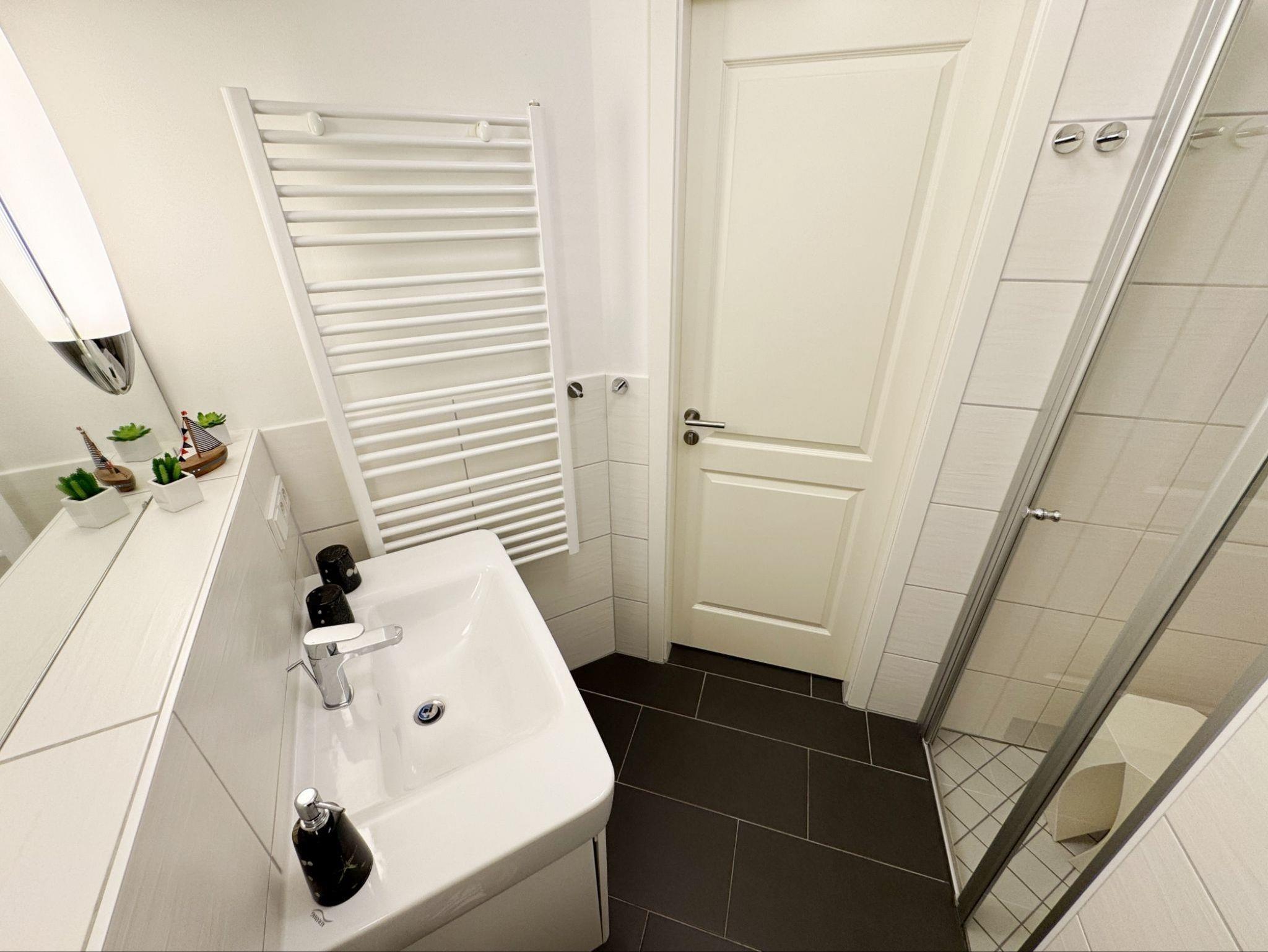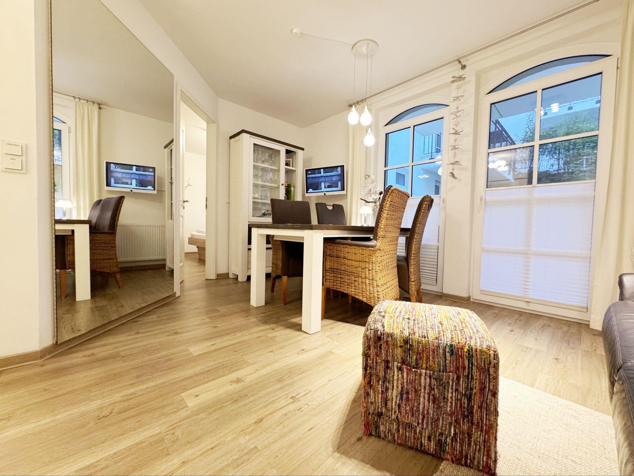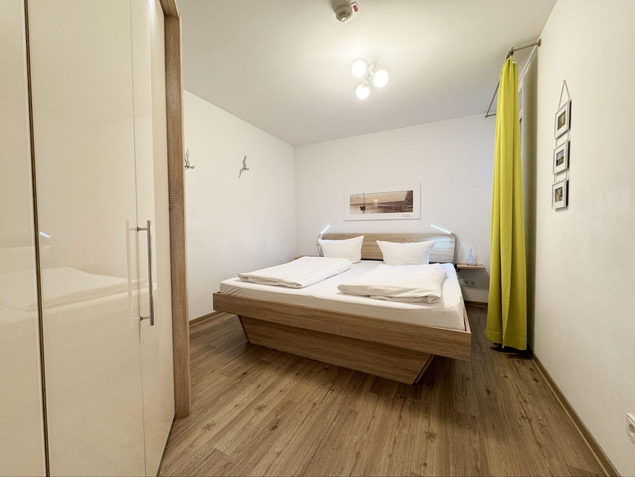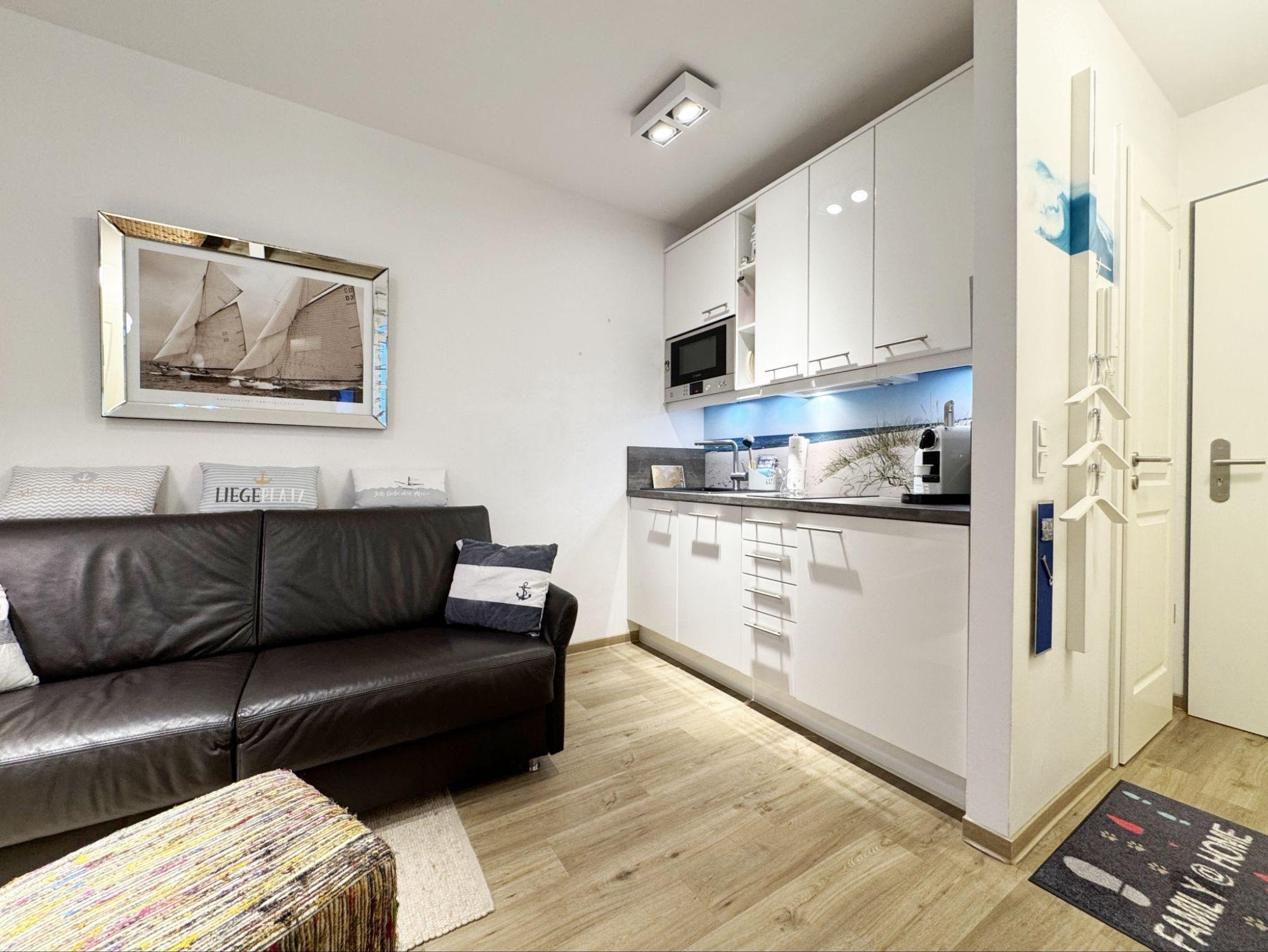 Willkommen in der geschmackvollen Ferienwohnung „Dinghy“ im Haus Meeresblick, einer Nichtraucher Ferienwohnung in Strandnähe, die ideal für einen komfortablen Aufenthalt bis zu max. 2 Personen geeignet ist. Die Erdgeschosswohnung bietet Ihnen eine Wohnfläche von ca. 41 qm und zeichnet sich durch eine durchdachte Raumaufteilung und moderne Ausstattung aus. Der Wohnbereich ist optimal ausgestattet. Hier finden Sie einen großzügigen Esstisch, zwei Vitrinen im Landhausstil, sowie eine Couch, ein Beistelltisch, eine Leselampe und einen Flachbild-TV mit integriertem Internetradio. Für den perfekten Sound sorgt das Panasonic iPhone 5, iPad, iPod Micro System, das Bluetooth, CD, USB und FM-Radio unterstützt. Der technische Bereich wird durch einen WLAN-Anschluss abgerundet. Ein Highlight der Wohnung ist die möblierte Terrasse (West), welche Sie vom Wohnbereich durch eine Insektenschutztür erreichen welche Ihnen zusätzlichen Außenraum bietet. Die angrenzende Pantry-Küchenzeile ist mit modernen Geräten ausgestattet, darunter eine Spülmaschine, ein Kühlschrank mit Gefrierfach des gleichen Herstellers. Weitere Küchengeräte wie ein Handmixer, ein Toaster, eine Mikrowelle mit Grill, eine Kaffeemaschine, eine De Longhi Nespresso-Maschine und ein Wasserkocher stehen zur Verfügung. Die beleuchtete Küchenzeile - mit integriertem Dunstabzug und 2 Zonen Cerankochfeld - sorgt für eine angenehme Atmosphäre beim Kochen. Das Schlafzimmer bietet einen komfortablen Rückzugsort mit einem LED-TV und einem stufenlos beheizbaren Wasserbett (2,00m x 2,10m), das aus zwei Kammern besteht sowie Nachttischablagen mit Beleuchtung. Ein großer Kleiderschrank mit drei Schubladen bietet ausreichend Stauraum, während ein Tresor im Schrank für zusätzlichen Schutz Ihrer Wertsachen sorgt. Ein Bücherregal, ein Insektenschutzgitter und eine Verdunklungsmöglichkeit komplettieren den Raum. Das innenliegende Badezimmer ist mit einem ebenerdigen Duschbad ausgestattet, das eine Sitzgelegenheit bietet. Ein großer Waschtisch, ein Kosmetikspiegel, sowie ein Föhn, ein WC und ein Handtuchhalter komplettieren die Ausstattung. Im kleinen Abstellraum befinden sich Reinigungsutensilien, eine Garderobe sowie ein Wäscheständer. Haustiere sind nicht erlaubt. Im Keller des Hauses haben Sie die Möglichkeit eine Waschmaschine/Trockner gegen Gebühr zu nutzen. Mit dem Fahrstuhl des Hauses A gelangen sie in das Untergeschoss der Meeresblickanlage, wo Sie ein großzügiger und heller Wellnessbereich erwartet. Hier können sie in einem Pool kleine Bahnen schwimmen, in 2 Saunen Ihren Kreislauf in Schwung bringen, in einem dazugehörigen Ruheraum Ihren Körper wieder beruhigen, in einer Schneckendusche sowie weiteren Duschen das kühle Nass genießen und auf einer Außenterrasse mit Außendusche die frische Luft einatmen. Ein PKW-Stellplatz (Nr. 63, Einfahrtshöhe 2,00m) ist für Sie in der Tiefgarage reserviert. Die Erstausstattung eines Wäschepaketes (komplette Bettwäsche, 1 Duschhandtuch, 2 kleine Handtücher) können Sie bis 14 Tage vor Anreise gegen einen Aufpreis dazu buchen oder durch eigene ergänzen. Ab 2 gebuchten Paketen erhalten Sie einmalig 1 Geschirrhandtuch und 1 Duschvorleger hinzu.