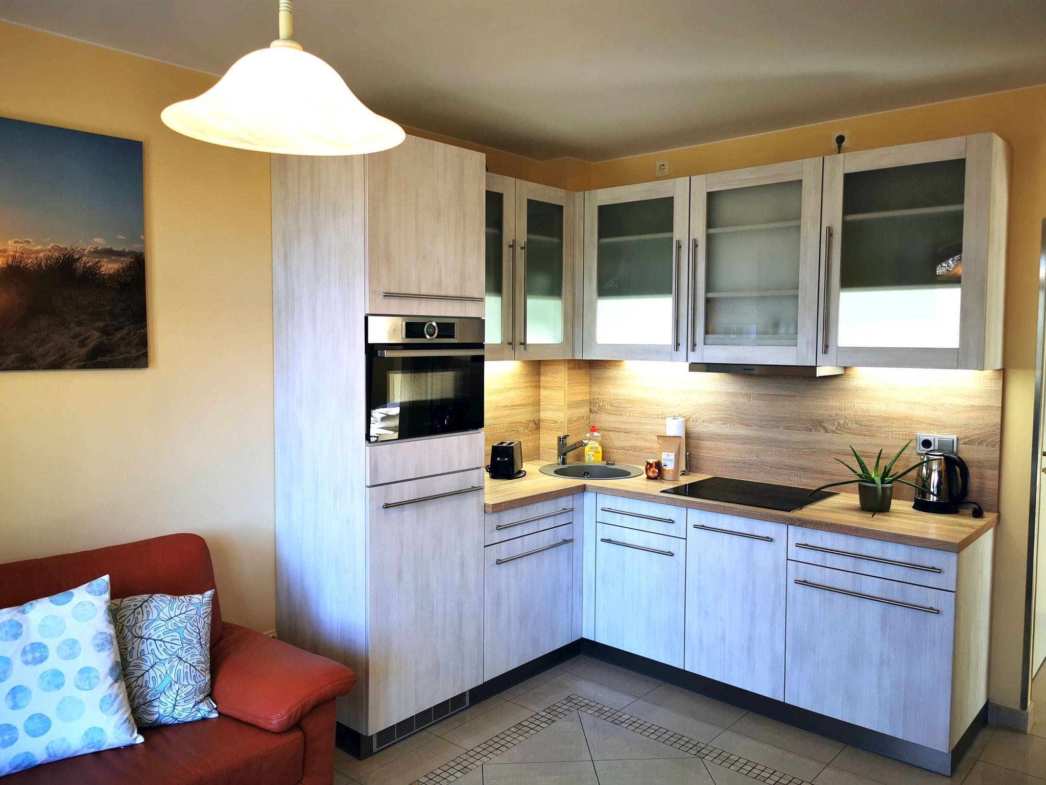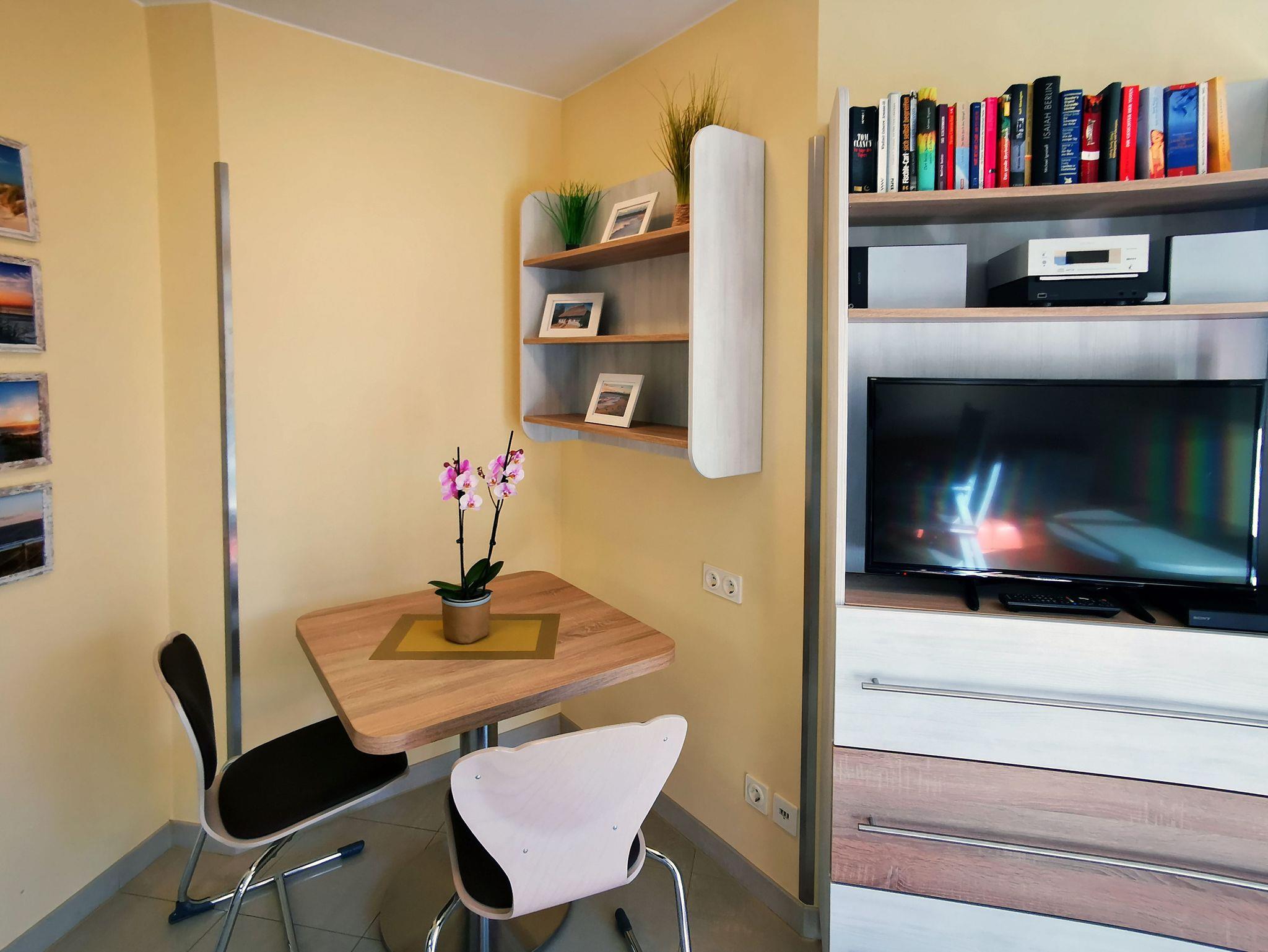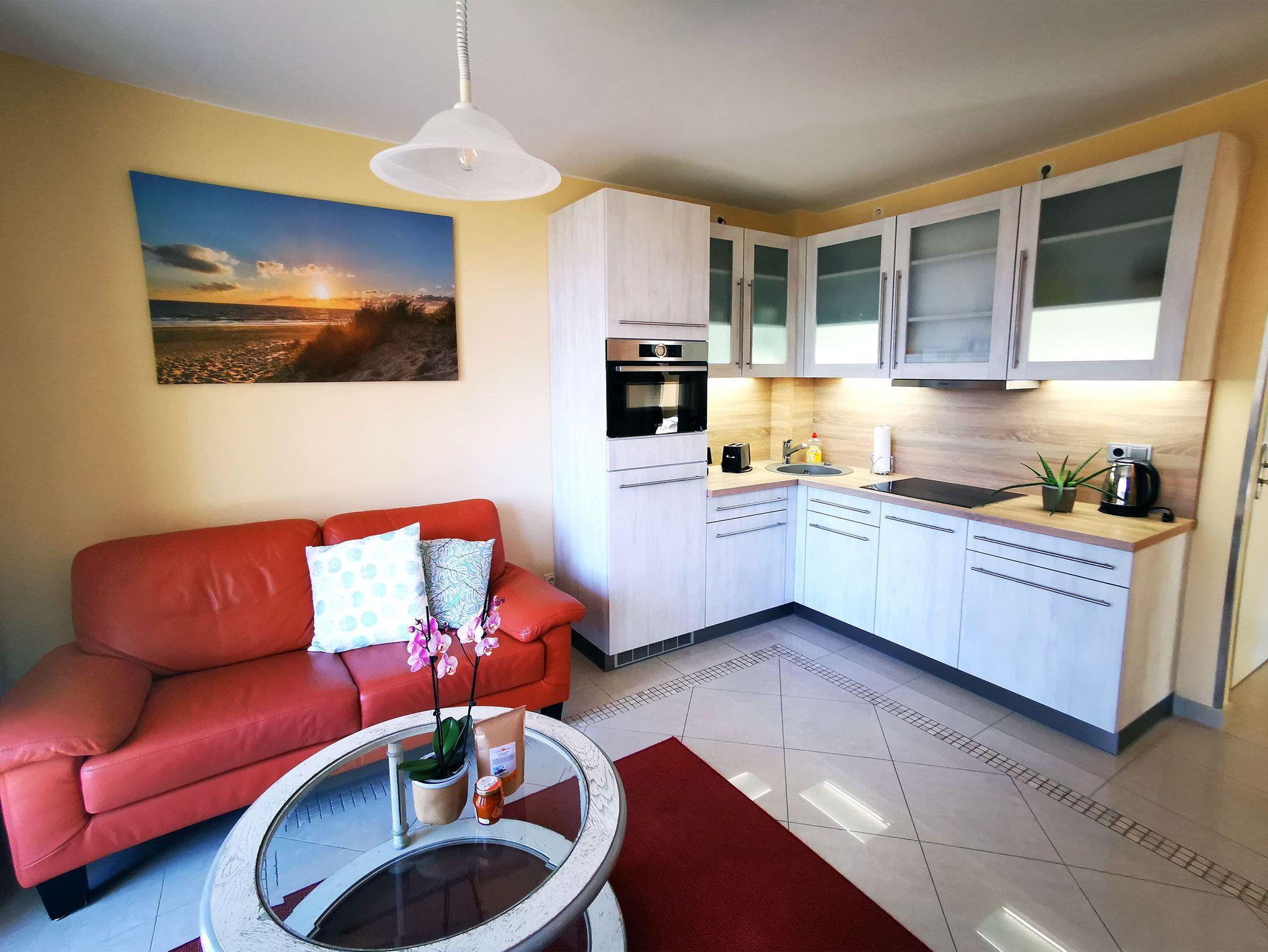 In dieser hellen 2-Zimmer-Ferienwohnung für 2 Personen in traumhafter Lage lässt sich Ihr Urlaub bestens genießen. Das Wohn-/Esszimmer verfügt sowohl über einen Essbereich als auch einen gemütlichen Wohnbereich mit Sofa, Sessel und Fernseher. Eine Minibibliothek, ein DVD-Player und ein Mini-Stereo-System sind ebenfalls vorhanden. Die integrierte Küchenzeile ist modern ausgestattet mit Ceranfeld, Kühlschrank, Geschirrspülmaschine, Mikrowelle, Wasserkocher, Kaffeemaschine und Toaster. Aufgrund der Fensterfront ist dieses Zimmer herrlich hell. In dem Schlafzimmer befindet sich ein Doppelbett und ein großer Kleiderschrank. Genießen Sie das Meeresrauschen auf dem südlich ausgerichteten Balkon.