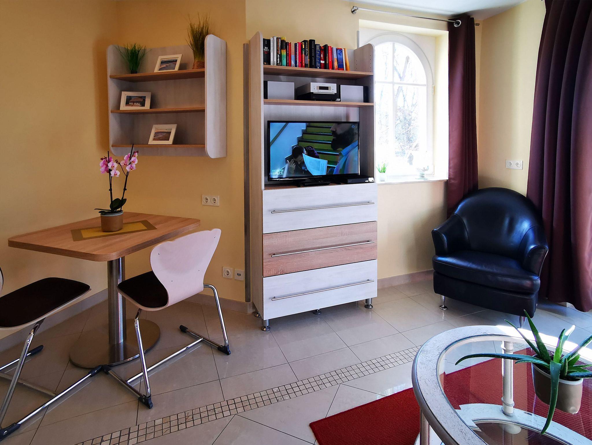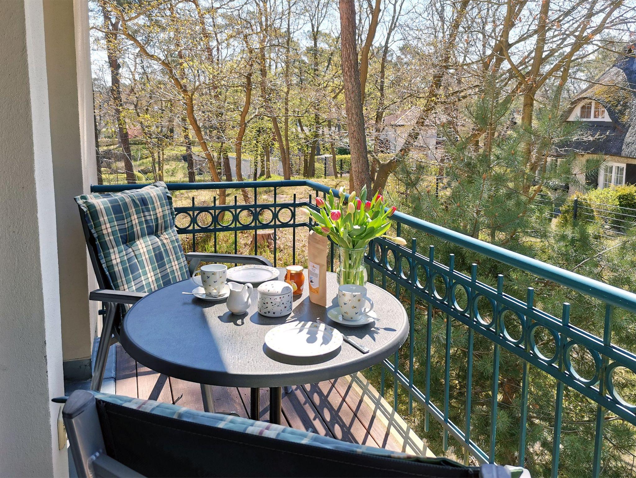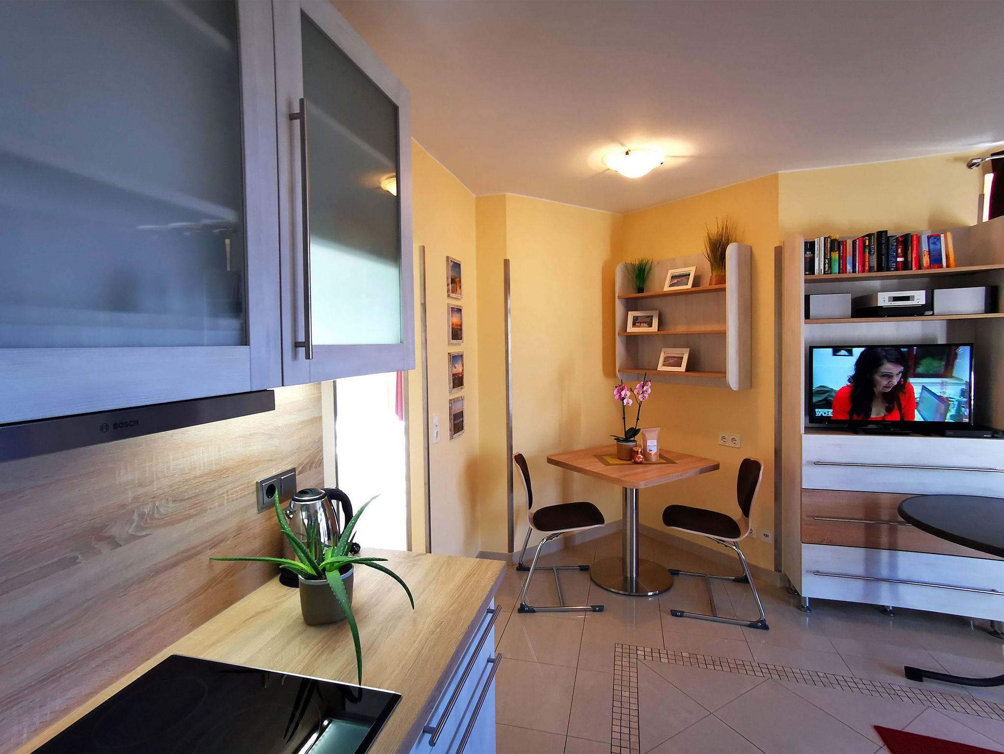 In dieser hellen 2-Zimmer-Ferienwohnung für 2 Personen in traumhafter Lage lässt sich Ihr Urlaub bestens genießen. Das Wohn-/Esszimmer verfügt sowohl über einen Essbereich als auch einen gemütlichen Wohnbereich mit Sofa, Sessel und Fernseher. Eine Minibibliothek, ein DVD-Player und ein Mini-Stereo-System sind ebenfalls vorhanden. Die integrierte Küchenzeile ist modern ausgestattet mit Ceranfeld, Kühlschrank, Geschirrspülmaschine, Mikrowelle, Wasserkocher, Kaffeemaschine und Toaster. Aufgrund der Fensterfront ist dieses Zimmer herrlich hell. In dem Schlafzimmer befindet sich ein Doppelbett und ein großer Kleiderschrank. Genießen Sie das Meeresrauschen auf dem südlich ausgerichteten Balkon.