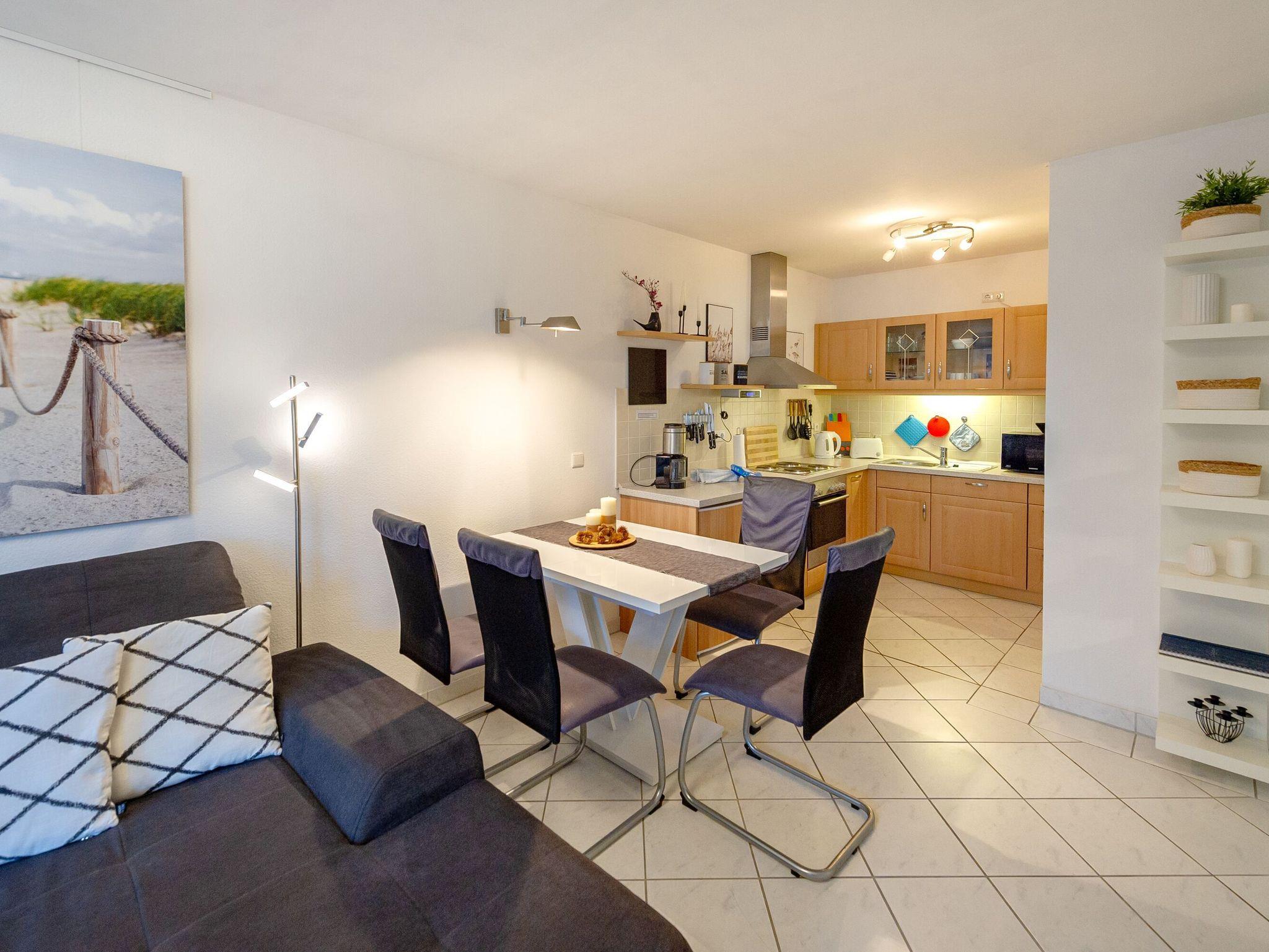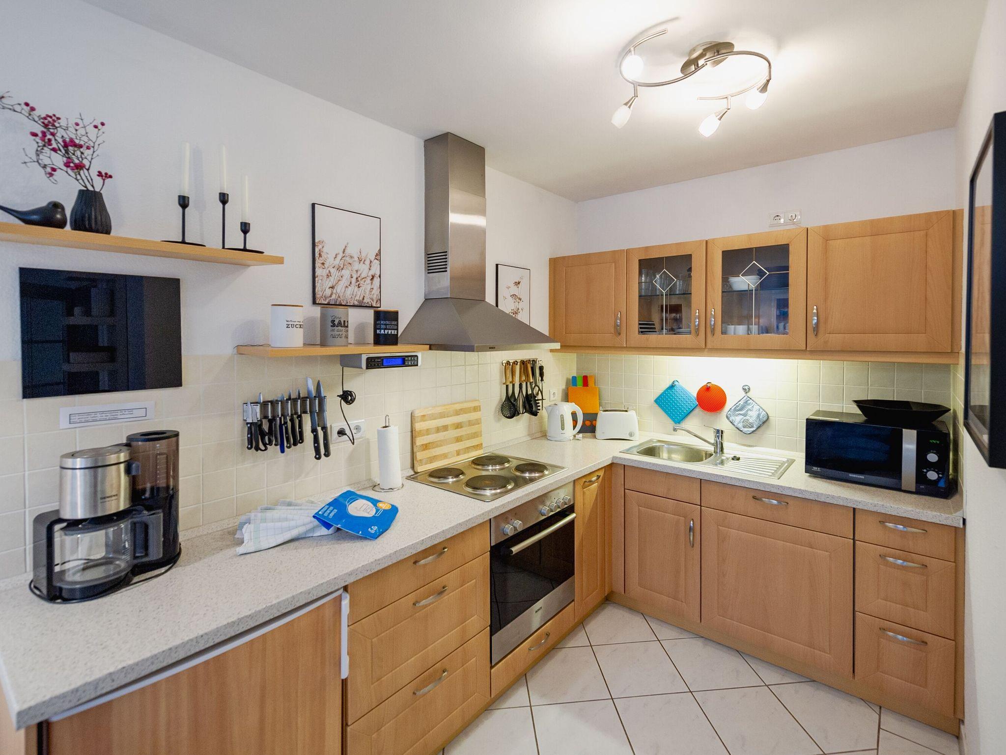 Geschickt in den Raum integriert wurde die Wohnküche nebst Esstisch für vier Personen. Energieeffiziente Einbaugeräte und alles nötige Kleininventar stehen Ihnen hier zur Verfügung, u.a. ein 4-Plattenherd mit Backofen und Abzugshaube, eine Mikrowelle, ein Kühlschrank mit Gefrierfach, ein Geschirrspüler sowie eine Kaffeemaschine, Wasserkocher, Toaster und ein Küchenradio.