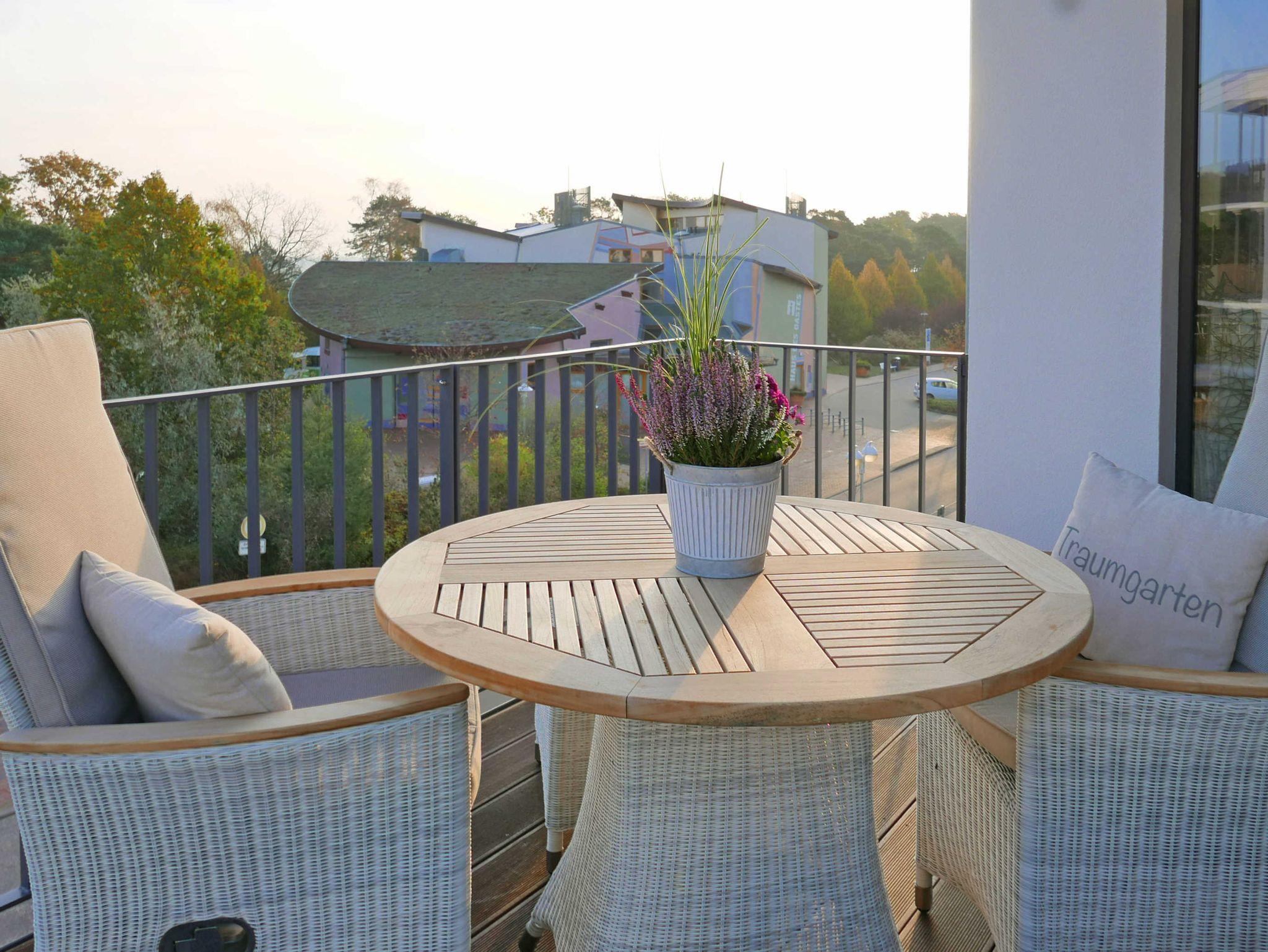 Der Balkon ist hochwertig mit Relaxseesseln und Hockern möbliert.