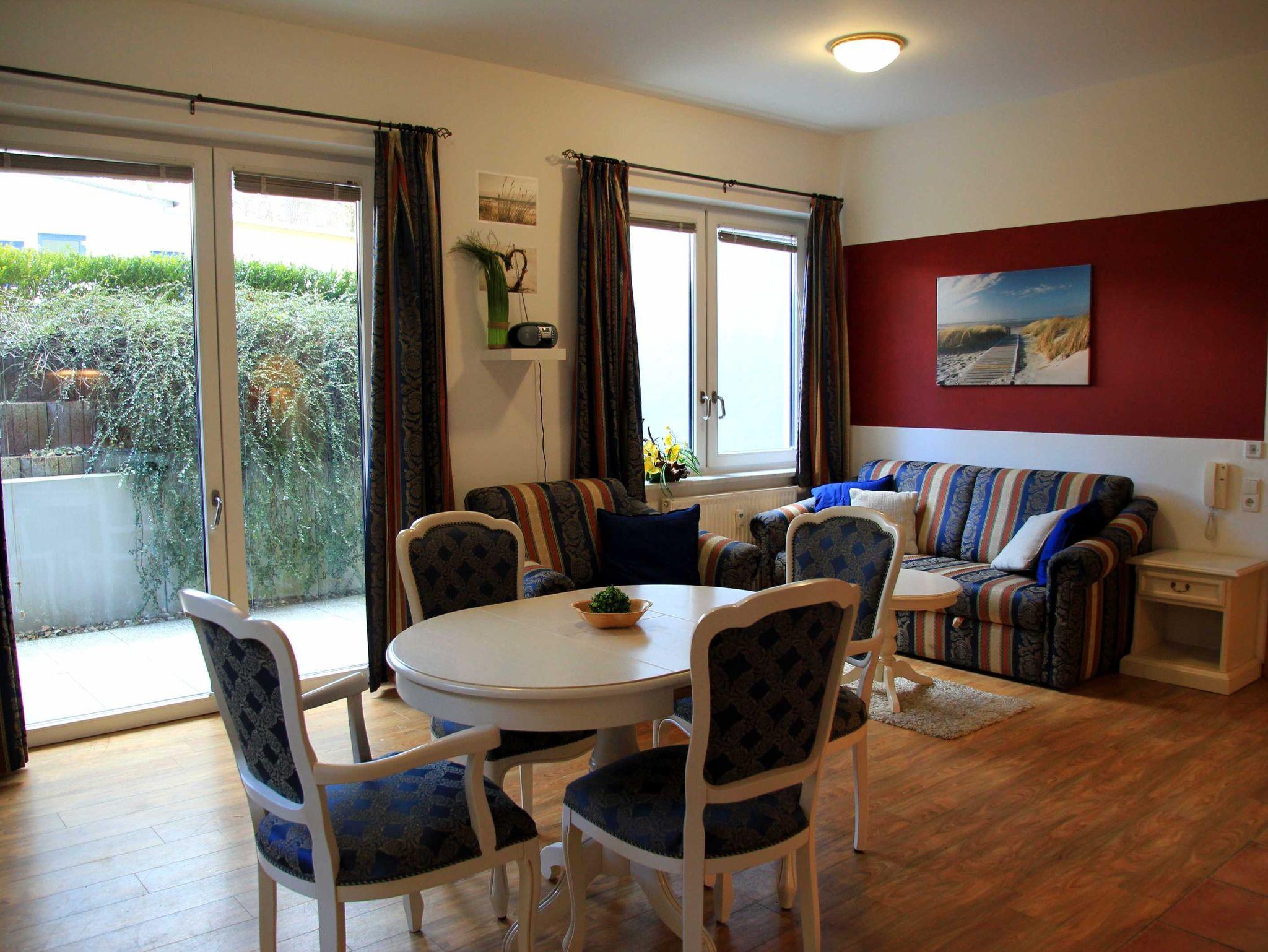 2-Zimmer Fewo für bis zu 4 Personen+Baby, rollstuhlgerecht mit Terrasse, kostenlosem WLan, Küchenzeile, Waschmaschine, TV Flatscreen und kostenfreiem KFZ-Stellplatz, 150m zum Strand.