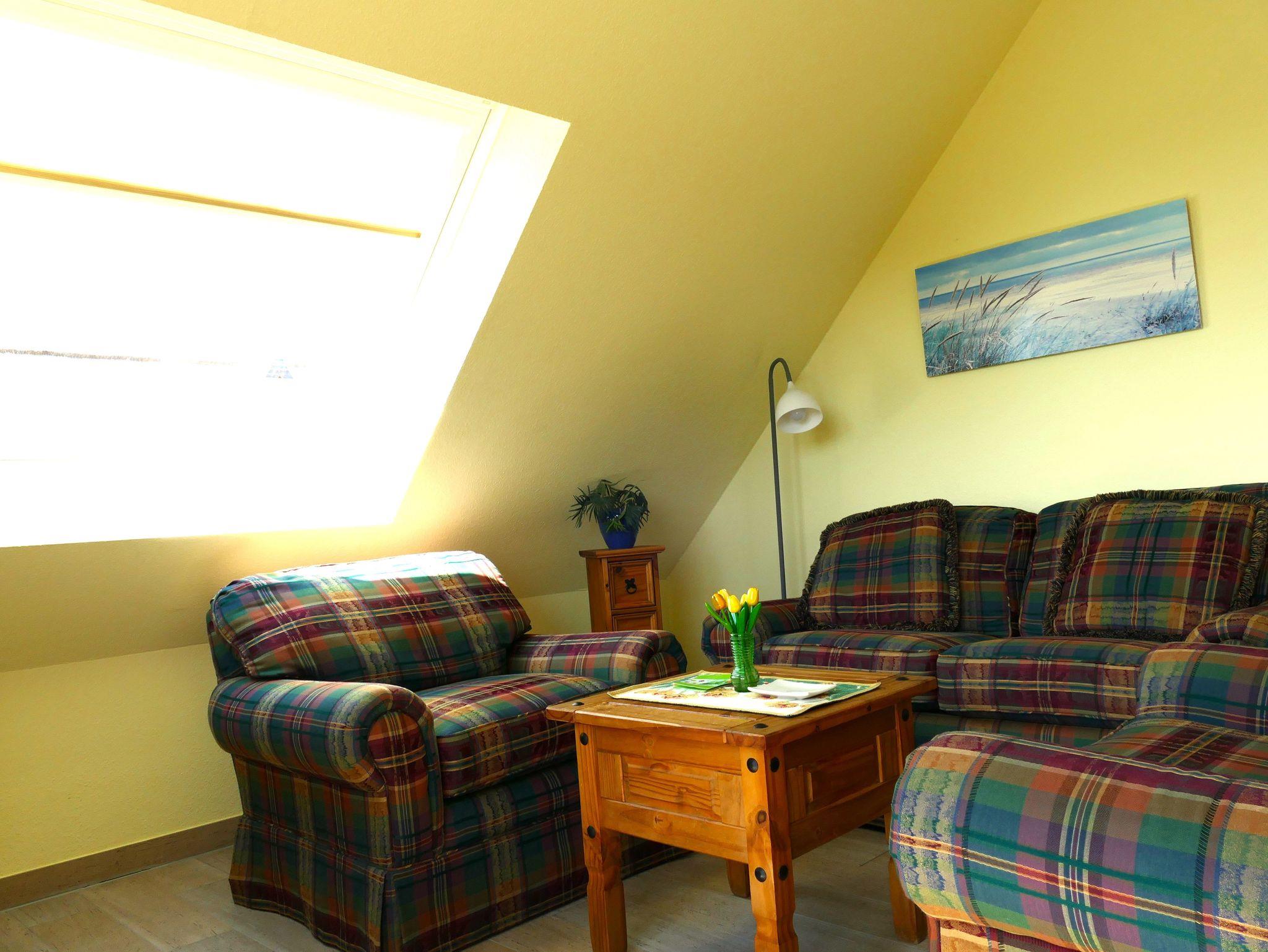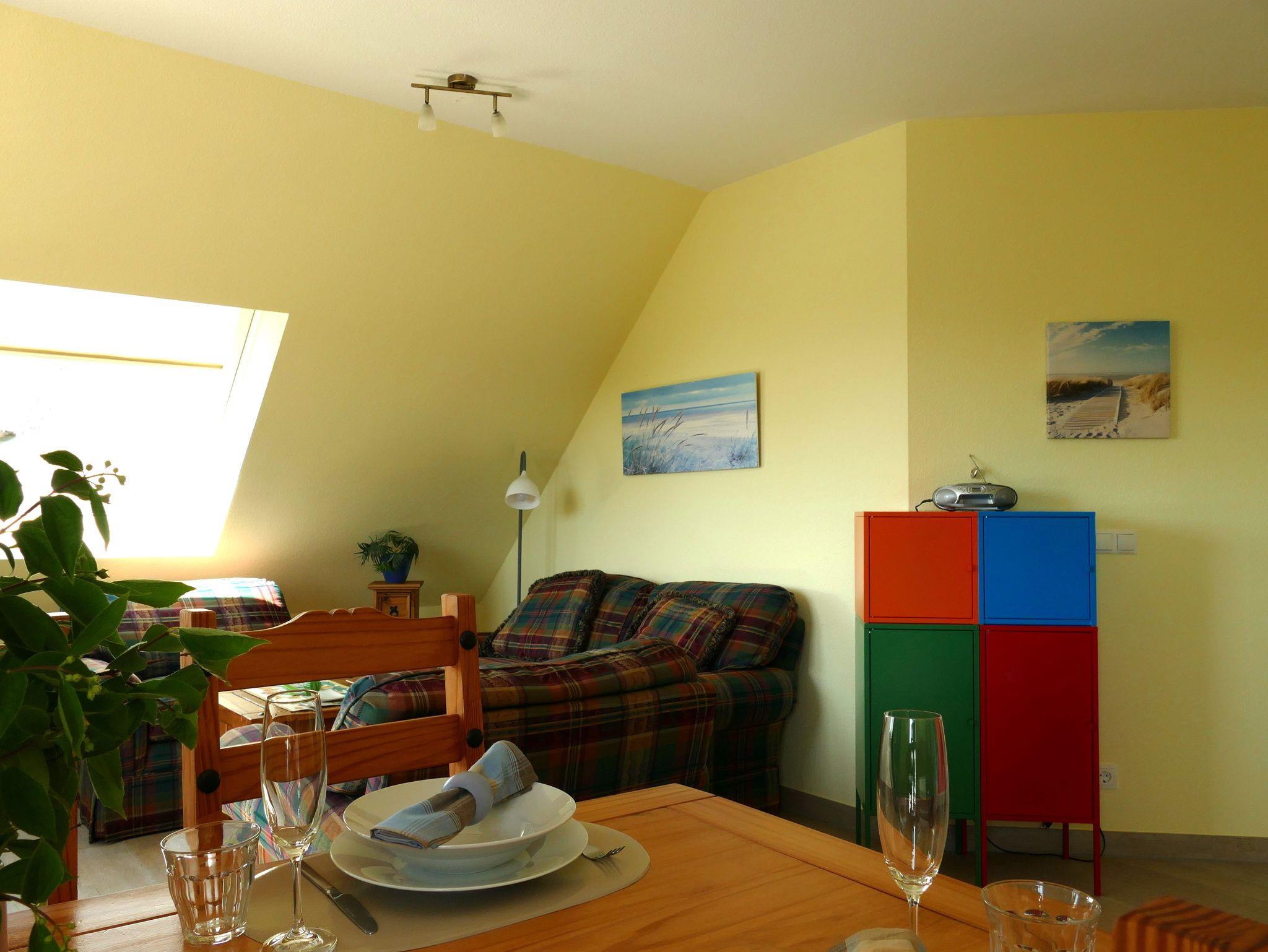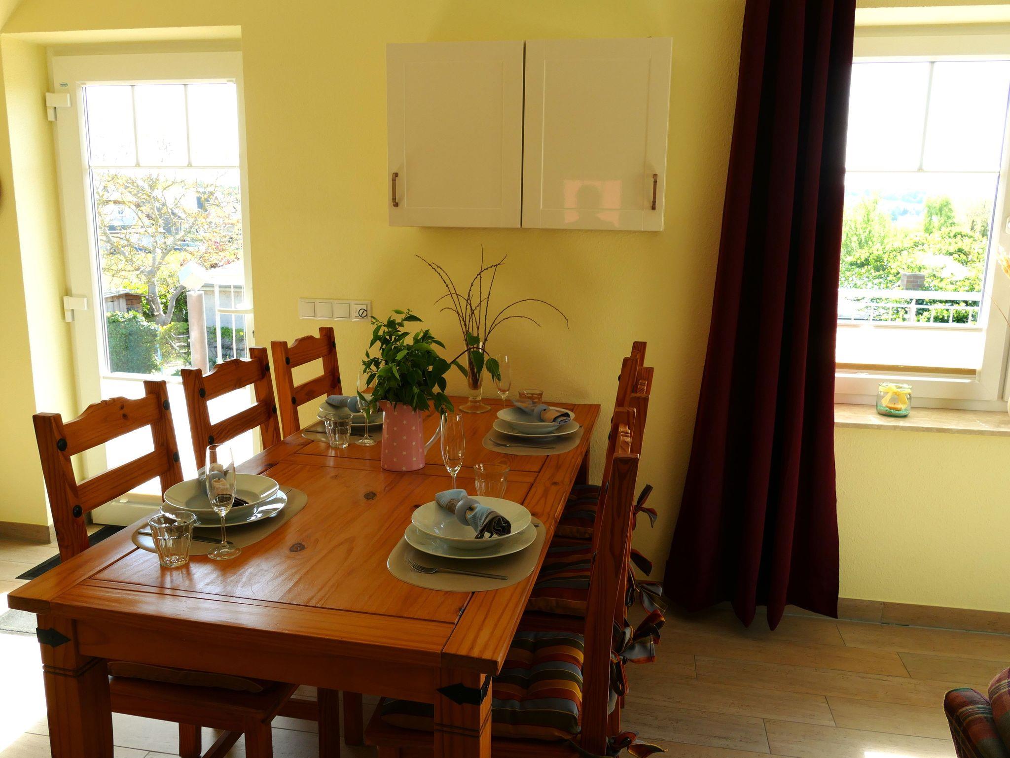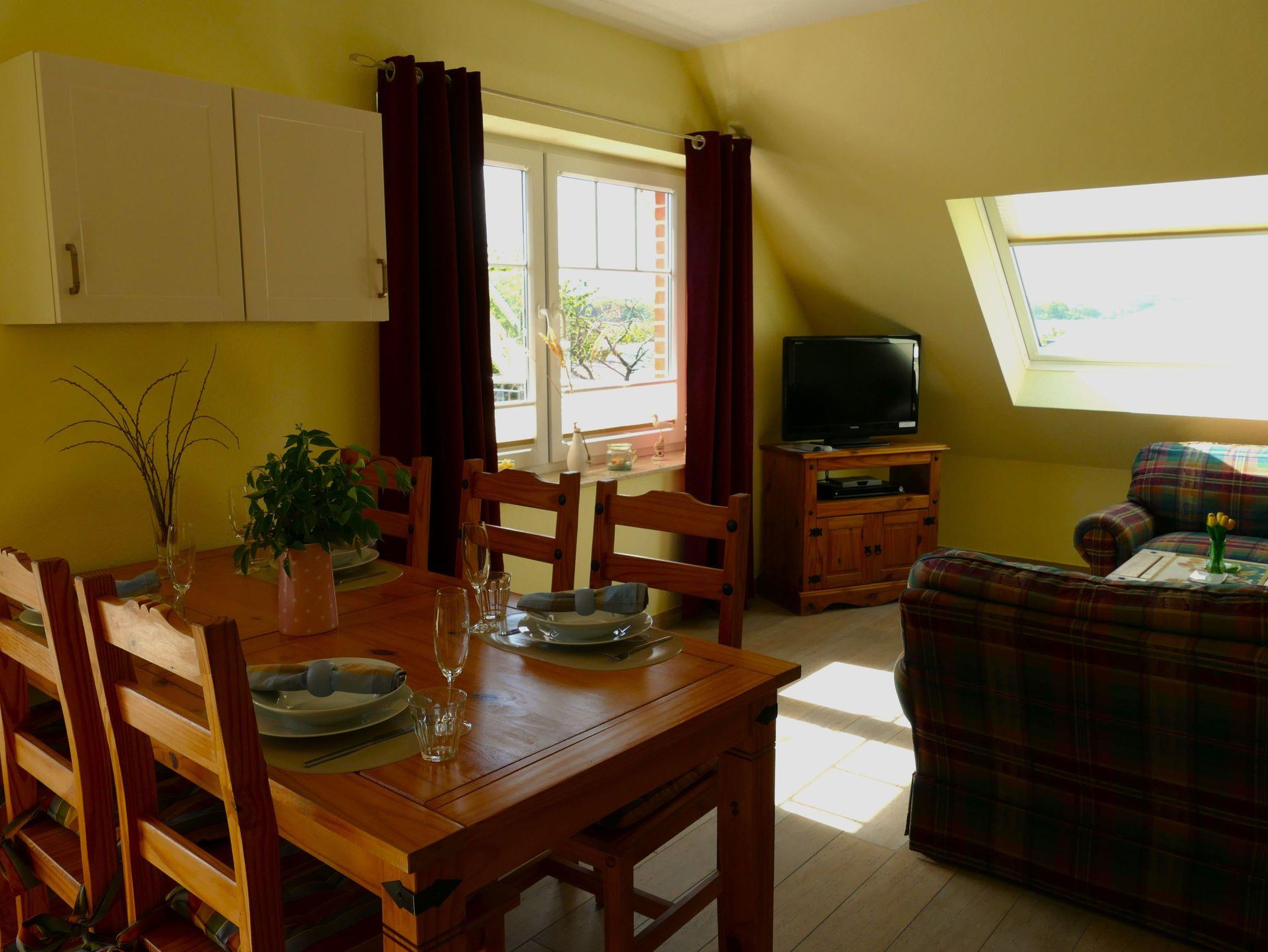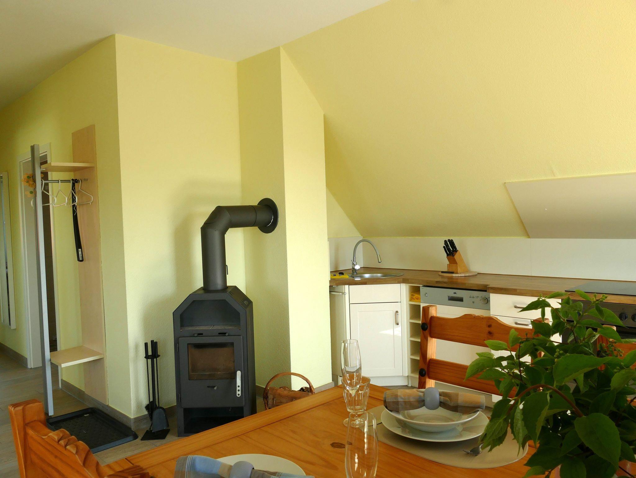 Empfangen werden Sie im geräumigen Wohn- und Essbereich der Ferienwohnung, der mit einem Kamin (Holz inklusive/kostenlos), einer gemütlichen Sitzgruppe sowie einem Esstisch für 6 Personen zum Verweilen einlädt. Der Fernseher mit DVD-Player, Radio, W-LAN (kostenlos) sowie Bücher und Spiele sorgen für exklusiven Wohnkomfort und gemütliche Abende. Aber auch der Blick aus dem übergroßen Schrägfenster auf den Selliner See mit seinen Segel- und Ruderbooten regt zum Beobachten und Träumen an.