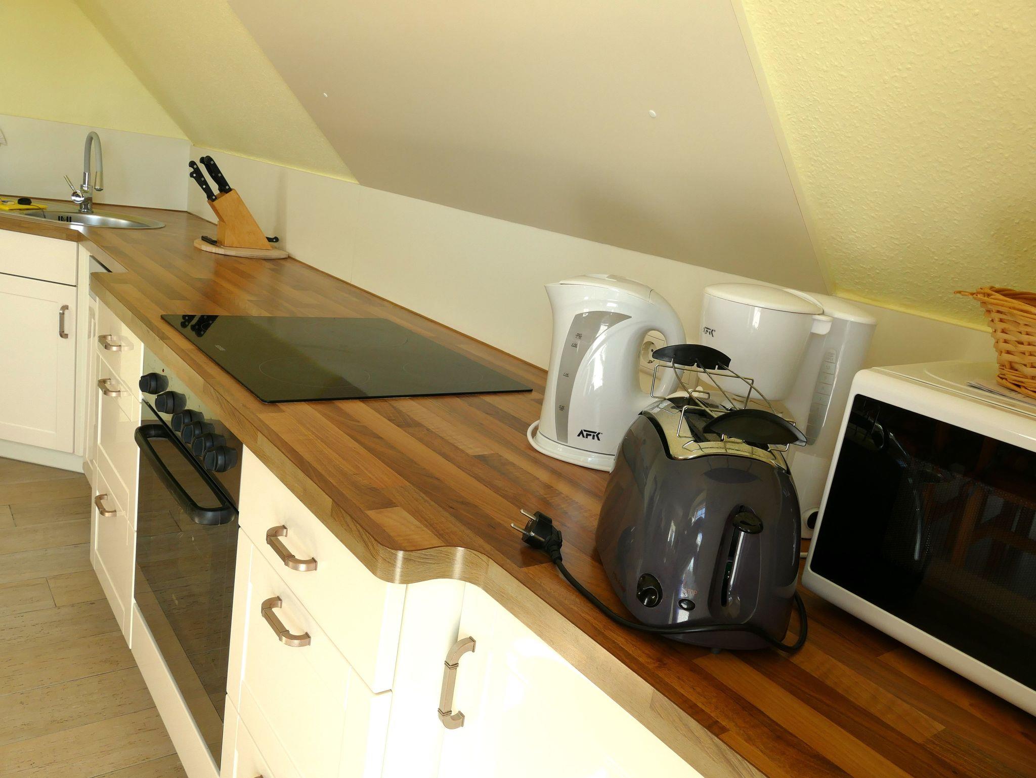 Ebenfalls finden Sie eine sehr gut ausgestattete Küchenzeile mit Spülmaschine, Backofen, 4-Platten-Cereanfeld, Mikrowelle, Kühlschrank mit Gefrierfach, Toaster, Kaffeemaschine, Wasserkocher und diverse Küchenutensilien vor.