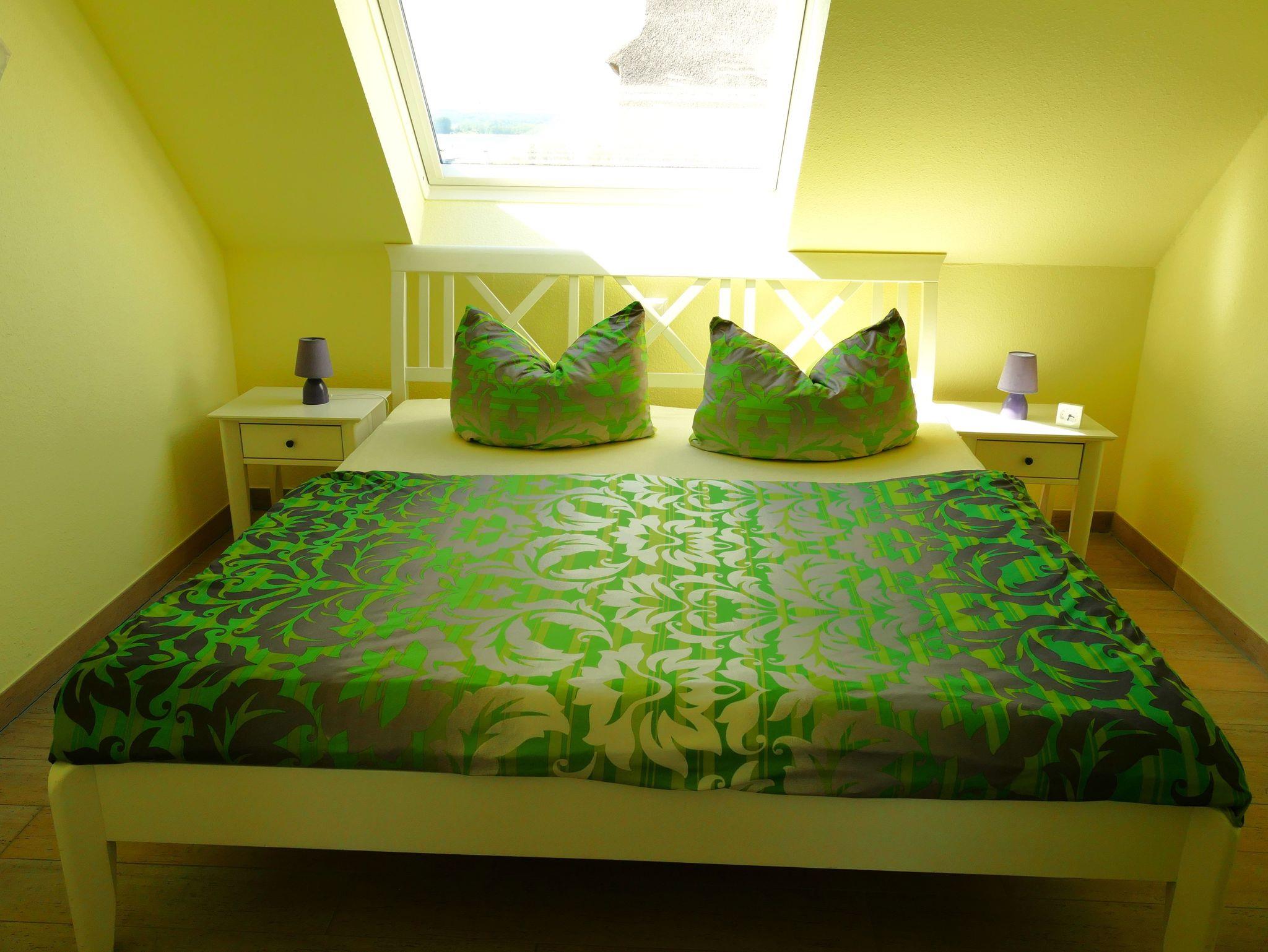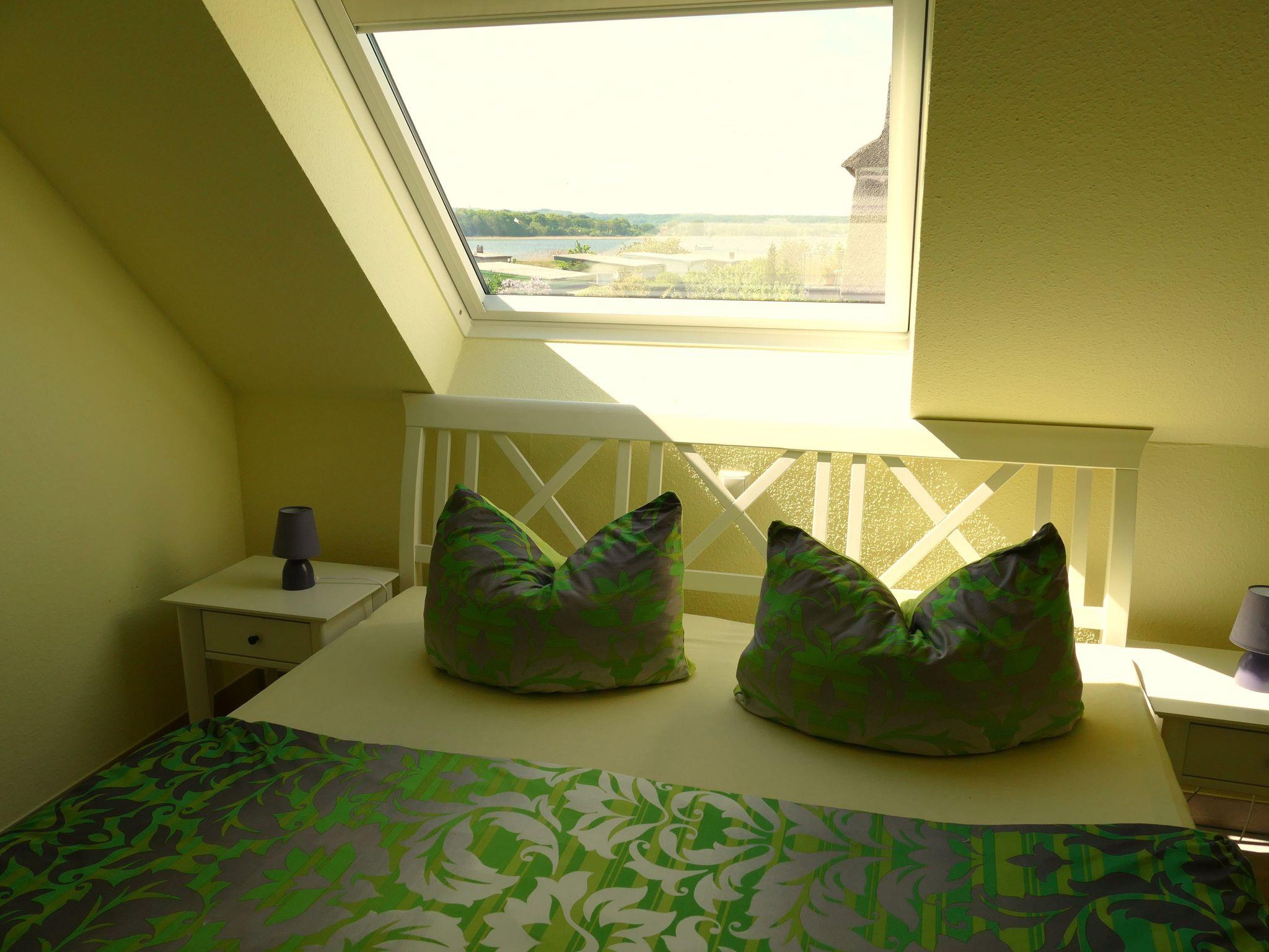 Das 1. Schlafzimmer zeigt sich mit einem Doppelbett mit verstellbaren Lattenrosten (1 x 1,80 m x 2,00 m und 1 x 1,80 m x 2,00 m), Nachtischanlagen, einem Kleiderschrank sowie einem kleinen Hocker, der zur Ablage Ihrer Kleidungsstücke dient. Der Blick durch das übergroße Schrägfenster lässt Ihren Blick ebenfalls über den Selliner See schweifen. Das Verdunklungsrollo schützt Sie vor der Helligkeit des Morgens und das Fliegengitter hält Insekten fern. Das 2. Schlafzimmer wirkt durch zwei Einzelbetten (0,90 m x 2,00 m), Nachtischanlage, einem Kleiderschrank, einem Kleiderständer, zwei Sessel mit einem kleinen Tisch, die Ihre Kleidungsstücke aufnehmen können sowie einen Schreibtisch mit Bestuhlung ganz besonders einladend. Hier verschließen Verdunklungsvorhänge das Eindringen der Sonne am frühen Morgen sowie die Fliegengitter das Eindringen von Insekten.