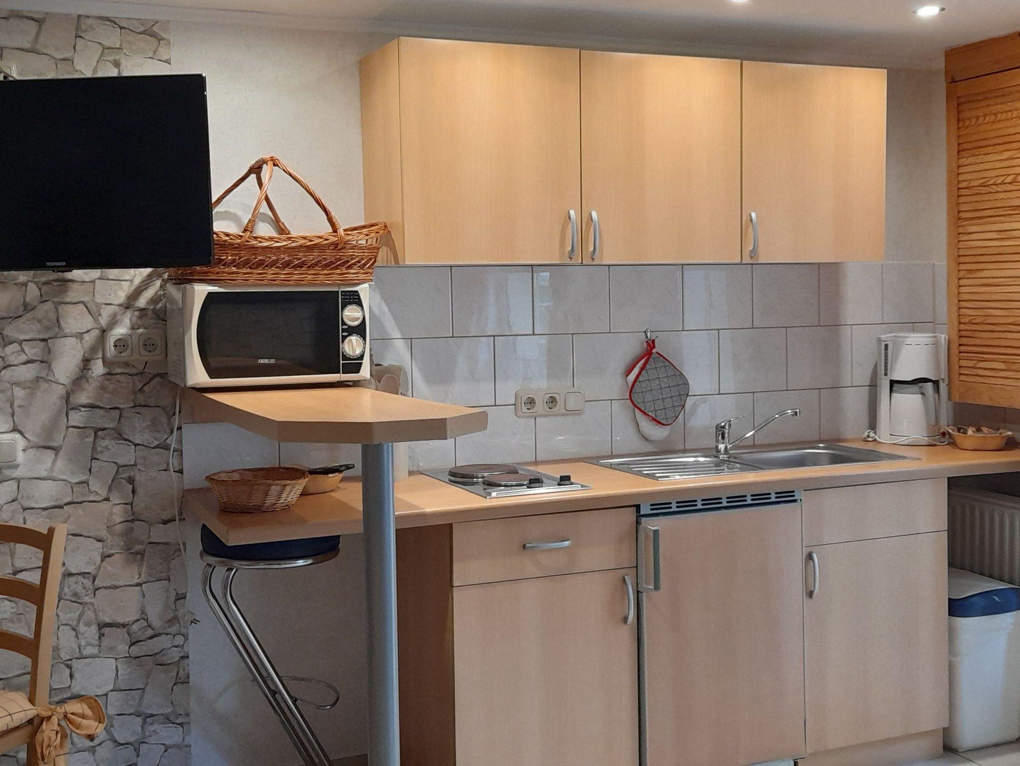 Miniküche mit Herd, Kühlschrank, Mikrowelle, Kaffemaschine, Toaster...,