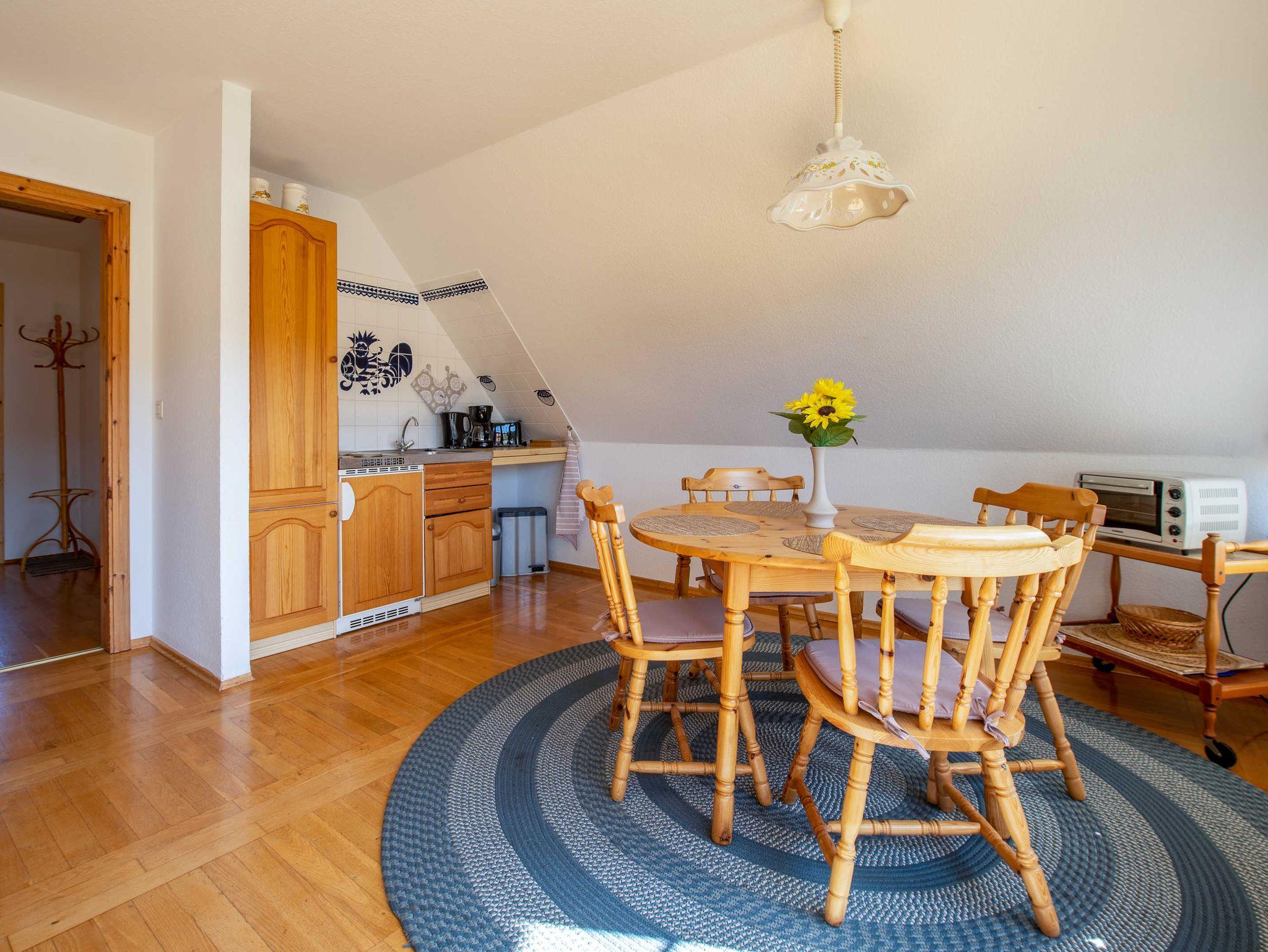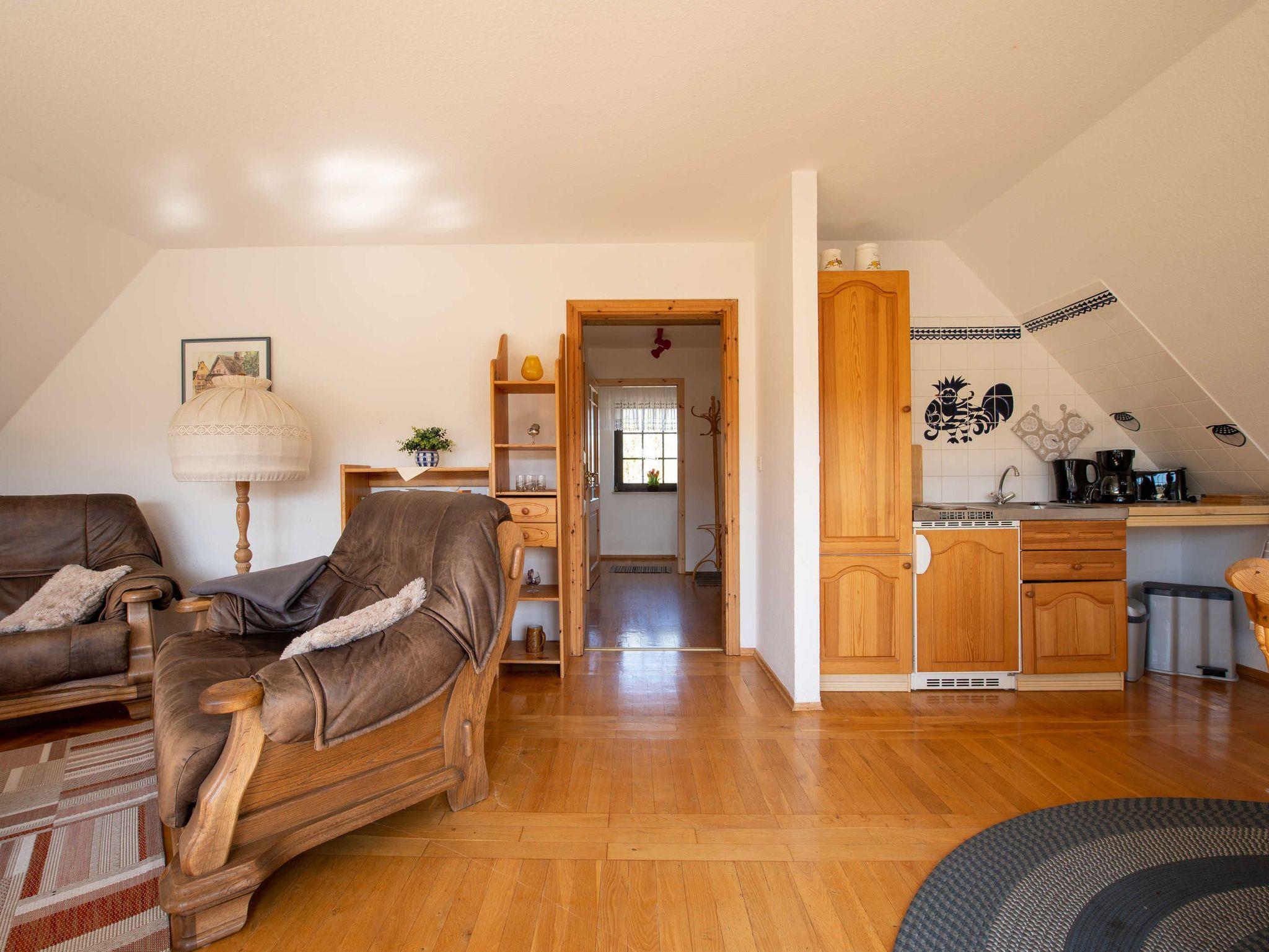 Die Wohnung ?Fernblick? befindet sich im Obergeschoss. Über eine separate Treppe gelangen sie in die ca. 47qm. große Wohnung, die ihnen hilft, Abstand vom Alltag zu gewinnen. Die gemütlich und praktisch eingerichtete Wohnung lädt sie zum Verweilen und Genießen ein. Die großen Fenster im offenen Wohn- und Essbereich lassen die Sonne hineinscheinen. Ein helles Schlafzimmer und ein geräumiges Duschbad runden diese Wohnung ab.