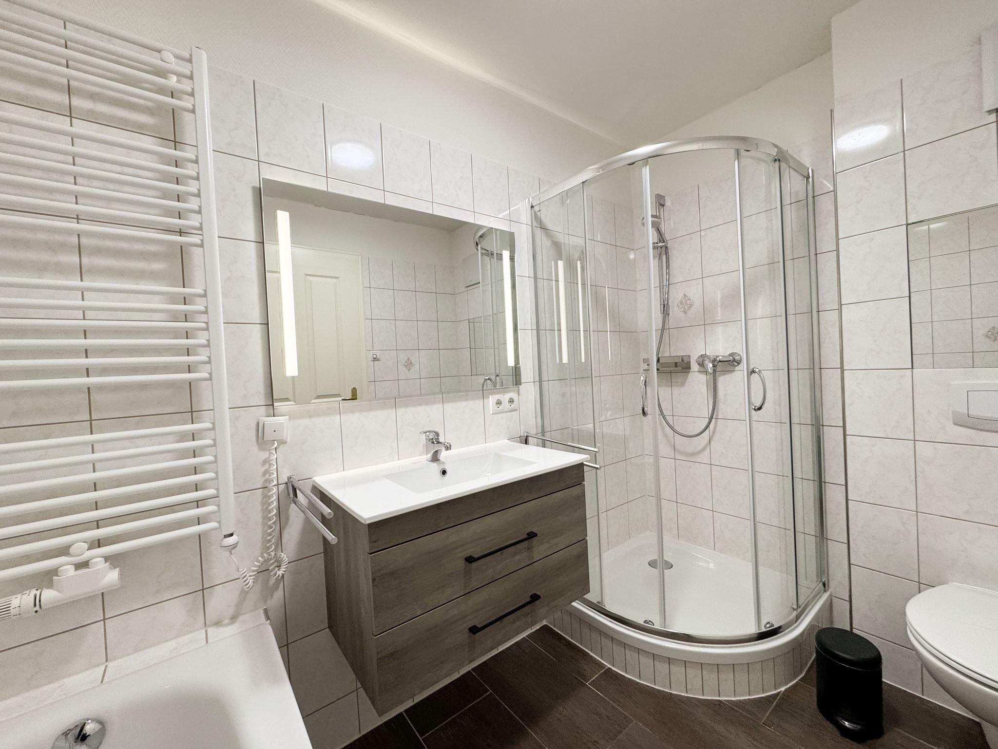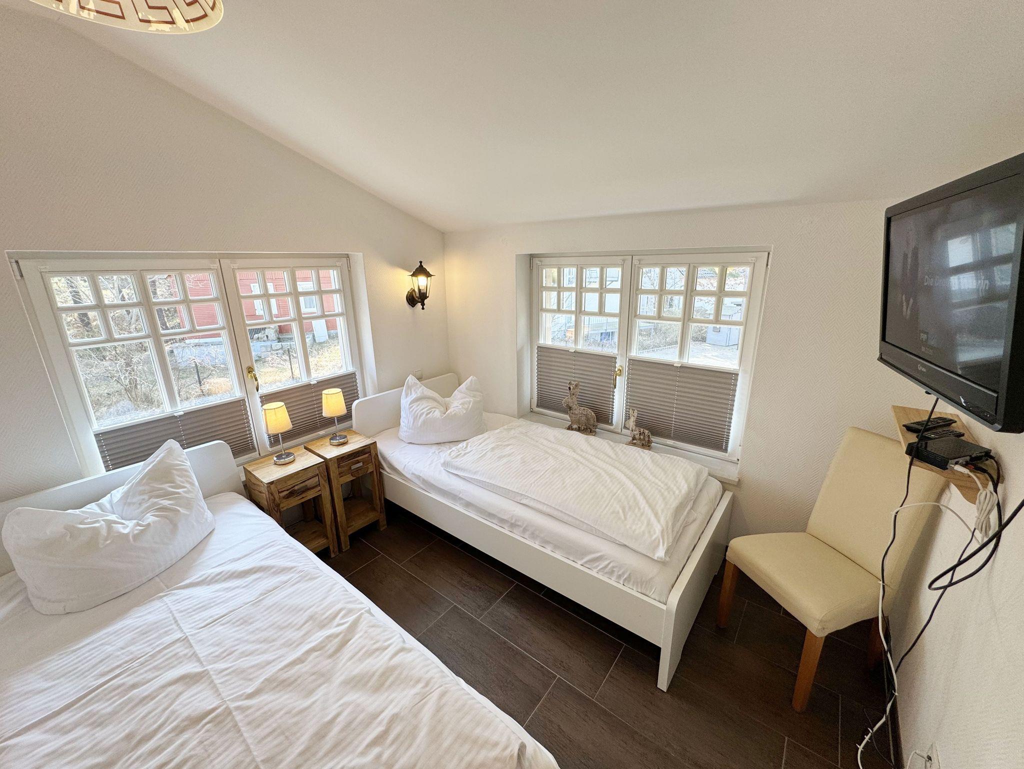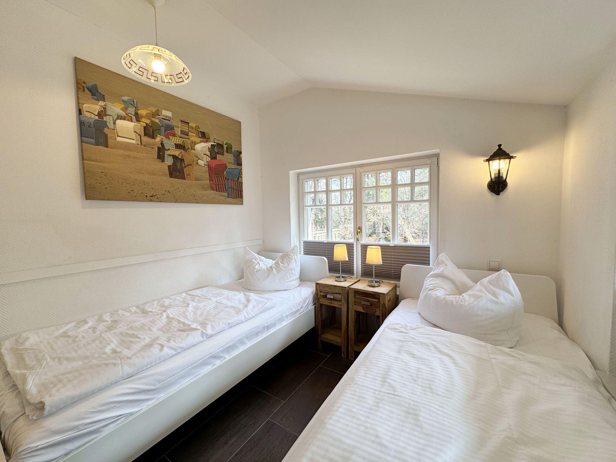 Die modern eingerichtete Nichtraucherferienwohnung 04 im Haus Strandkiefer befindet sich in der 1. Etage. Sie bietet Ihnen mit ca. 56 m² ausreichend Platz für 2 bis 4 Personen + 1 Kleinkind bis 3 Jahre im Kinderreisebett. Vom Flur mit Garderobe gelangen sie in alle Räumlichkeiten. Der helle Wohn-/Essbereich besticht mit seinen bodentiefen Holzfenstern und den Blick auf die Ostsee. Der Wohnbereich wurde mit einer Couch, einem Couchtisch, einem Sessel, einem TV-Board mit einem Smart-TV, einem WLAN-Zugang und einem Blu-Ray-Player ausgestattet. Abgerundet wird der Raum durch einen Kamin, der Ihnen gerade in der kälteren Jahreszeit, zusätzlich zur Fußbodenheizung, eine wohlige Wärme beschert. Die angrenzende Küchenzeile lässt keine Wünsche offen, so dass Sie mit einem Geschirrspüler, einem Backofen (selbstreinigend), einem Kühlschrank mit Gefrierfach, einem Cerankochfeld, einer Mikrowelle, einer Kaffeemaschine, einem Toaster, einem Wasserkocher, einem Mixer sowie diversen Küchenutensilien jede Mahlzeit zubereiten können. Zusätzlich finden Sie hier auch eine Waschmaschine mit Trocknerfunktion. Durch den Essplatz am Fenster wird der Bereich komplettiert. Ihr bestuhlter Balkon (Ost) erreichen Sie vom Wohnbereich, von wo Sie auch den Blick auf das Meer genießen können. Das große Schlafzimmer verfügt über ein Doppelbett (1,80m x 2,00m), verstellbare Lattenroste, Nachttischablagen mit Beleuchtung, einem großen Kleiderschrank und Verdunklungsplissees. Zusätzlich haben Sie auch von hier eine Möglichkeit auf einen weiteren Balkon (Süd) zu kommen. Das kleine Schlafzimmer verfügt über 2 Einzelbetten (0,90m x 2,00m), Nachttischablagen mit Beleuchtung, einem Flachbild-TV und Verdunklungsplissees. Das innenliegende Badezimmer ist mit einer Dusche (flacher Einstieg), einem WC, einem Waschtisch, einem Kosmetikspiegel, einem Fön und einer Badewanne ausgestattet. Ein Wäscheständer sowie Reinigungsutensilien runden die Ausstattung ab. Ihre mitgebrachten oder geliehenen Fahrräder können Sie im kleinen abschließbaren Fahrradschuppen neben dem Hauseingang unterbringen. Ihr PKW-Stellplatz (Nr.04) befindet sich direkt am Haus. 2 Haustiere sind gegen eine Gebühr gern gesehene Gäste. Die Erstausstattung eines Wäschepaketes (komplette Bettwäsche, 1 Duschhandtuch, 1 kleines Handtuch) können Sie bis 14 Tage vor Anreise gegen einen Aufpreis dazu buchen oder durch eigenes Ergänzen. Ab 2 gebuchten Paketen erhalten Sie einmalig 1 Geschirrhandtuch und 1 Duschvorleger hinzu.
