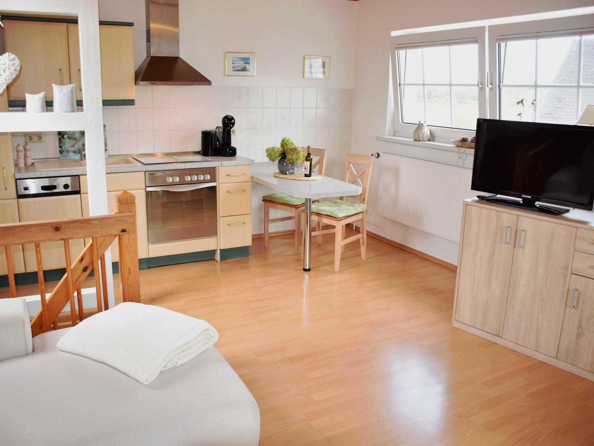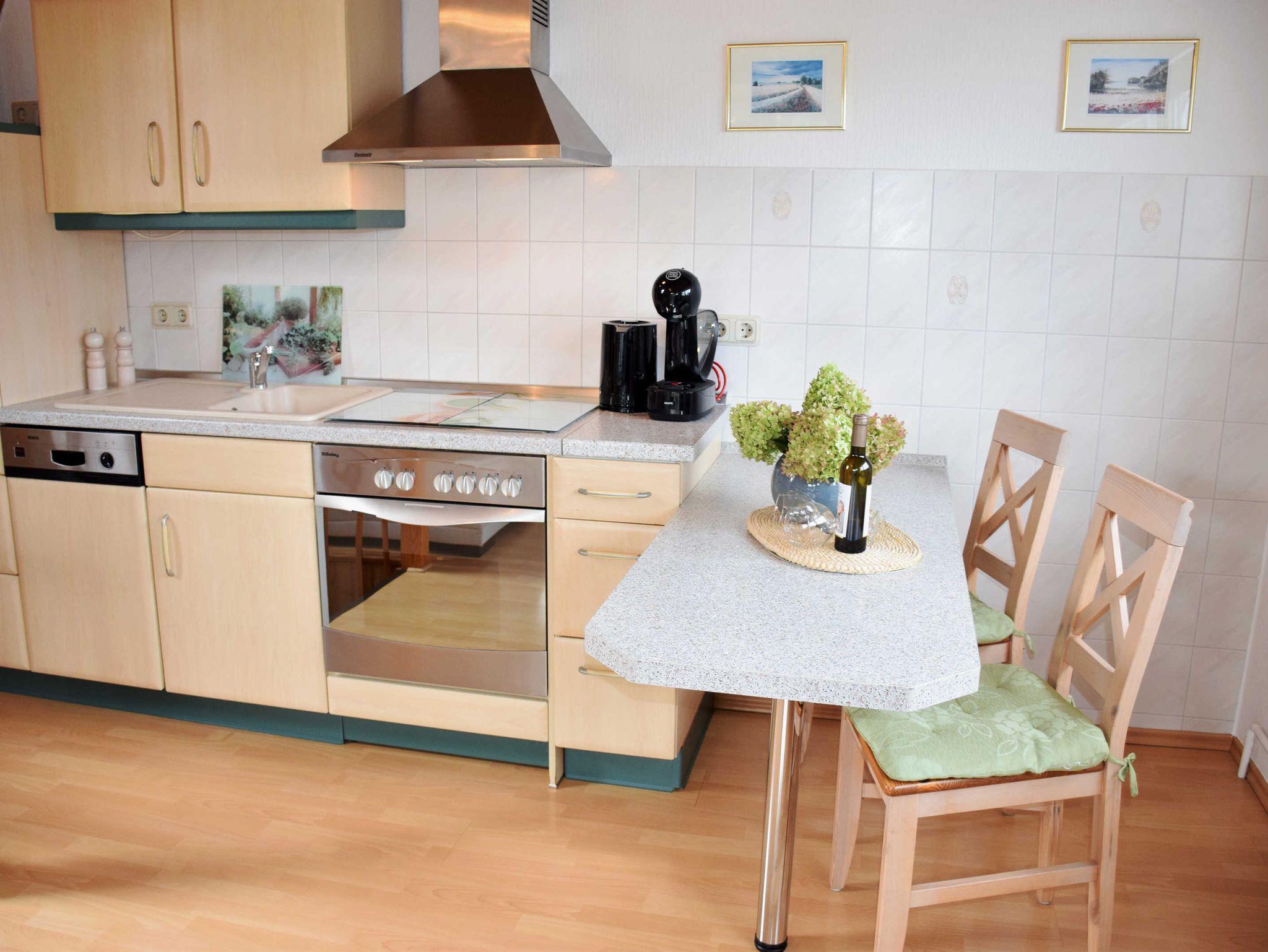 Die Ferienwohnung Gartenseite liegt in einem Doppelhaus und verfügt über einen separaten Eingang. Sie ist ca. 50 qm groß, hat Platz für maximal 2 Personen und wurde modern und hochwertig eingerichtet. Im gemütlichen Wintergarten können Sie am Morgen Ihr Frühstück bei weit geöffneten Fenster und frischer Luft einnehmen. Im Wohnraum, der sich im Obergeschoss befindet und über eine Holztreppe erreicht wird, befinden sich eine bequeme Sitzcouch mit Sessel, Tisch und ein modernes Flachbild-TV-Gerät. Hier steht auch ein Esstisch mit Sitzgelegenheiten. Die moderne Küchenzeile ist mit einem Herd, Abzugshaube, Backofen, Geschirrspüler, Wasserkocher, Kaffeemaschine, Toaster und Kühlschrank komplett ausgestattet.