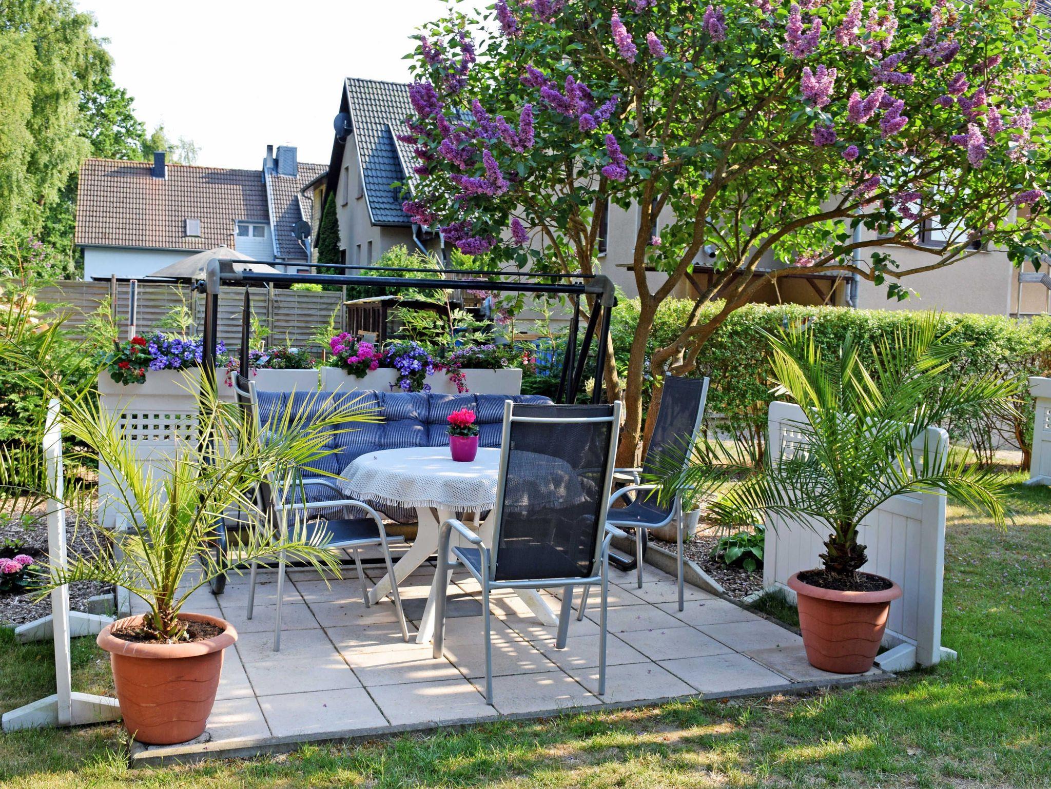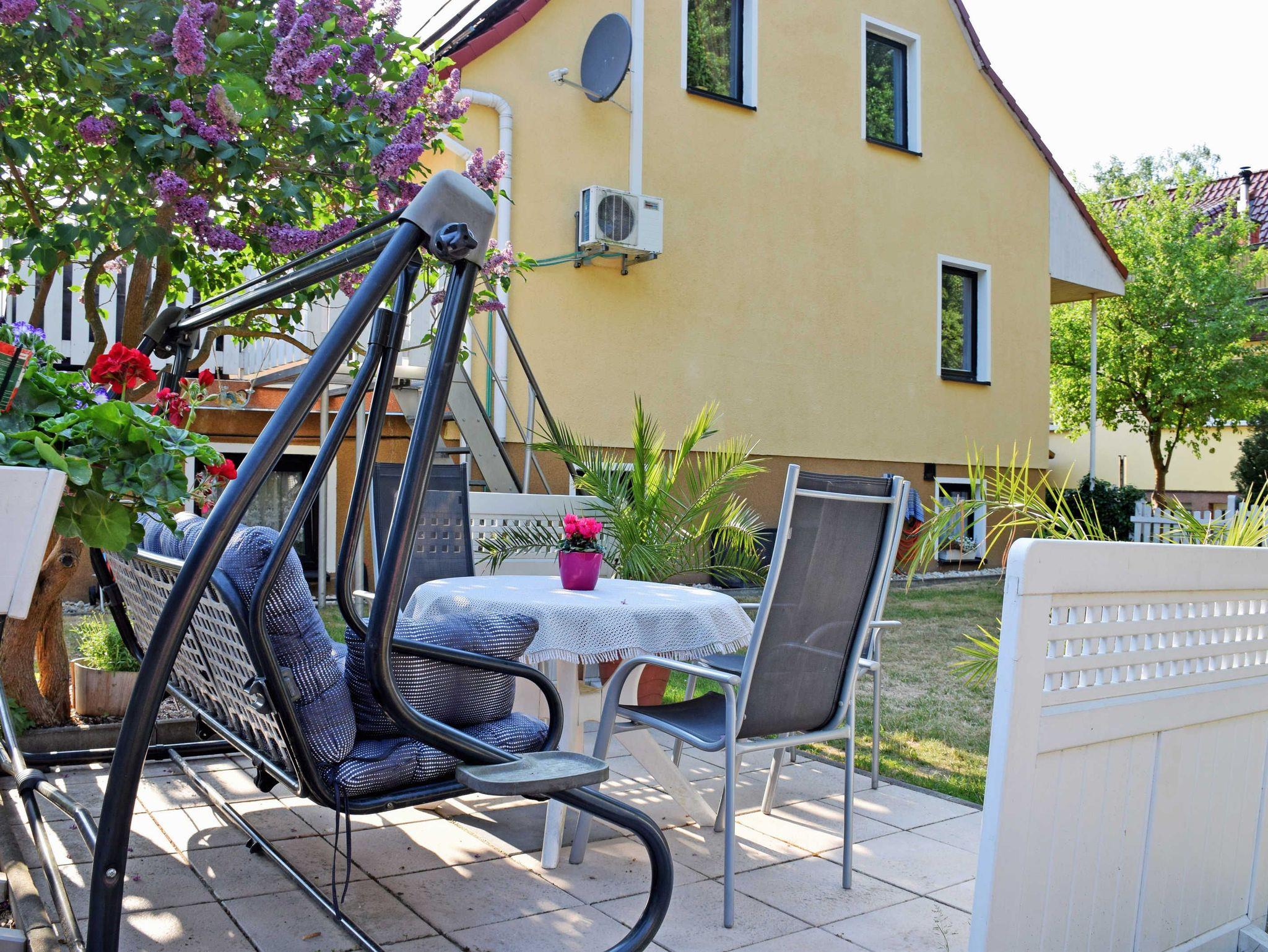 Zur Ferienwohnung gehören auch eine Sitzgelegenheit im Garten, eine Grillmöglichkeit, Spielmöglichkeiten für Kinder und ein großer, parkähnlicher Gartenbereich.