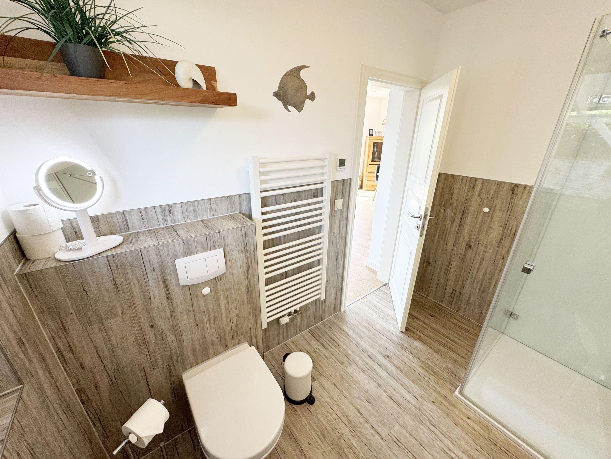 Willkommen im Ferienhaus „Uns lütt Hus“, im schönen und erholsamen Ostseebad Baabe. Das Nichtraucherferienhaus mit seinen ca. 95 m² erstreckt sich auf über 2 Etagen und bietet Ihnen Platz für max. 4 Erwachsene. Mit viel Liebe zum Detail wurde das Haus eingerichtet und bietet Ihnen auch in der kalten Jahreszeit einen angenehmen Rückzugsort, um Ihre Seele baumeln zulassen. Eine Sauna im Eingangsbereich ziert das Haus und bietet Ihnen eine kleine aber feine Wellnessoase. Der großzügige Koch-, Ess- und Wohnbereich mit seinen ca. 39 m² lässt keine Wünsche offen. Die offene Küchenzeile ist mit einem modernen Pyrolyse Backofen, Glaskeramikkochfeld, Dunstabzugshaube, Granitspüle, Einbau-Kühl-Gefrierkombination, Kaffeemaschine, Pad-Maschine (Dolce Gusto), Heißluftfriteuse (Ninja), Wasserkocher, Toaster, Eierkocher, Mixer und vielen weiteren kleinen Küchenhelfern ausgestattet. Angrenzend an den Küchenbereich schließt sich der großzügige Wildeichenholzesstisch mit seinen 4 Lederstühlen und Highboard an. Der Wohnbereich mit seiner gemütlichen Eckcouch und dazugehörigem Couchtisch, Leselampe, TV-Bord mit LED Smart-TV mit Sky (Auswahl von Sport, Film, Dokumentation), Blu Ray Player und einem Teufel Heimkinosystem laden für gemütliche und erholsame Stunden ein. Abgerundet wird dieser Bereich durch einen Ohrensessel mit Hocker und Blick auf den Kamin, welcher in der kalten Jahreszeit für eine angenehme Wärme sorgt. Kaminholz ist für Sie inklusive. Eine kleine Auswahl an Gesellschaftsspielen, Urlaubslektüren und DVDs stehen Ihnen außerdem zur Verfügung. Der technische Bereich wird zusätzlich durch einen WLAN Zugang (100 Mbit/S) abgerundet. Das erste der Tageslichtduschbäder befindet sich im Erdgeschoss und ist mit einer ebenerdigen Klarglasdusche der Firma Sprinz und einer XXL Regendusche ausgestattet. Weiterhin finden Sie ein WC, einen Waschtisch, einen Handtuchtrockner und einen Fön im Bad. Vom Wohn-/Essbereich gelangen Sie auf Ihre südausgerichtete Terrasse, die mit bequemen und verstellbaren Terrassenstühlen und einer elektrischen Markise sowie 2 Sonnenliegen ausgestattet ist. Auch ein Holzkohlegrill der Firma Weber lässt den Abend auf der Terrasse bei einem guten Essen und einem Gläschen Wein ausklingen. Vom Flur erreichen Sie durch eine etwas steile Holztreppe Ihre beiden Schlafzimmer sowie ein weiteres Tageslichtbad. Das große Schlafzimmer verfügt über ein Doppelbett (1,80 m x 2,00 m) mit Gel-Kaltschaummatratzen (0,90 m x 2,00 m), verstellbare Lattenroste am Kopf und Fußende, Nachttischablagen, DAB-Radio Wecker von Teufel, LED TV, einen Ohrensessel mit Hocker, einen Safe, einen Elektrokamin sowie einen großzügigen Einbau-Kleiderschrank. Das kleinere der Schlafzimmer wurde mit einem Doppelbett (1,60 m x 2,00 m) und Gel-Kaltschaummatratzen (0,80 m x 2,00 m), verstellbare Lattenroste am Kopf und Fußende, Nachttischablagen, DAB-Radio Wecker von Teufel sowie einer kleinen Sitzecke bestehend aus einem Sessel mit Ablagen, ausgestattet. Für einen ruhigen und erholsamen Schlaf sorgen zusätzlich Verdunklungs-Plissees, elektrische Rollläden sowie Insektenschutzgitter. Das zweite Tageslichtbad im Obergeschoss verfügt wie das Duschbad im Erdgeschoss über eine ebenerdige Klarglasdusche der Firma Sprinz und eine XXL Regendusche. Ein WC, ein Waschtisch, ein Kosmetikspiegel und ein Handtuchtrockner runden das Bad ab. Alle Räumlichkeiten im Ferienhaus sind mit einer Fußbodenheizung und Vinylfußbodenbelag im Holz Look versehen. Nicht nur im Schlafzimmer finden Sie elektrische Rollläden und Insektenschutzgitter! Diese sind im gesamten Haus vorhanden. Im Hauswirtschaftsraum finden Sie eine Waschmaschine mit Trocknerfunktion, einen Staubsauger, Reinigungsutensilien, ein Bügelbrett sowie ein Bügeleisen. Um den sehr kalkhaltigen Wasser auf der Insel Rügen entgegenzuwirken, finden Sie eine Enthärtungsanlage im Haus, die das Wasser enthärtet. Für unsere kleinen Gäste steht ein Hochstuhl sowie ein Kinderreisebett (ohne Bettinlett/mit Zusatzmatratze) und ein Treppenschutz zur Verfügung. Auch ein 4-Beiner ist mit seinem eigenen Schlafplatz gegen eine Gebühr ein gern gesehener Gast. 2 PKW-Stellplätze befinden sich direkt vor dem Haus sowie eine Ladestation für Elektrofahrzeuge (Abrechnung über Nebenkostenpauschale). Auch der vorhandene Carport am Haus bietet Schutz für einen PKW. Ihre geliehenen oder auch mitgebrachten Fahrräder können Sie im großzügigen Schuppen unterstellen. Hier gibt es auch die Möglichkeit, Ihre E-Bikes aufzuladen. Zur Erkundung der Umgebung stehen Ihnen zusätzlich 2 Trekking Räder der Firma Victoria mit Gangschaltung zur Verfügung sowie ein Damenrad der Firma Hartje mit Gangschaltung (kein Vertragsbestandteil). Auf dem kleinen Grundstück finden Sie auch eine Wäschespinne, um Ihre Handtücher nach dem Baden in der Ostsee aufzuhängen. Die Erstausstattung eines Wäschepaketes (komplette Bettwäsche, 1 Duschhandtuch, 2 kleine Handtücher) können Sie bis 14 Tage vor Anreise gegen einen Aufpreis dazu buchen oder durch eigene ergänzen. Ab 2 gebuchten Paketen erhalten Sie einmalig 1 Geschirrhandtuch und 1 Duschvorleger hinzu.