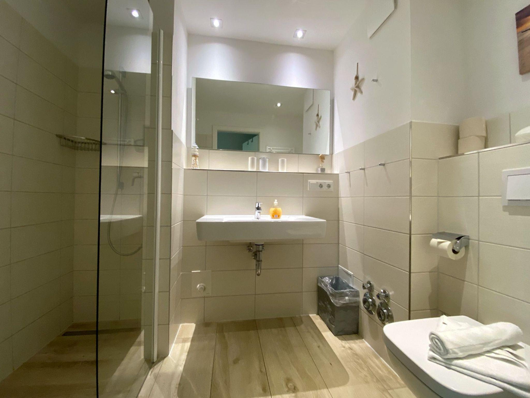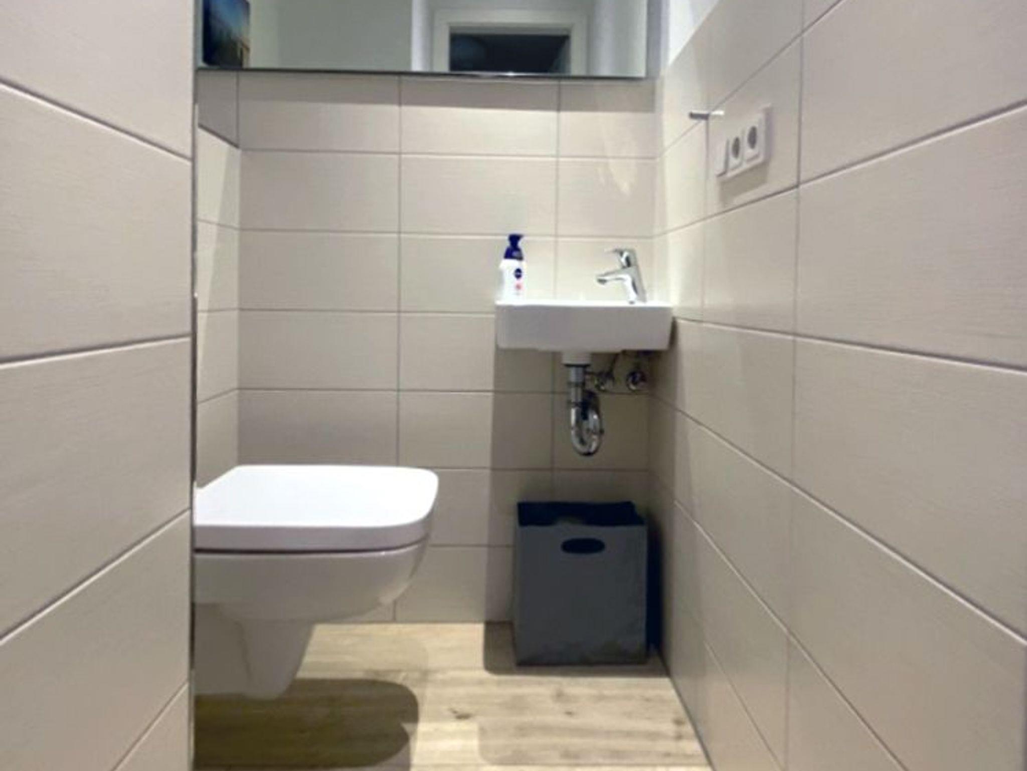 Es gibt ein Bad mit Dusche, Waschbecken, WC, Handtuchheizkörper, Fön und ein separates Gäste WC.