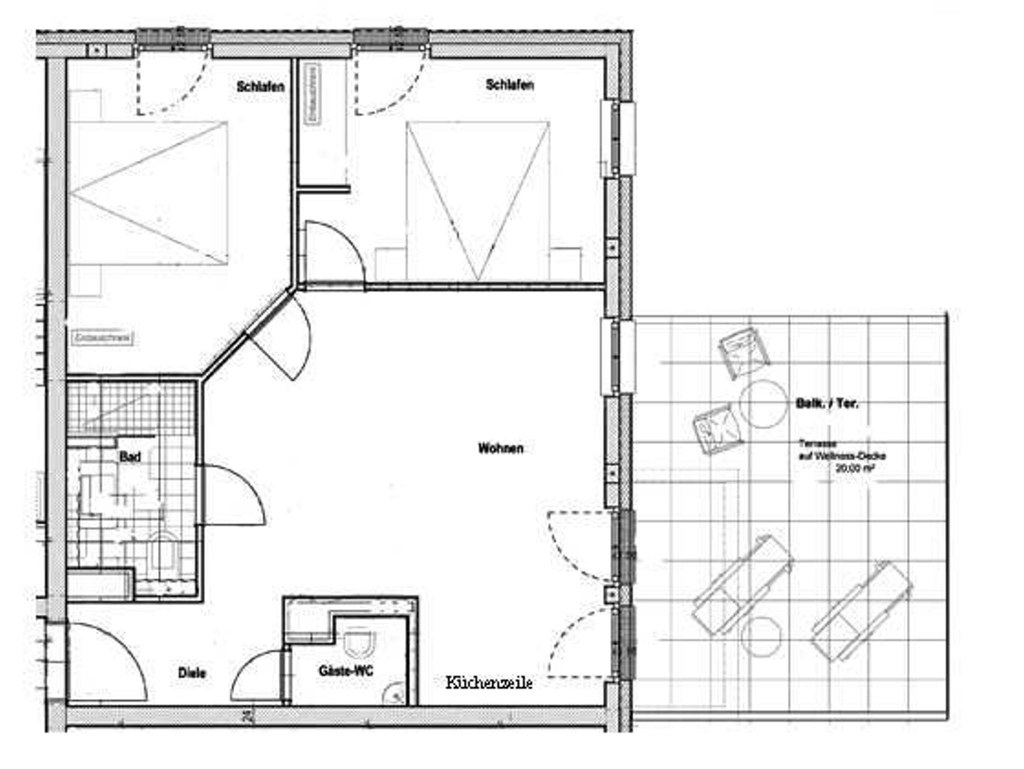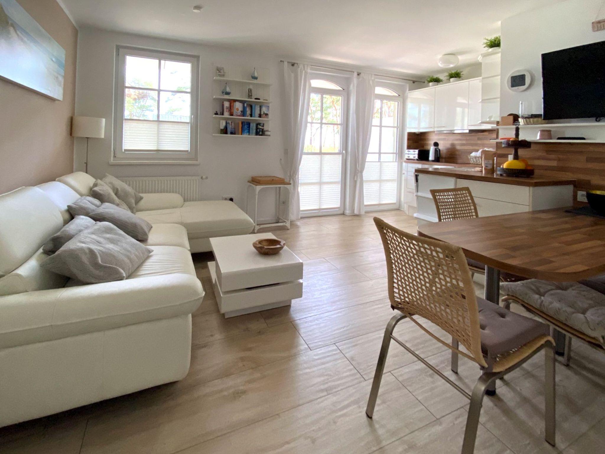 Die Wohnung hat eine offene Küche (Ceranfeld, Backofen, Mikrowelle, Kaffeautomat, 4-fach Toaster, Wasserkocher, Kühl-Gefrierschrank, Staubsauger) und im Wohnbereich gibt es eine ausziehbarer Schlafcouch (140x200) sowie einem 42`` TV mit Radio, CD, DVD und Blueray-Player.