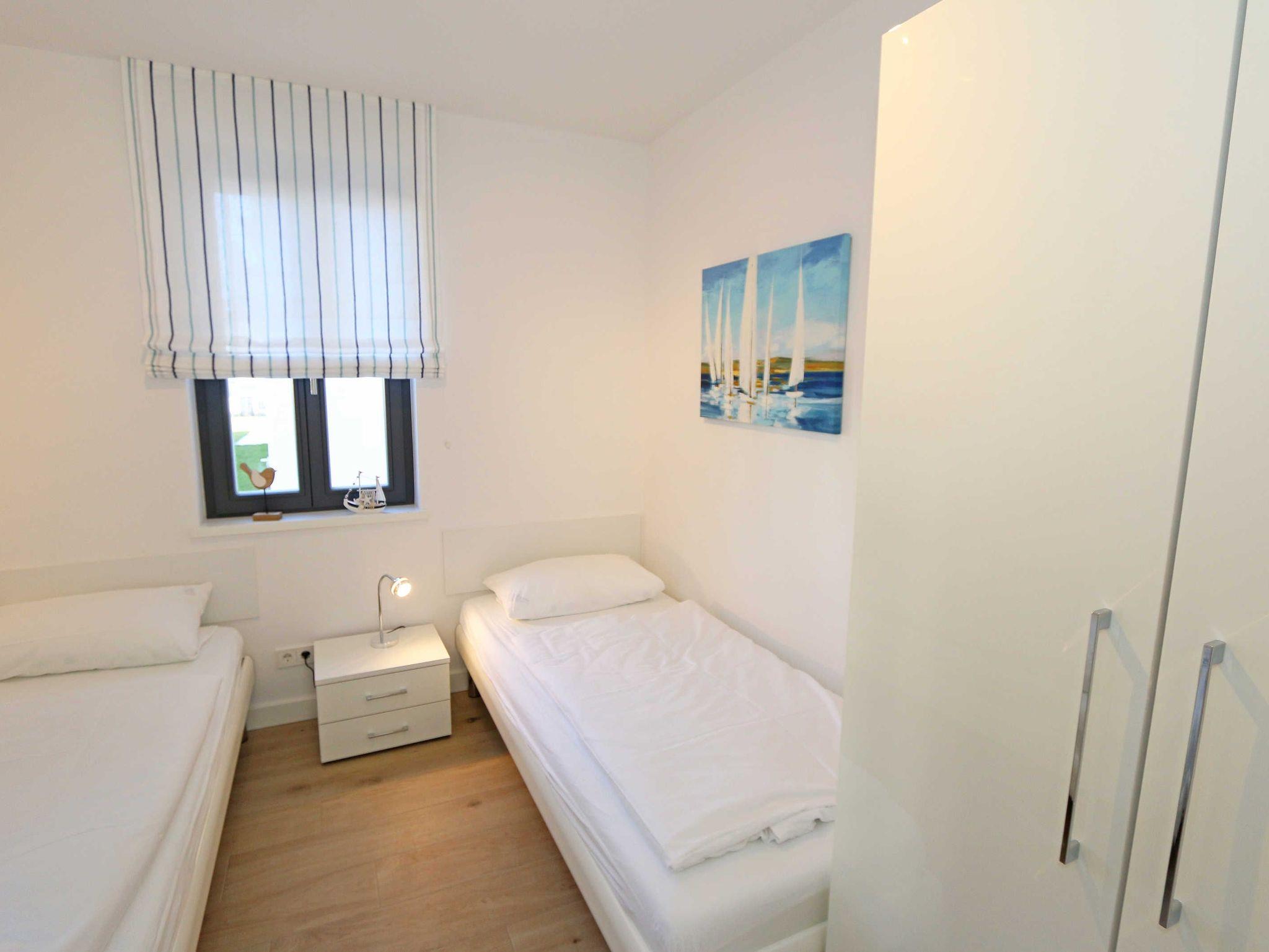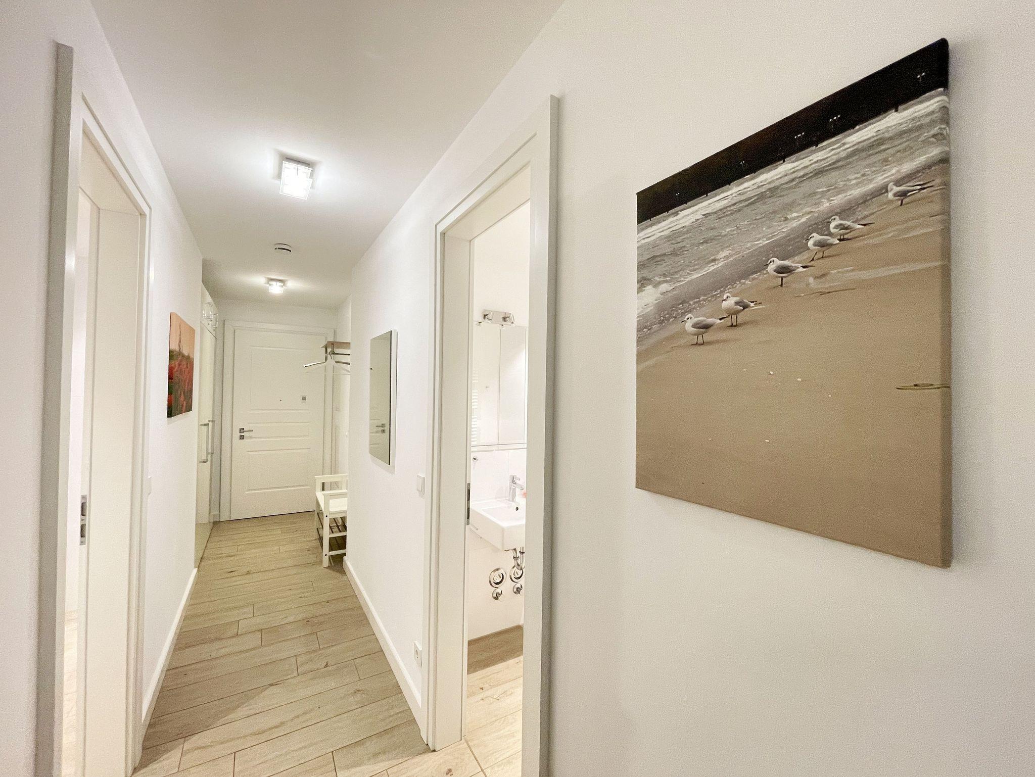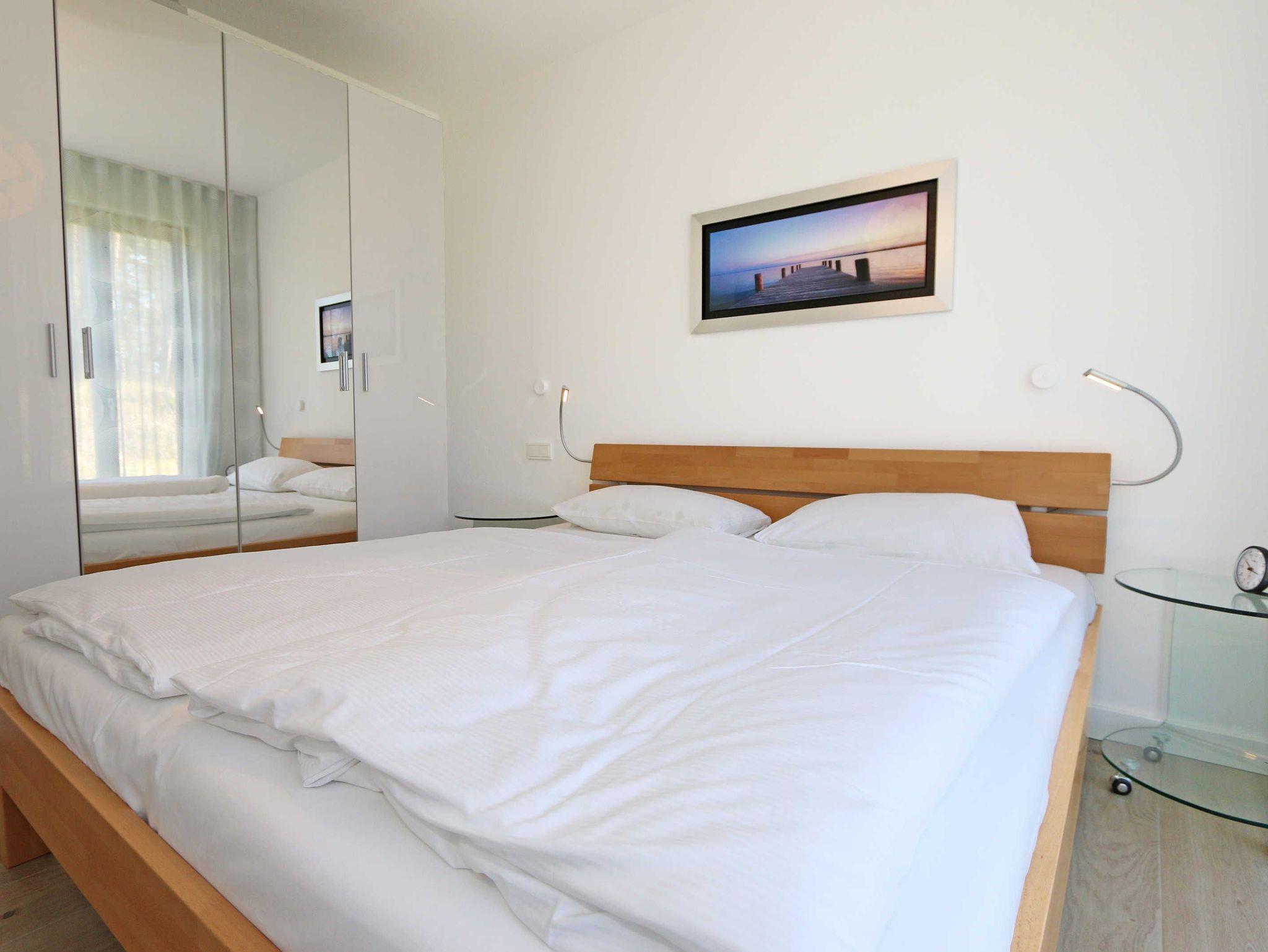 Die ca. 65 m² große 3-Zimmer-Ferienwohnung (Nichtraucher) bietet Ihnen durch ihre hochwertige Ausstattung beste Voraussetzungen für einen erholsamen Urlaub. Durch eine moderne und großzügige Raumaufteilung herrscht genügend Platz für 2 bis 4 Personen. Im lichtdurchfluteten Wohn-/Esszimmer können Sie durch die komfortable Eckcouch, einen Couchtisch, eine Leselampe, ein Sideboard und einen großen Essplatz gemütliche Tage verbringen. Für Unterhaltung sorgen dabei ein Smart-TV, eine Stereoanlage mit DAB-Radio inkl. CD-Player und das in der Wohnung kostenlos, verfügbare W-LAN. Vom Wohnbereich gelangen Sie auf die nach Süden ausgerichtete und bestuhlte Terrasse mit einer großzügigen Rasenfläche und Sonnenschirm, die von Ihnen allein genutzt werden kann. Für Ihr leibliches Wohl können die moderne Küchenzeile mit einem Ceranfeld, Backofen, Spülmaschine, Kühlschrank mit Eisfach, Kaffeemaschine, Dolce Gusto Maschine, Toaster, Wasserkocher sowie diverse Küchenutensilien sorgen. Ein weiterer Smart-TV befindet sich in einem der beiden Schlafzimmer, die jeweils mit bequemen Betten (ein Schlafzimmer verfügt über ein Doppelbett (1,80 m x 2,00 m) das andere über 2 Einzelbetten (je 0,90 m x 2,00 m), verstellbare Lattenroste, Nachttischablagen und Kleiderschränken für Ihre Urlaubsgarderobe ausgestattet sind. Für einen ruhigen Schlaf dienen die Außenrollos. Vom weitläufigen Flurbereich gelangen Sie direkt in die zwei komfortablen Bäder, die jeweils mit ebenerdiger Regen-Dusche, WC, Fön, Kosmetikspiegel, Handtuchtrockner sowie einen Waschplatz mit großzügigem Spiegel und breiter Ablagefläche eingerichtet sind. Alle Räumlichkeiten sind mit einer Fußbodenheizung ausgestattet sowie mit Insektenschutzgitter versehen. Haustiersind nicht erlaubt. Die hauseigene Tiefgarage (Platz Nr. 4 / Einfahrtshöhe 2,00 m) sorgt dafür, dass Ihr PKW sicher untergebracht ist. Durch die Tiefgarage gelangen Sie direkt in die Strandvilla Andrea, die auch über einen Lift verfügt, um Ihr Reisegepäck mühelos in die Ferienwohnung zu transportieren. Im Keller befinden sich außerdem eine münzgesteuerte Waschmaschine, ein Wäschetrockner und eine Sauna mit angrenzender Dusche, WC und einem Ruheraum, die zum Entspannen einladen. Auf dem Gelände der Strandvilla befinden sich überdachte Fahrradständer, an denen Sie eigene oder geliehene Räder abstellen können. Die Erstausstattung eines Wäschepaketes (komplette Bettwäsche, 1 Duschhandtuch, 2 kleine Handtücher) können Sie bis 14 Tage vor Anreise gegen einen Aufpreis dazu buchen oder durch eigene ergänzen. Ab 2 gebuchten Paketen erhalten Sie einmalig 1 Geschirrhandtuch und 1 Duschvorleger hinzu.