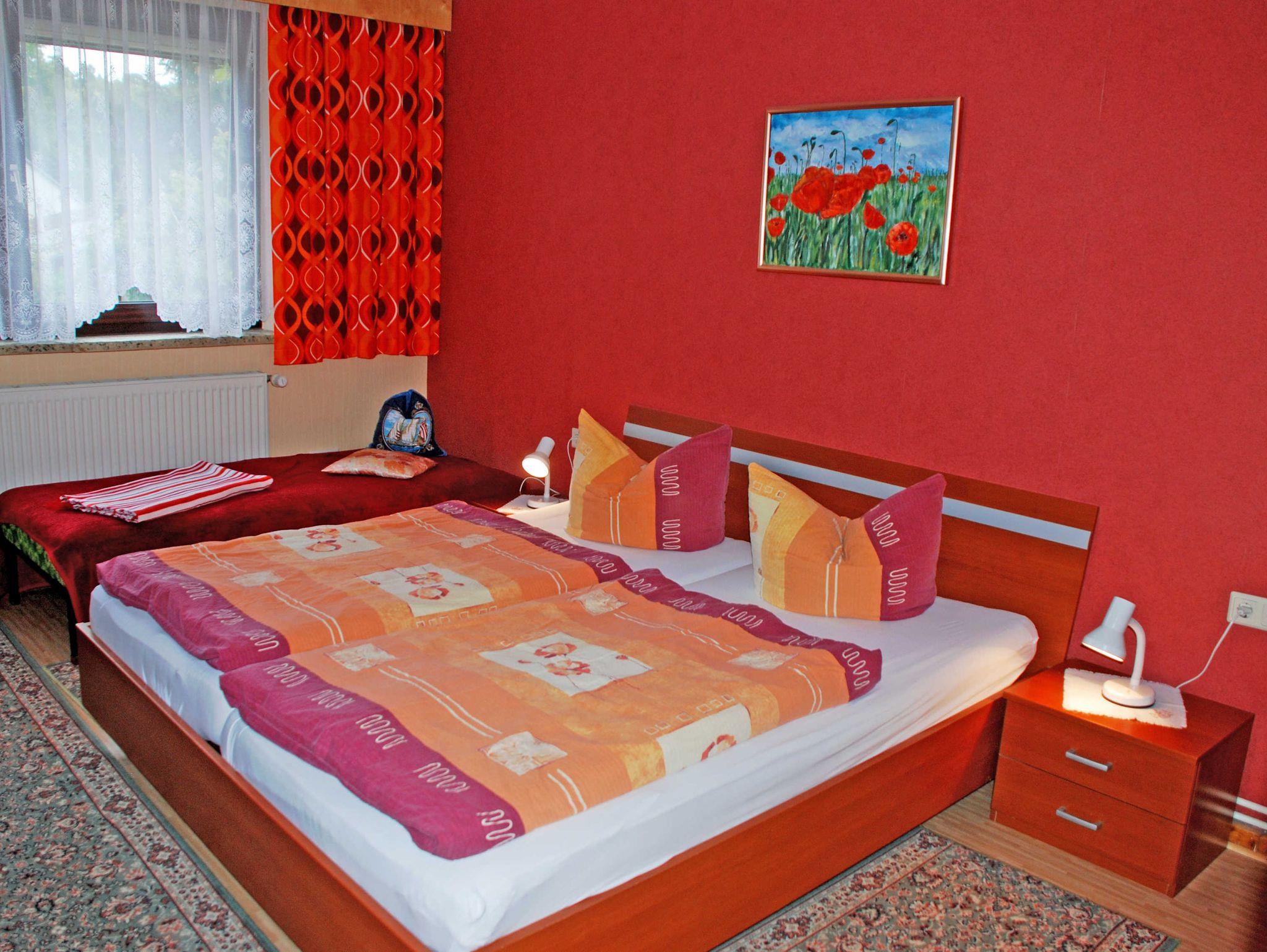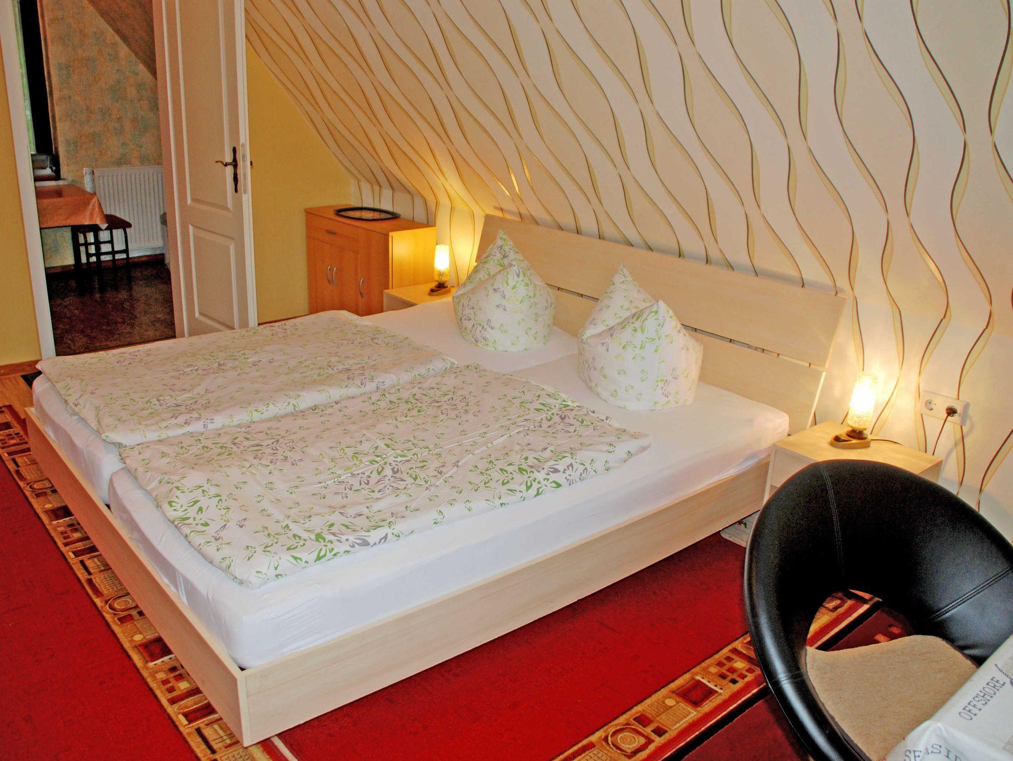 Diese Ferienwohnung ist ca. 40 qm groß, hat Platz für maximal 3 Erwachsene und wurde liebevoll eingerichtet. Über einen separaten Eingang gelangt man in die Wohnung mit einem kleinen Vorflur mit Garderobe. Im Wohnzimmer befinden sich eine bequeme Sitzcouch mit Tisch und Sesseln, ein Esstisch mit Stühlen, ein modernes Flachbild-TV-Gerät.