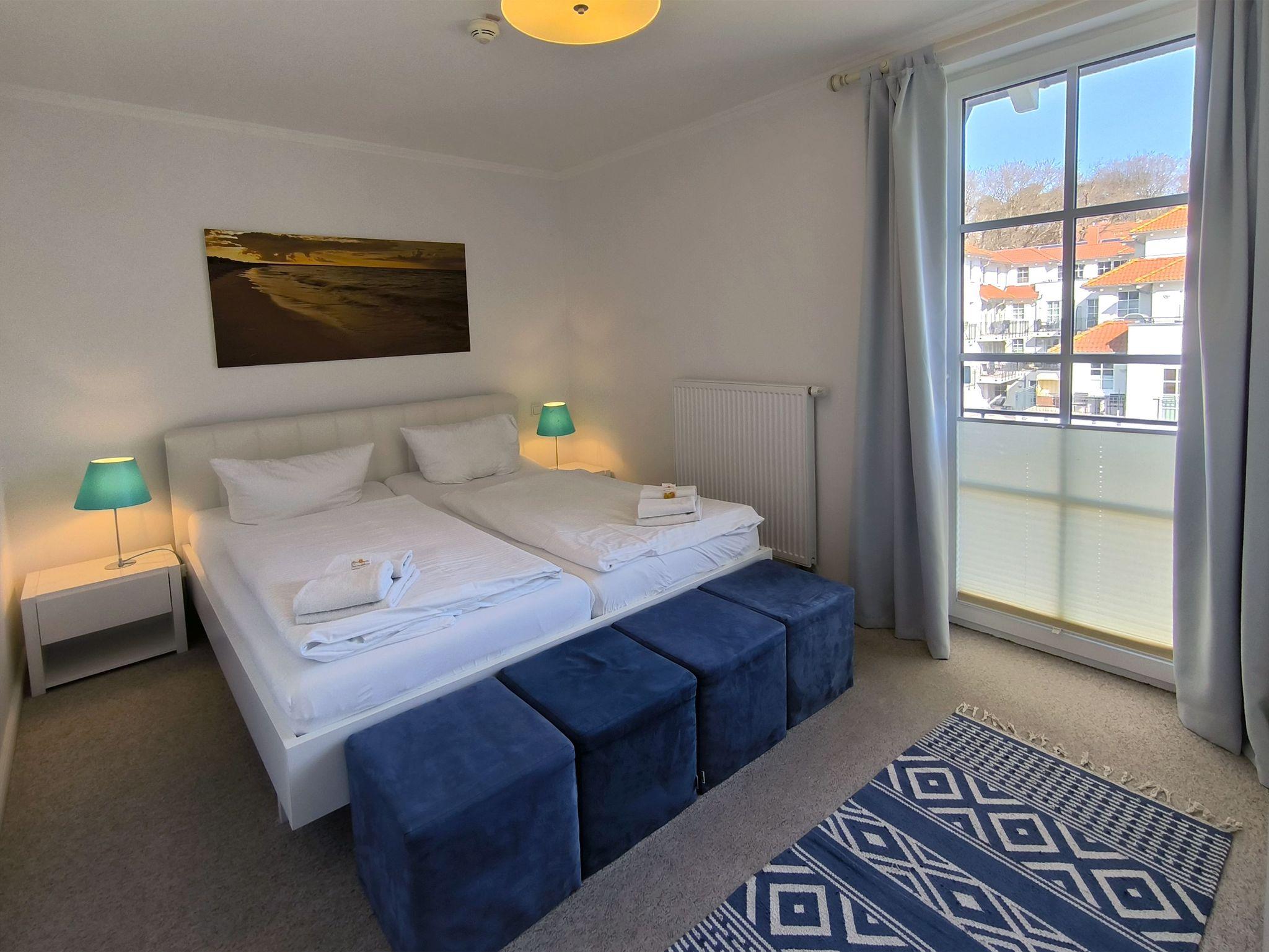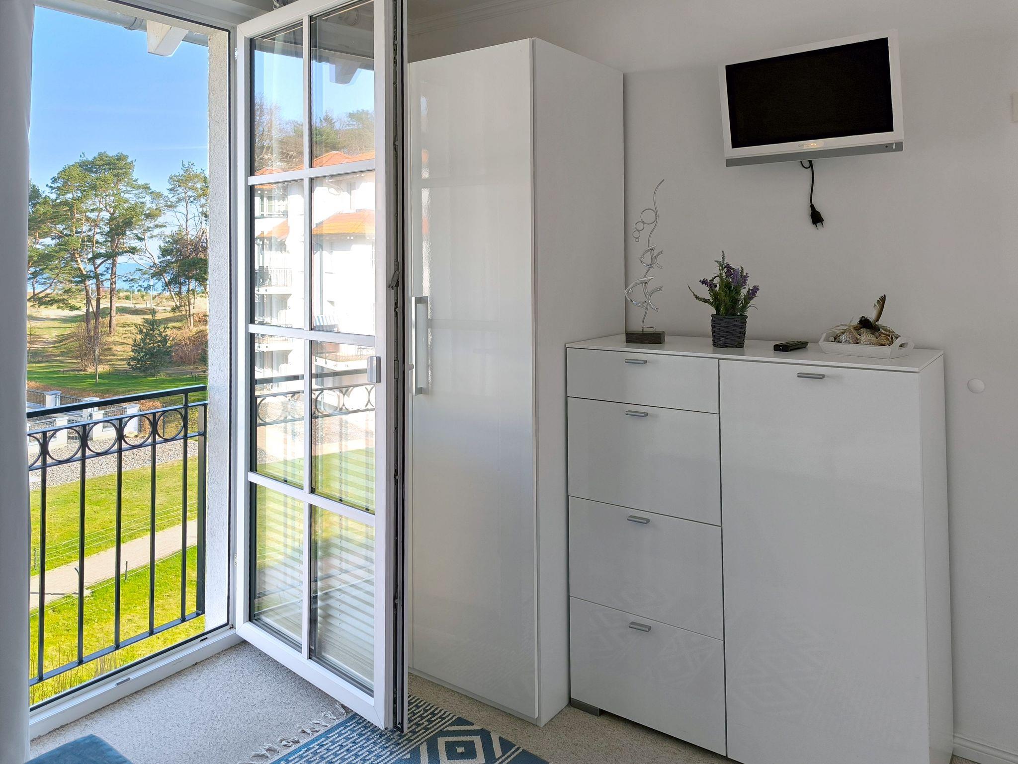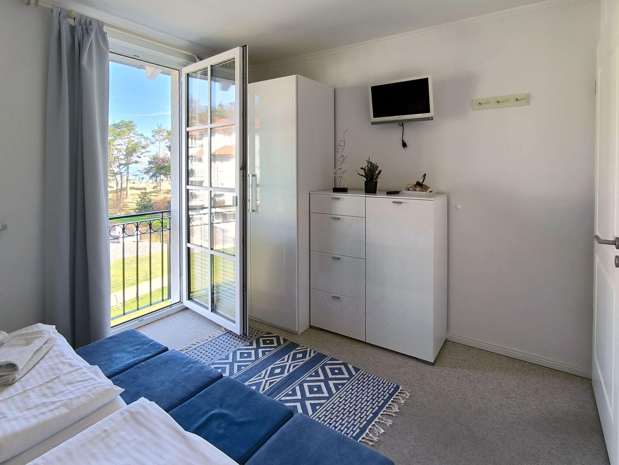 Die 2-Zimmerunterkunft mit französischem Flair liegt in einem Villenhaus (Nebenhaus C), das zur Ferienanlage gehört. Vom Balkon aus schauen Sie bis zur Ostsee und den Müther-Bau am Strand. Das Schlafzimmer hat ein Doppelbett, Nachtkonsolen, einen Kleiderschrank sowie einen Flachbild-TV. Im Wohnzimmer stehen außerdem eine Sitzgruppe, ein weiterer Fernseher, ein Radio und ein CD-Player für Sie bereit. Die separate Küche ist ebenfalls gut ausgestattet. Sie hat einen 4-Plattenherd mit Blitzkochzonen, einen Mikrowellen-Kompaktbackofen, einen Geschirrspüler, einen Kühlschrank mit Gefrierfach sowie Kaffeemaschine, Toaster und Wasserkocher.