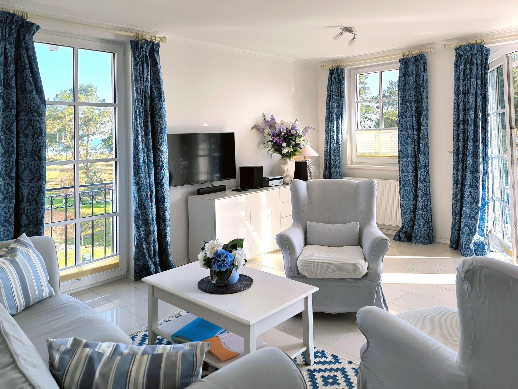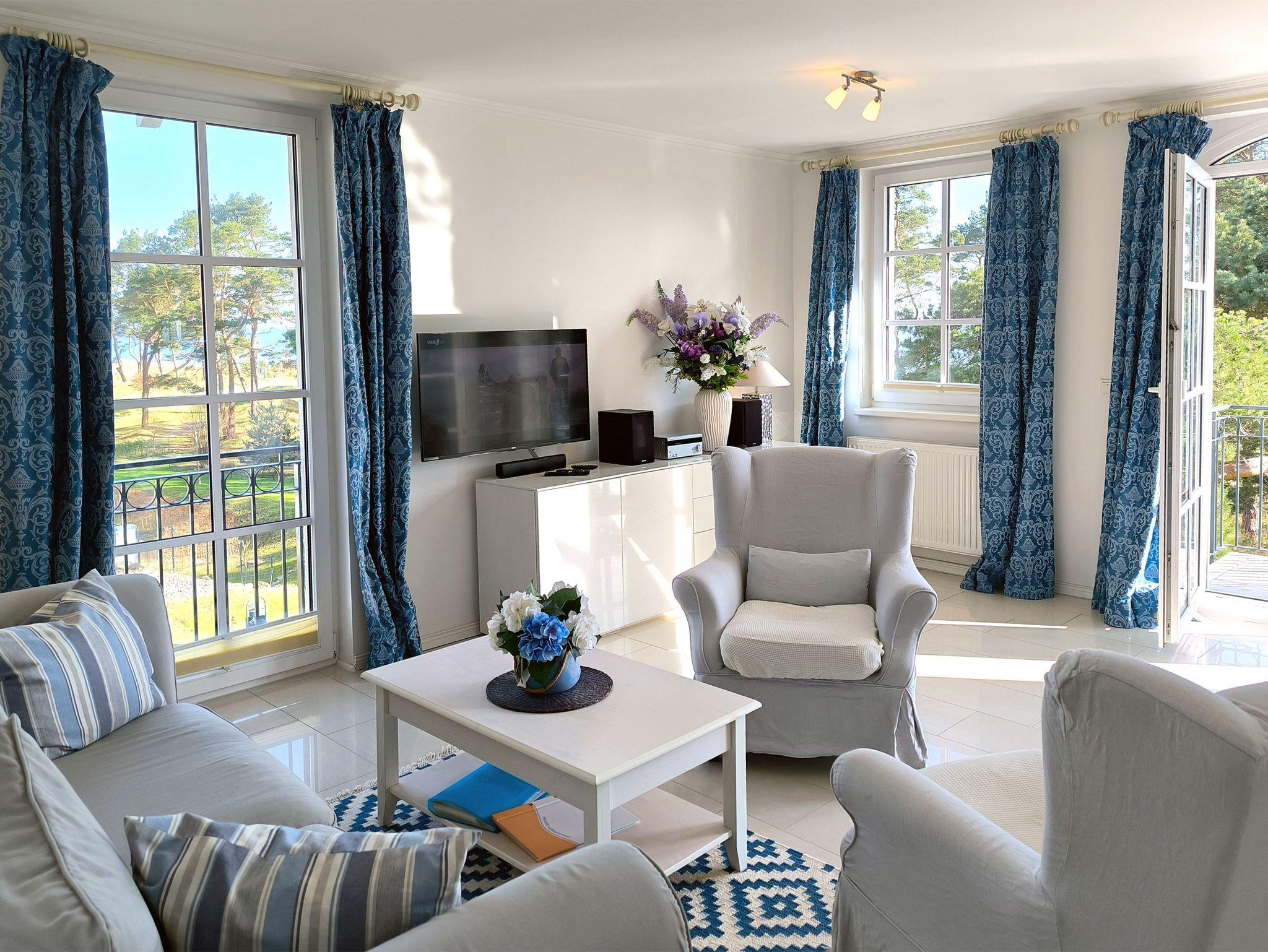Meerblick, Eckbadewanne und 65 Quadratmeter Wohnfläche: Die Nichtraucher-Ferienwohnung Strandlöper in der 2. Etage der Residenz Haus Meeresblick lässt in Sachen Komfort wohl keinen Wunsch offen. Die 2-Zimmerunterkunft mit französischem Flair liegt in einem Villenhaus (Nebenhaus C), das zur Ferienanlage gehört. Vom Balkon aus schauen Sie bis zur Ostsee und den Müther-Bau am Strand. Das Schlafzimmer hat ein Doppelbett, Nachtkonsolen, einen Kleiderschrank sowie einen Flachbild-TV. Im Wohnbereich stehen außerdem eine Sitzgruppe, ein weiterer Fernseher, ein Radio und ein CD-Player für Sie bereit. Die separate Küche ist ebenfalls gut ausgestattet. Sie hat einen 4-Plattenherd mit Blitzkochzonen, einen Mikrowellen-Kompaktbackofen, einen Geschirrspüler, einen Kühlschrank mit Gefrierfach sowie Kaffeemaschine, Toaster und Wasserkocher.