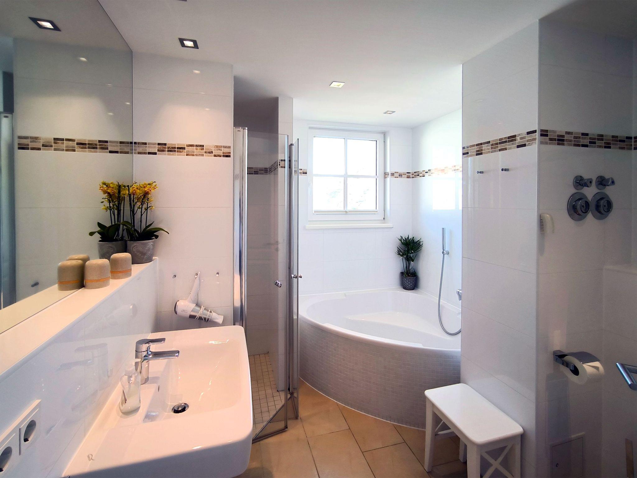 Das Bad wartet mit einer großen Eckbadewanne auf, eine begehbare Dusche gibt es zusätzlich. Ein Gäste-WC steht ebenfalls zur Verfügung.