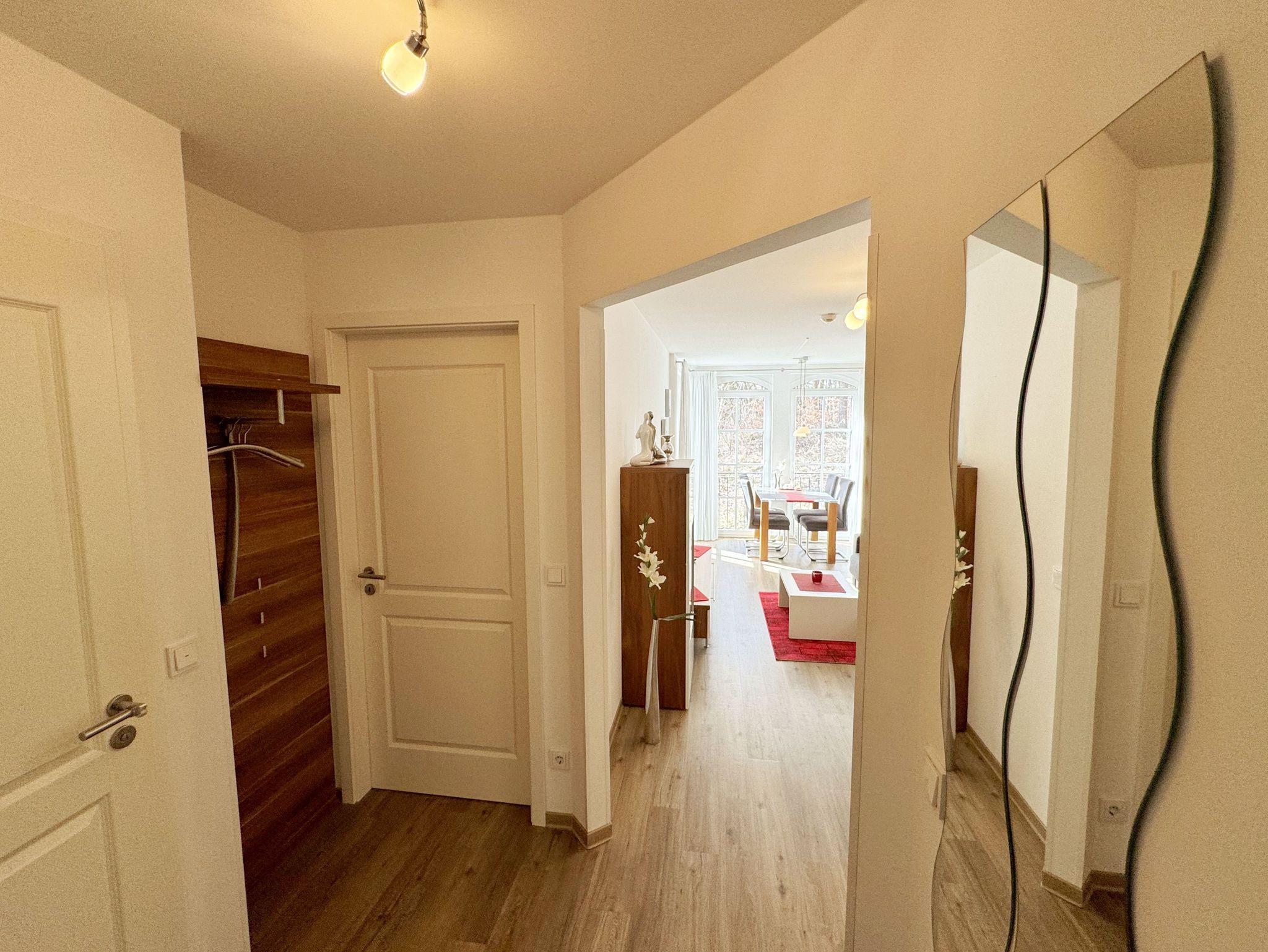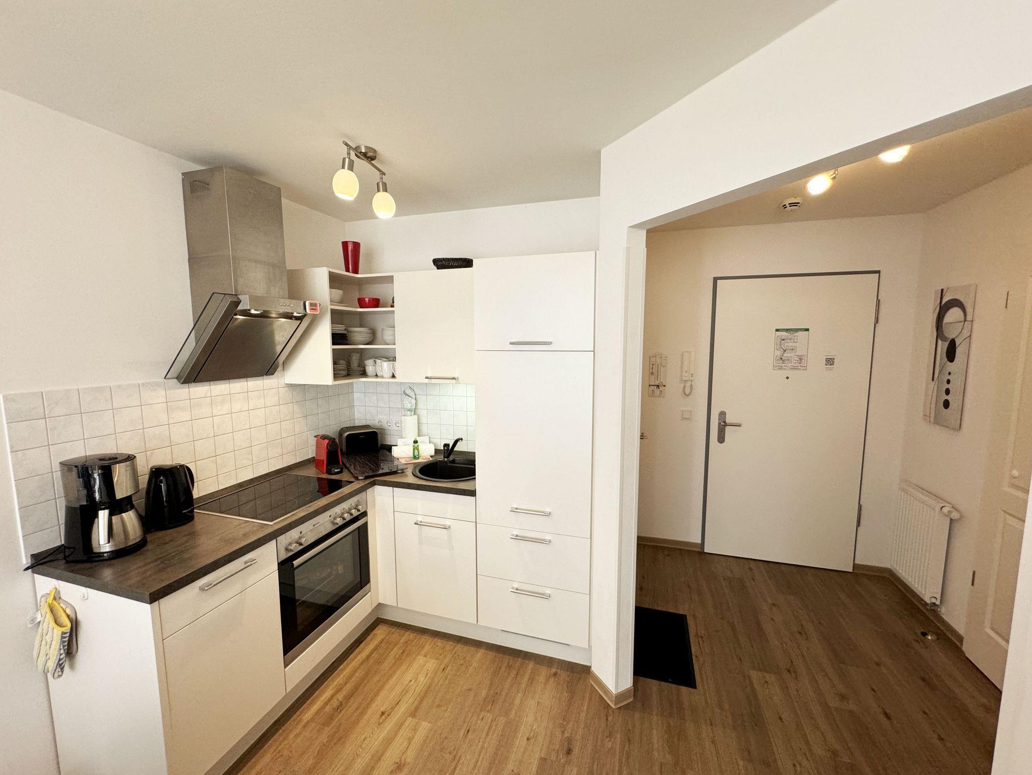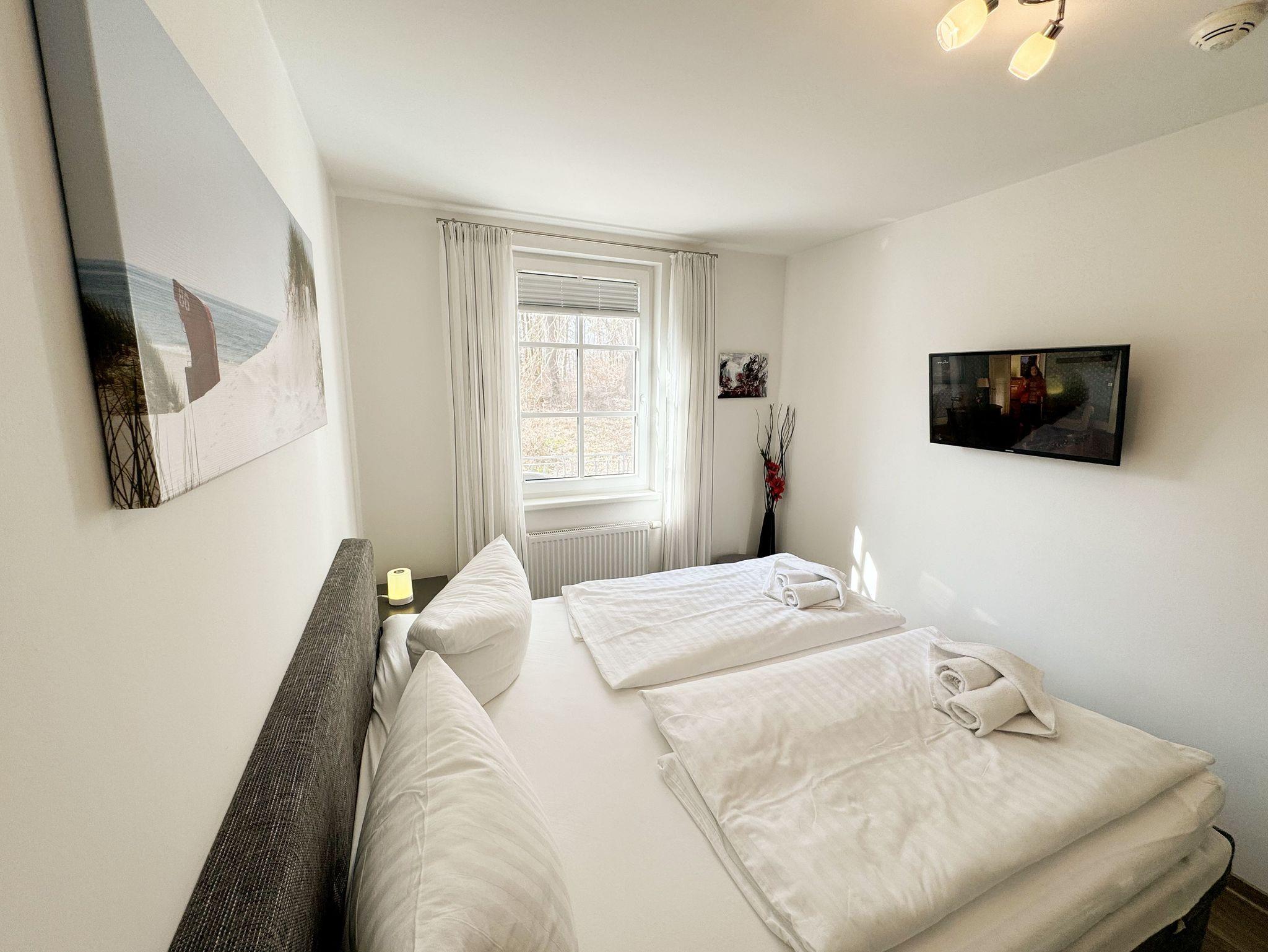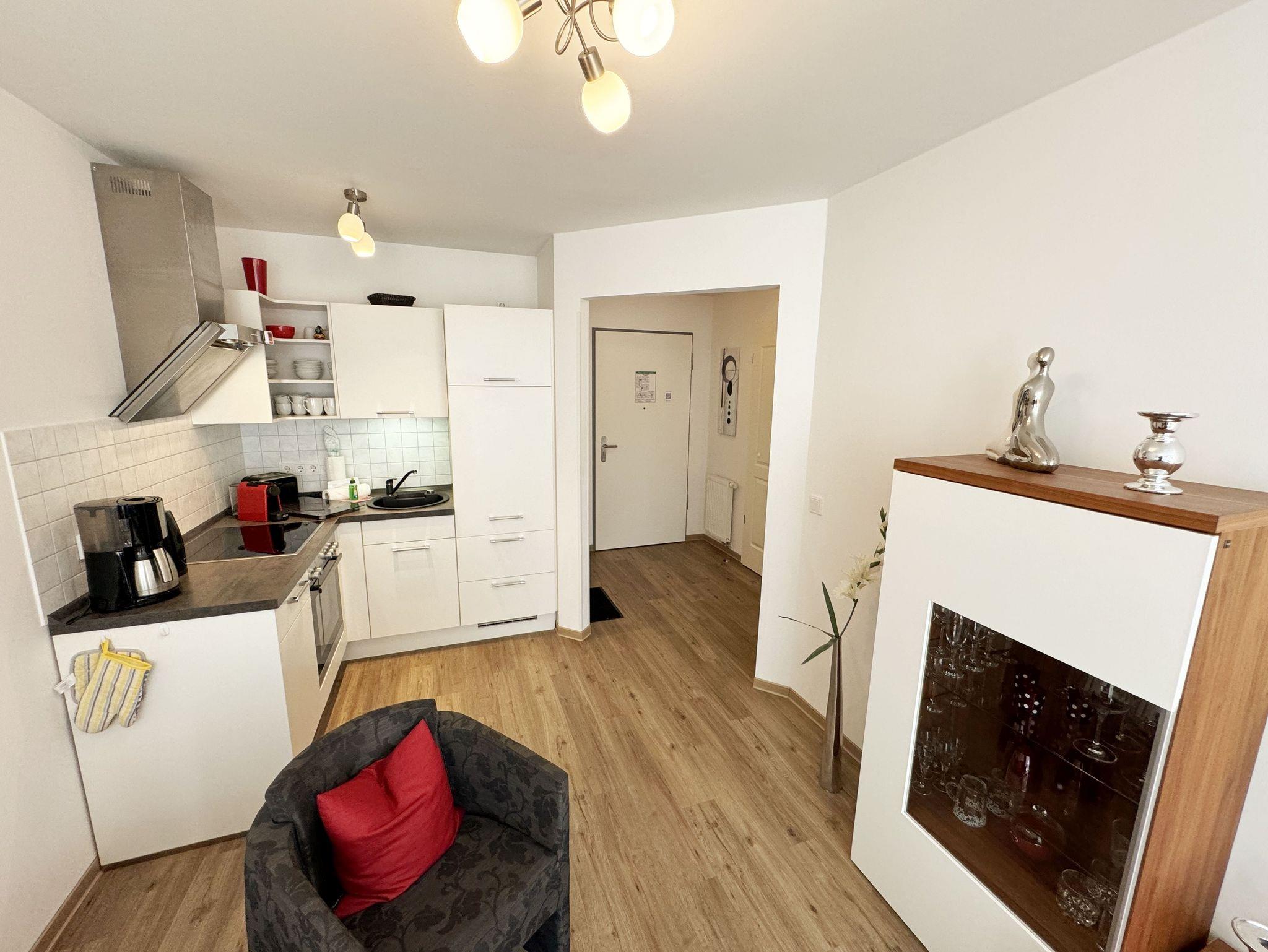 Ihre Nichtraucher/Ferienwohnung Ostseesilber ist mit viel Liebe zum Detail ausgestattet und eingerichtet worden. Sie wohnen in einer ca. 42 m² 2-Zimmer Wohnung, die für 2 Personen ausgelegt ist. Die Wohnung befindet sich in der 1. Etage und ist per Fahrstuhl vom Haupthaus A bequem zu erreichen. In der Wohnung finden Sie einen kombinierten Wohn/Koch- und Essbereich, der mit einem hochwertigen Fußbodenbelag versehen ist. Die integrierte helle Küchenzeile lässt mit Küchengeräten von Neff wie Backofen, Ceranfeld, Spülmaschine, Kühlschrank, Nespresso Maschine, Kaffeemaschine, Toaster, Wasserkocher und anderen praktischen Helfern keine Wünsche offen. Im Wohnbereich ist weiterhin eine Essecke mit Stühlen und Esstisch sowie ein gemütliches Sofa vorhanden. Abgerundet wird der Wohnbereich durch ein Flat-TV, DVD-Player, CD-Musikanlage und einer hellen Anrichte. Auf einen Internetanschluss (WLAN) müssen Sie im Urlaub nicht verzichten. Dieser ist für Sie inklusive. Der Balkon (Westen) ist vom Wohn/Essbereich begehbar und komplett möbliert. Die großen lichtdurchfluteten Balkonfenster lassen die Wohnung und die Möbel sehr schön zur Geltung kommen. Das moderne Schlafzimmer ist mit einem komfortablen Boxspringbett (durchgehende Matratze von 1,80m x 2,00m), mit einer hochwertigen durchgehenden Matratze, Nachttischkonsolen, einem 2-trg. Kleiderschrank und einem weiteren TV ausgestattet. Verdunklungsplissees im Schlafzimmer garantieren einen ruhigen Schlaf. Das Bad verfügt über eine ebenerdige Glasdusche, Fön, Waschbecken, WC und einen Handtuchtrockner. Ein eigener PKW-Stellplatz (Nr.85, Einfahrtshöhe 2,00m) befindet sich in der Tiefgarage des Hauses. Im Keller des Hauses haben Sie die Möglichkeit eine Waschmaschine/Trockner gegen Gebühr zu nutzen. Haustiere sind nicht erlaubt. Mit dem Fahrstuhl des Hauses A gelangen sie in das Untergeschoss der Meeresblickanlage, wo Sie ein großzügiger und heller Wellnessbereich erwartet. Hier können sie in einem Pool kleine Bahnen schwimmen, in 2 Saunen Ihren Kreislauf in Schwung bringen, in einem dazugehörigen Ruheraum Ihren Körper wieder beruhigen, in einer Schneckendusche sowie weiteren Duschen das kühle Nass genießen und auf einer Außenterrasse mit Außendusche die frische Luft einatmen. Die Erstausstattung eines Wäschepaketes (komplette Bettwäsche, 1 Duschhandtuch, 2 kleine Handtücher) können Sie bis 14 Tage vor Anreise gegen einen Aufpreis dazu buchen oder durch eigene ergänzen. Ab 2 gebuchten Paketen erhalten Sie einmalig 1 Geschirrhandtuch und 1 Duschvorleger hinzu.