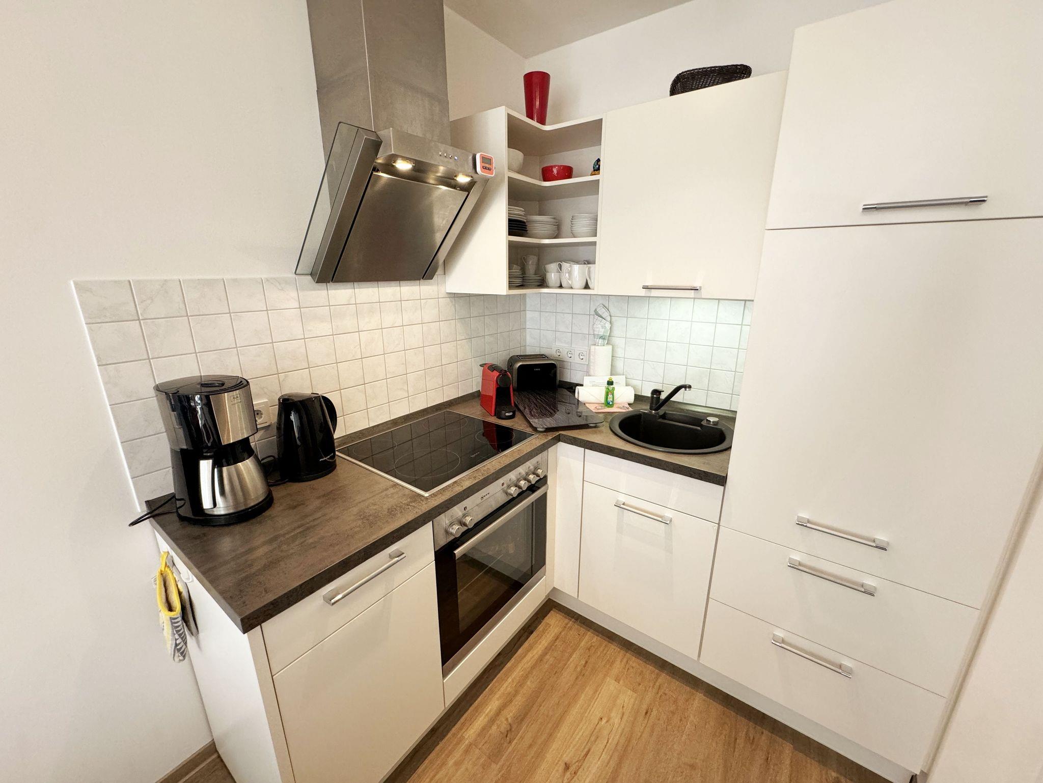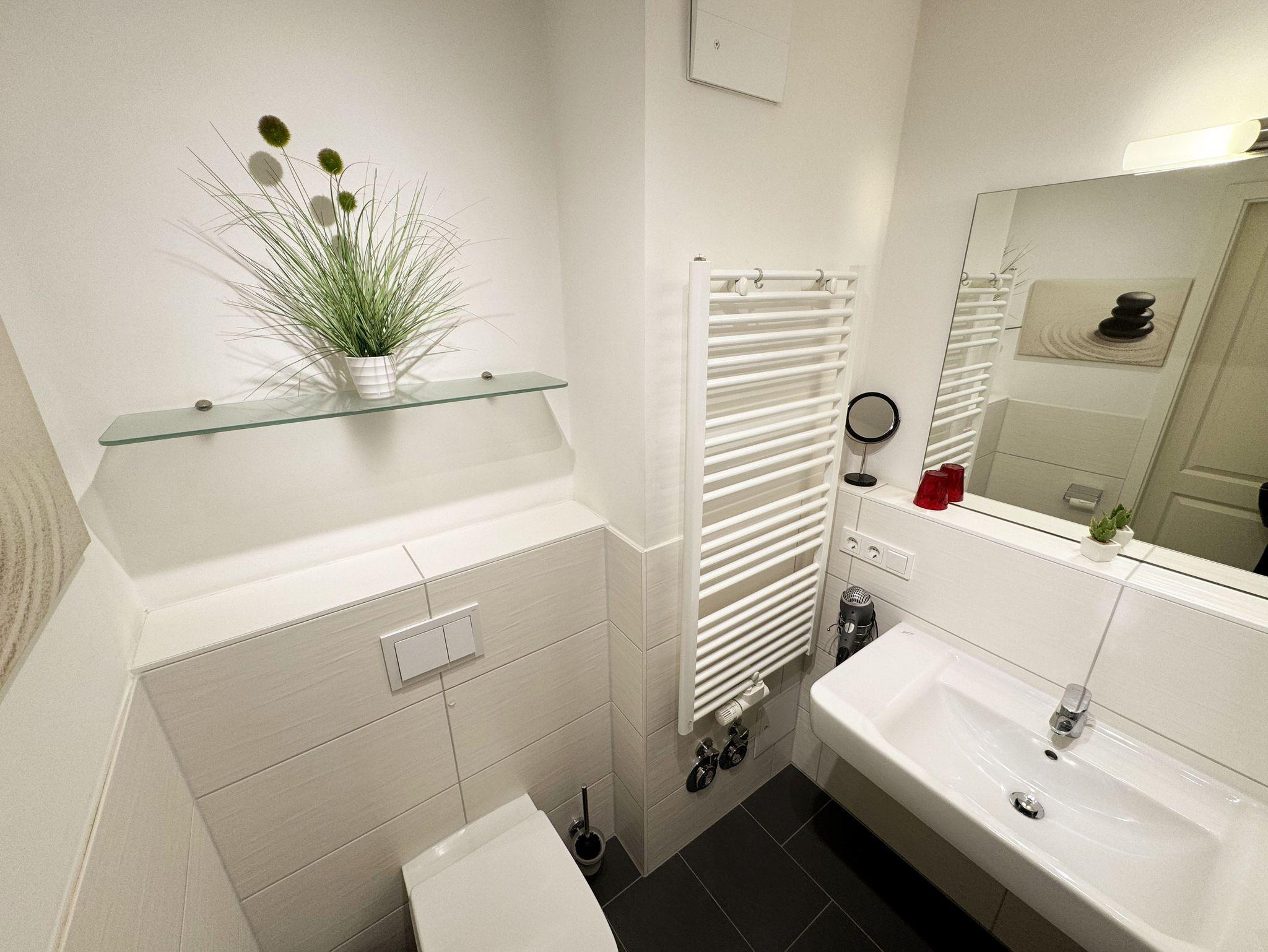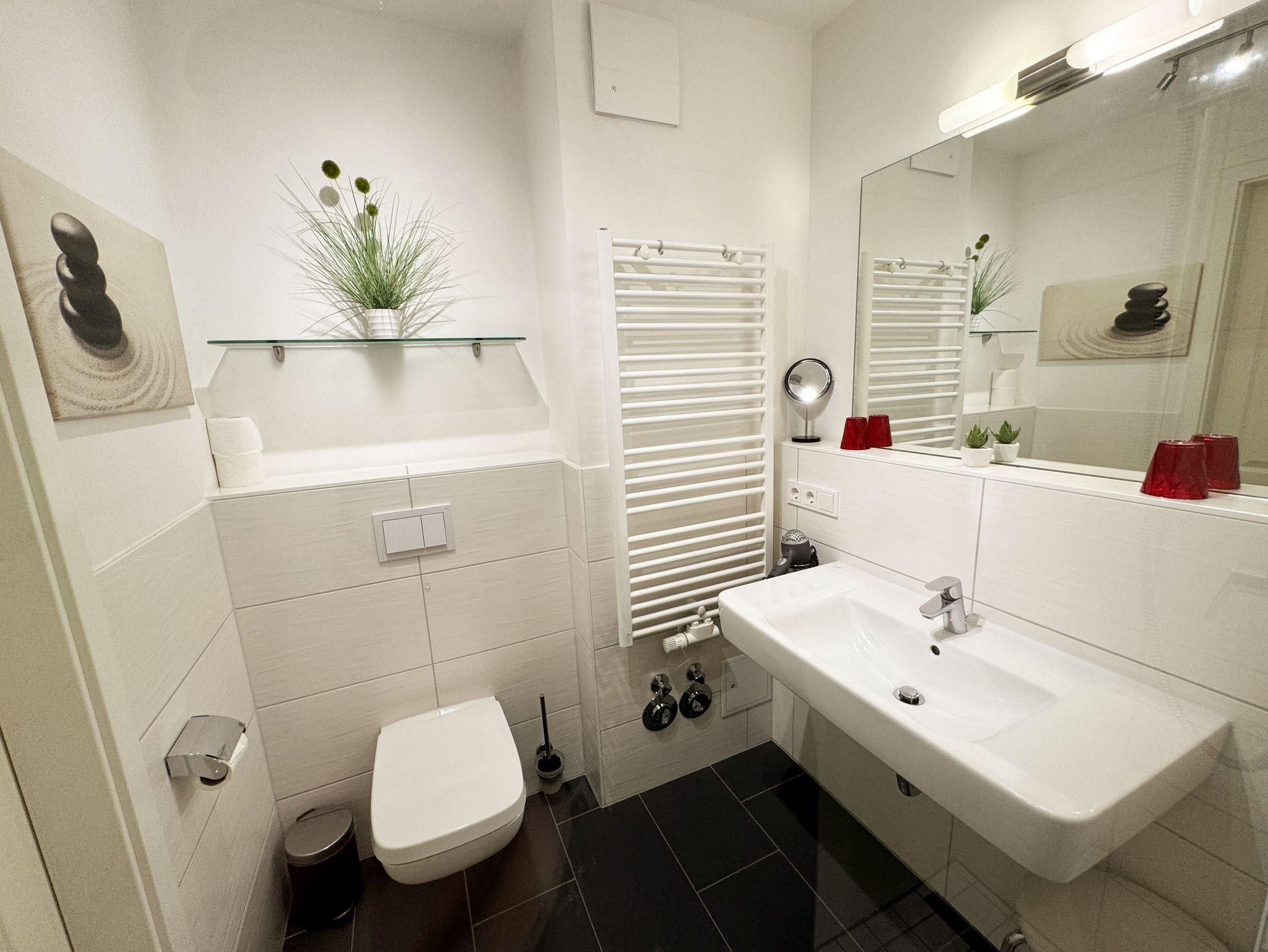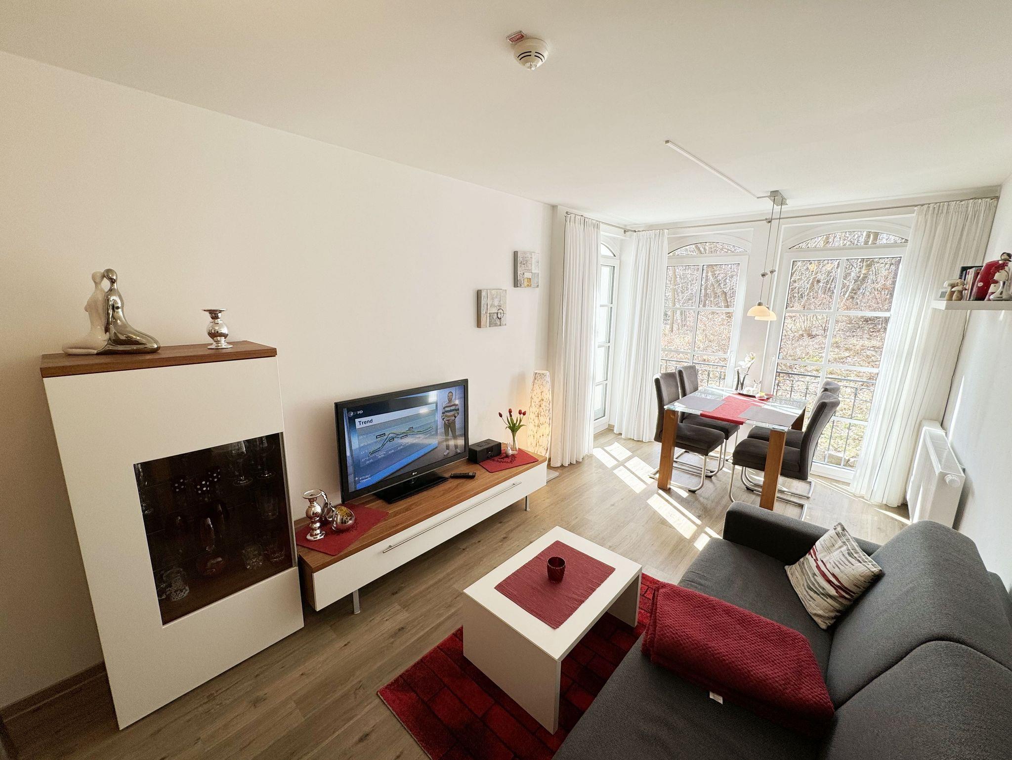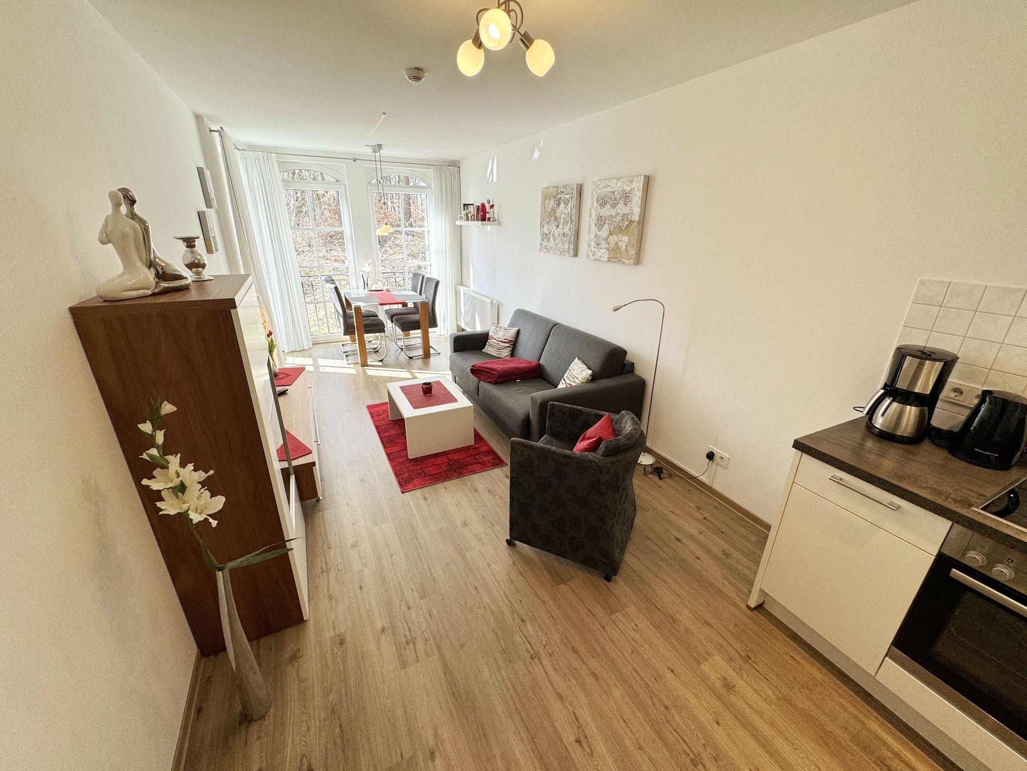 Ihre Nichtraucher/Ferienwohnung Ostseesilber ist mit viel Liebe zum Detail ausgestattet und eingerichtet worden. Sie wohnen in einer ca. 42 m² 2-Zimmer Wohnung, die für 2 Personen ausgelegt ist. Die Wohnung befindet sich in der 1. Etage und ist per Fahrstuhl vom Haupthaus A bequem zu erreichen. In der Wohnung finden Sie einen kombinierten Wohn/Koch- und Essbereich, der mit einem hochwertigen Fußbodenbelag versehen ist. Die integrierte helle Küchenzeile lässt mit Küchengeräten von Neff wie Backofen, Ceranfeld, Spülmaschine, Kühlschrank, Nespresso Maschine, Kaffeemaschine, Toaster, Wasserkocher und anderen praktischen Helfern keine Wünsche offen. Im Wohnbereich ist weiterhin eine Essecke mit Stühlen und Esstisch sowie ein gemütliches Sofa vorhanden. Abgerundet wird der Wohnbereich durch ein Flat-TV, DVD-Player, CD-Musikanlage und einer hellen Anrichte. Auf einen Internetanschluss (WLAN) müssen Sie im Urlaub nicht verzichten. Dieser ist für Sie inklusive. Der Balkon (Westen) ist vom Wohn/Essbereich begehbar und komplett möbliert. Die großen lichtdurchfluteten Balkonfenster lassen die Wohnung und die Möbel sehr schön zur Geltung kommen. Das moderne Schlafzimmer ist mit einem komfortablen Boxspringbett (durchgehende Matratze von 1,80m x 2,00m), mit einer hochwertigen durchgehenden Matratze, Nachttischkonsolen, einem 2-trg. Kleiderschrank und einem weiteren TV ausgestattet. Verdunklungsplissees im Schlafzimmer garantieren einen ruhigen Schlaf. Das Bad verfügt über eine ebenerdige Glasdusche, Fön, Waschbecken, WC und einen Handtuchtrockner. Ein eigener PKW-Stellplatz (Nr.85, Einfahrtshöhe 2,00m) befindet sich in der Tiefgarage des Hauses. Im Keller des Hauses haben Sie die Möglichkeit eine Waschmaschine/Trockner gegen Gebühr zu nutzen. Haustiere sind nicht erlaubt. Mit dem Fahrstuhl des Hauses A gelangen sie in das Untergeschoss der Meeresblickanlage, wo Sie ein großzügiger und heller Wellnessbereich erwartet. Hier können sie in einem Pool kleine Bahnen schwimmen, in 2 Saunen Ihren Kreislauf in Schwung bringen, in einem dazugehörigen Ruheraum Ihren Körper wieder beruhigen, in einer Schneckendusche sowie weiteren Duschen das kühle Nass genießen und auf einer Außenterrasse mit Außendusche die frische Luft einatmen. Die Erstausstattung eines Wäschepaketes (komplette Bettwäsche, 1 Duschhandtuch, 2 kleine Handtücher) können Sie bis 14 Tage vor Anreise gegen einen Aufpreis dazu buchen oder durch eigene ergänzen. Ab 2 gebuchten Paketen erhalten Sie einmalig 1 Geschirrhandtuch und 1 Duschvorleger hinzu.