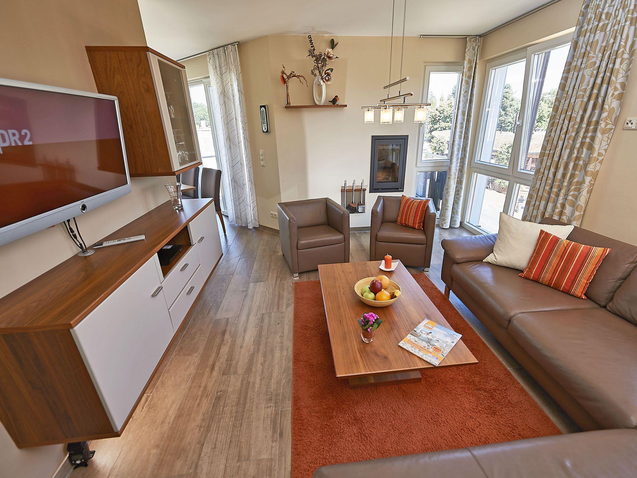Auf der unteren Ebene finden Sie den hochwertig ausgestatteten Wohn- und Essbereich mit einem Esstisch für 6 Personen.[nbsp] Entspannen Sie sich abends auf der gemütlichen Sofaecke und dem Sessel bei knisterndem Kaminfeuer (Kaminholz ist bitte selbst mitzubringen). Ein Flachbild-TV, ein Radio und kostenfreies W-LAN gehören ebenfalls zur Ausstattung.