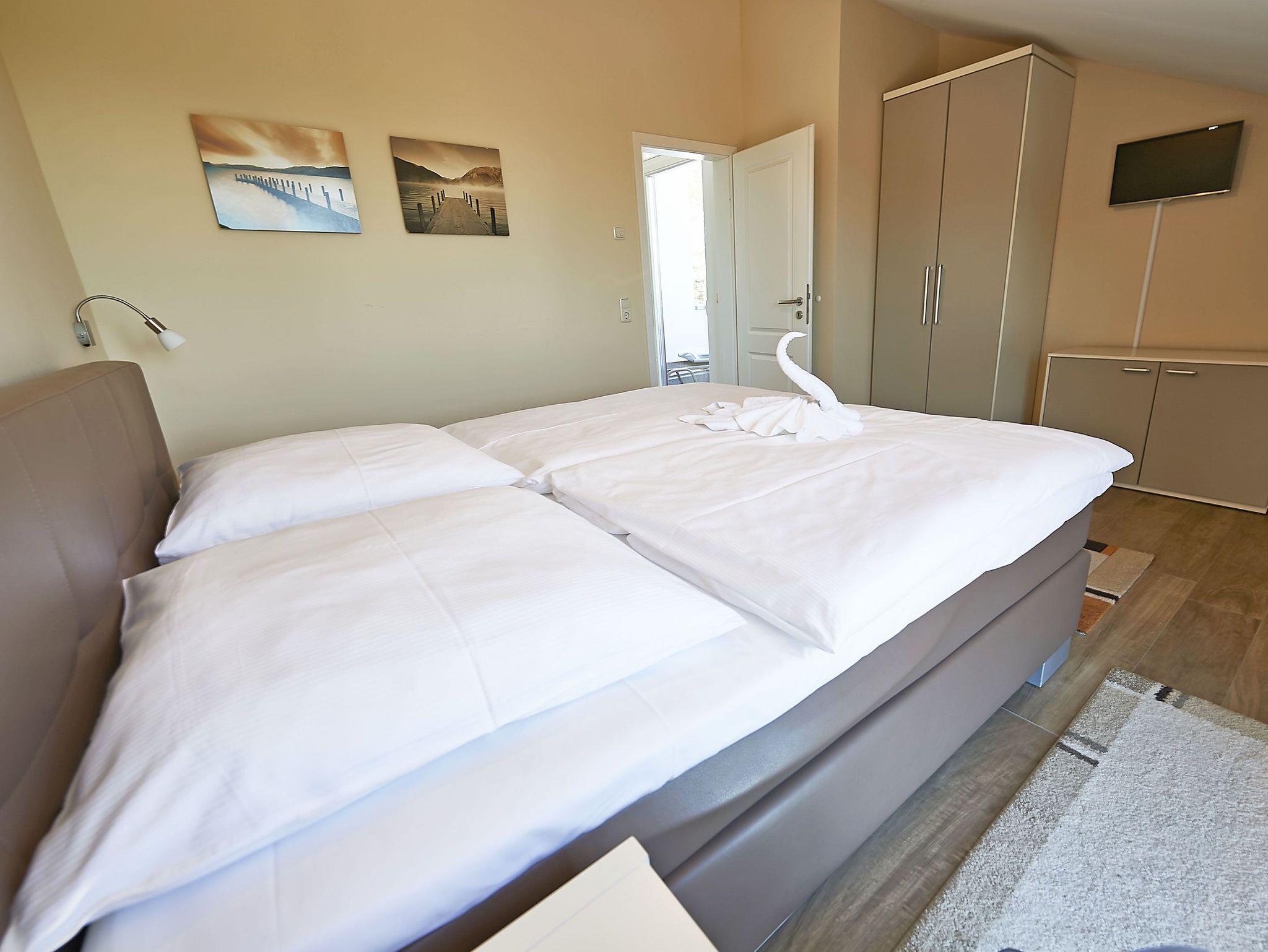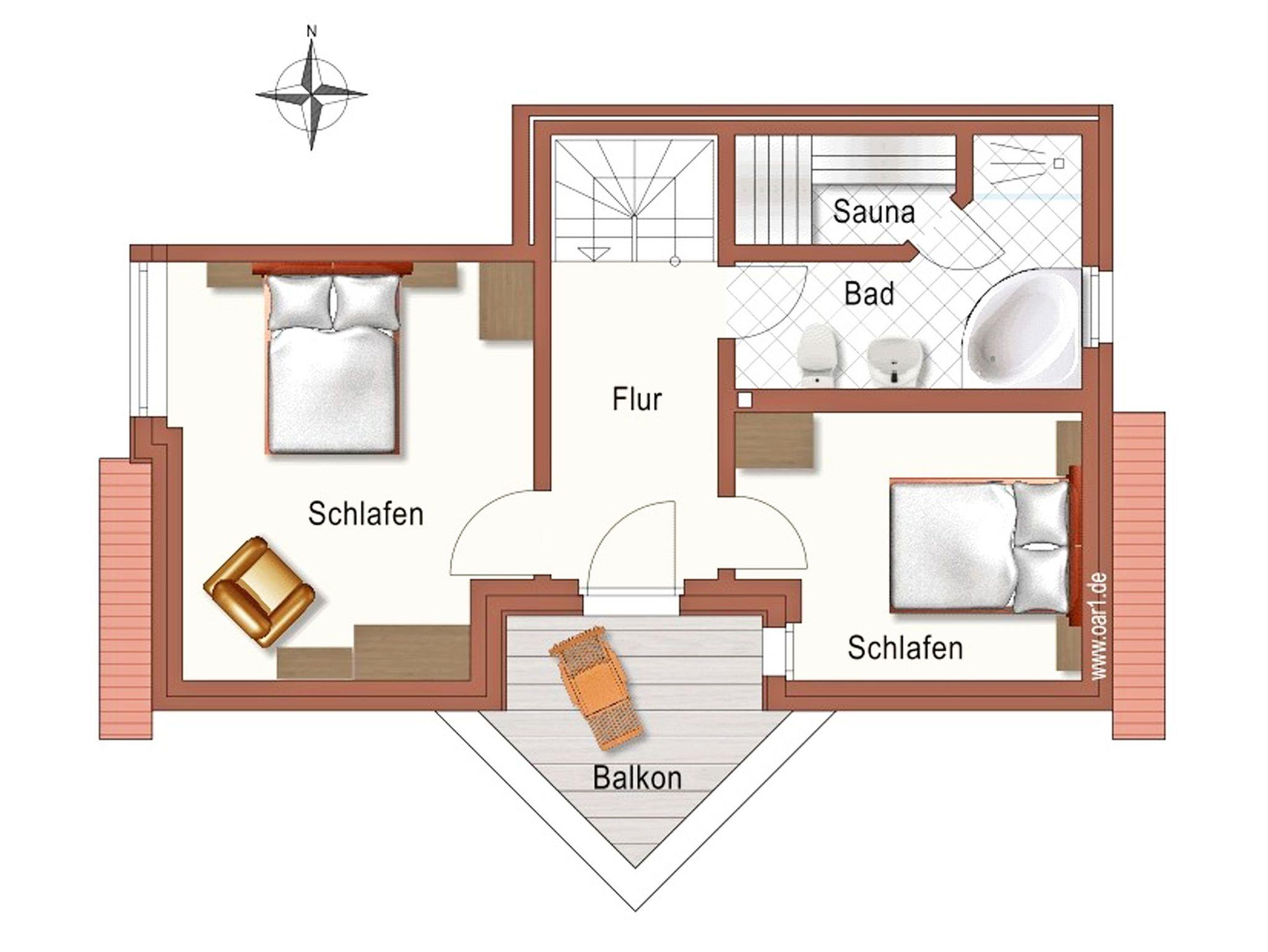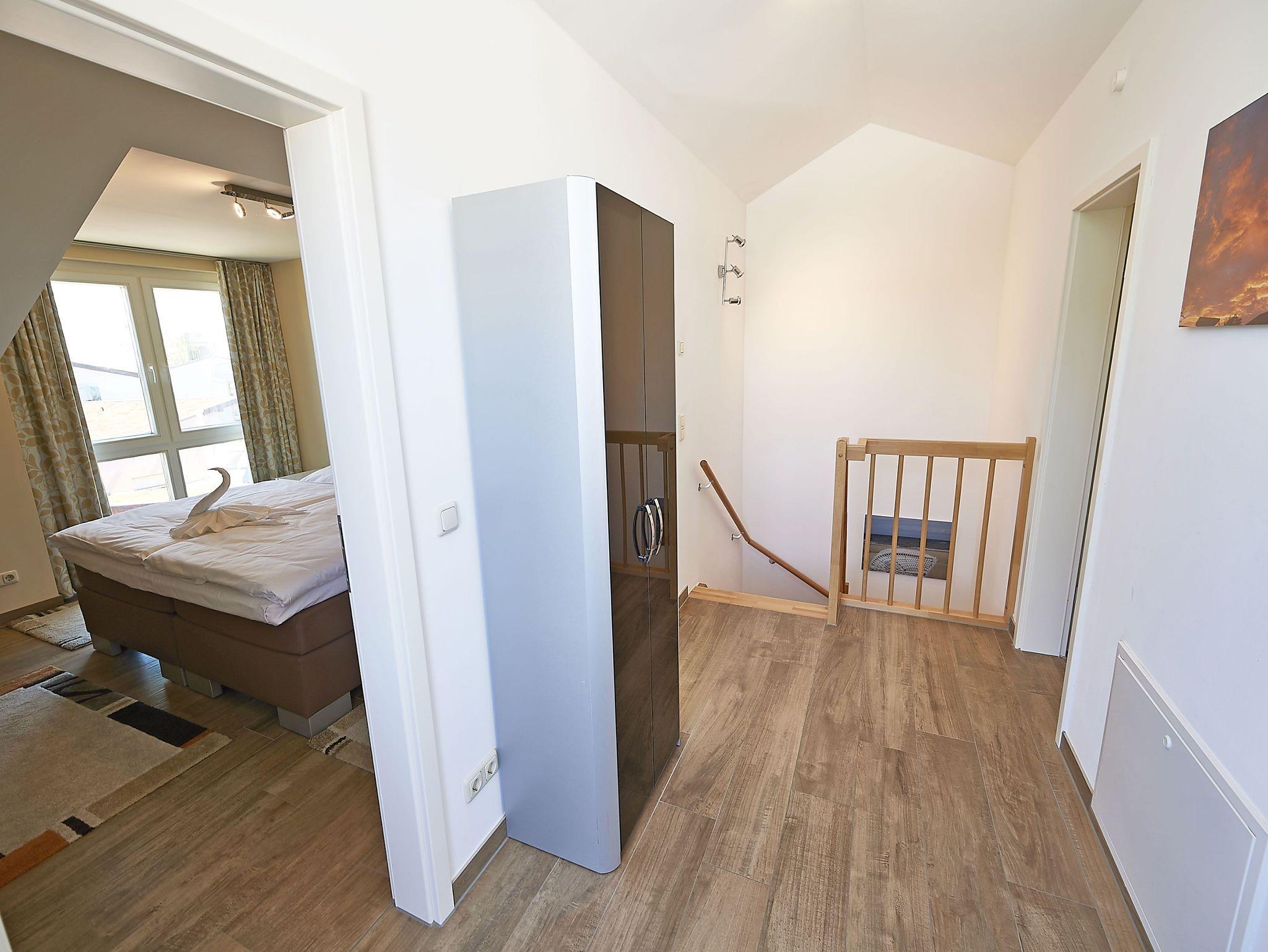 Über eine Treppe gelangen Sie in das obere Geschoss des Appartements. Hier gibt es 4 weitere Schlafmöglichkeiten. Die beiden Schlafzimmer sind ebenfalls mit je einem Boxspringbett (180 x 200 cm) und TV ausgestattet.