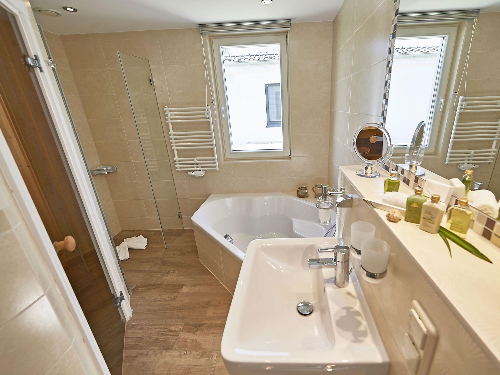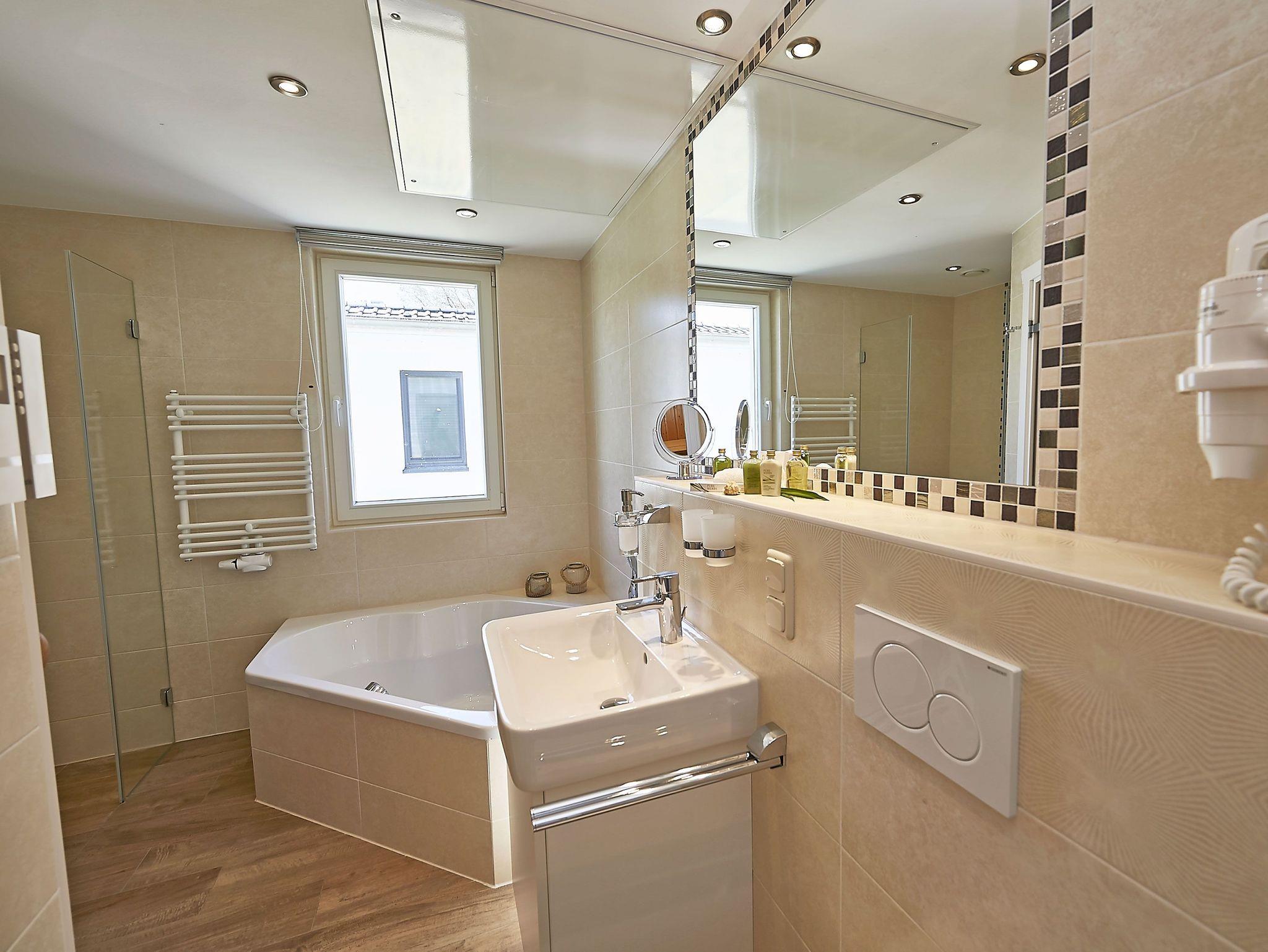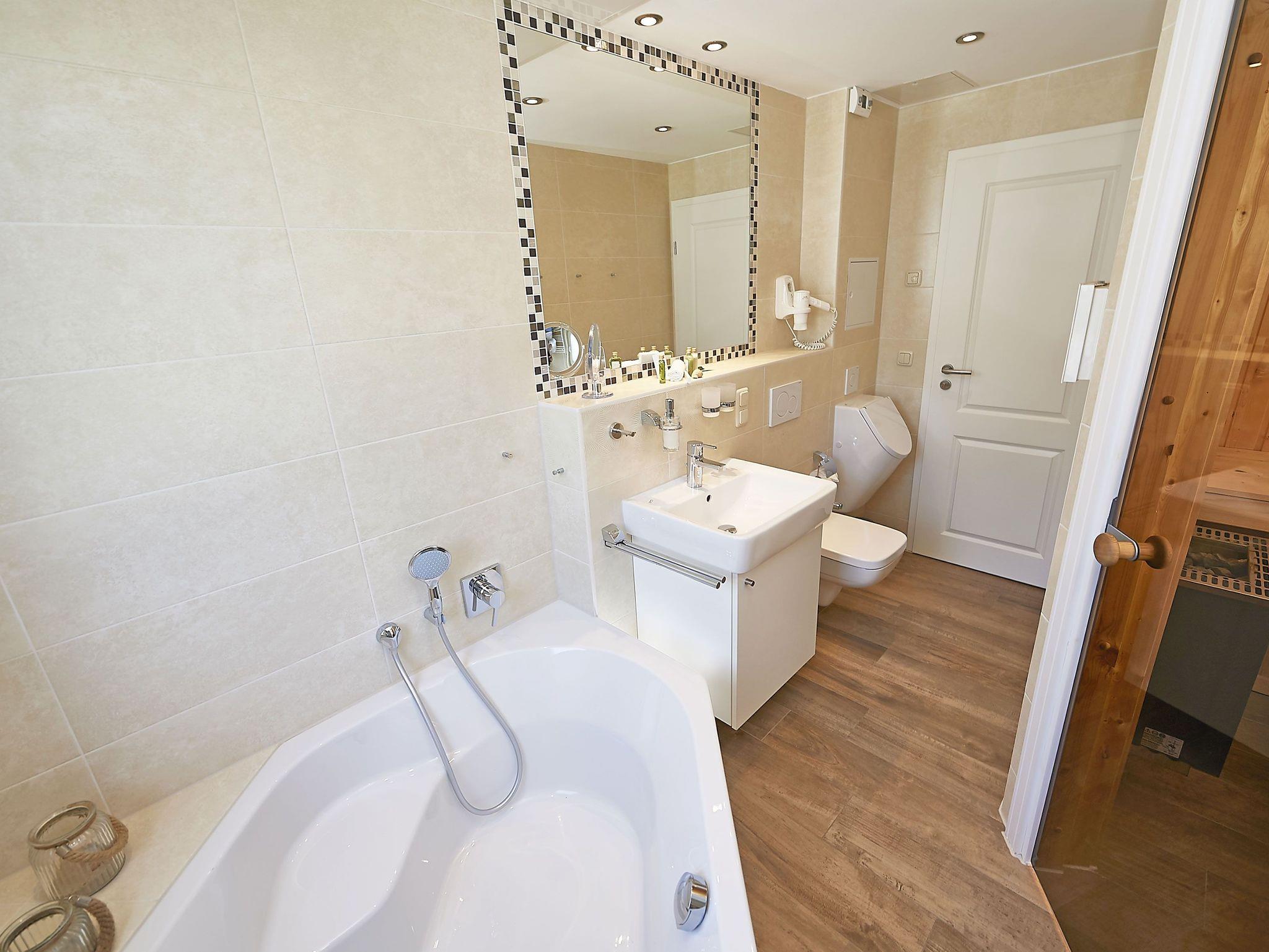 Sie gehen gerne saunieren? Dann werden Sie von dem Hauptbad begeistert sein. Hier finden Sie nämlich eine Sauna, Badewanne, Dusche und WC.