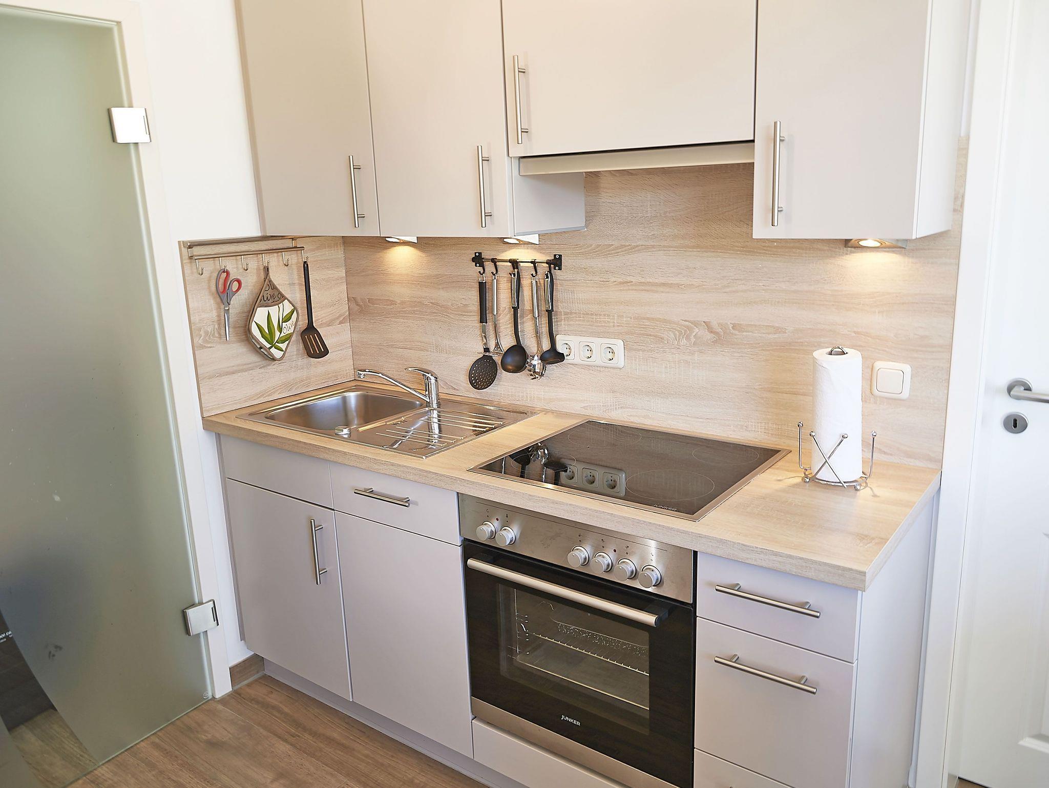 Die offene Küche wurde harmonisch in diesen Raum integriert und ist voll ausgestattet mit Geschirrspüler, Kühlschrank mit Gefrierfach, Backofen, Mikrowelle, Kaffeemaschine, Wasserkocher, Toaster und diversem Kleininventar.