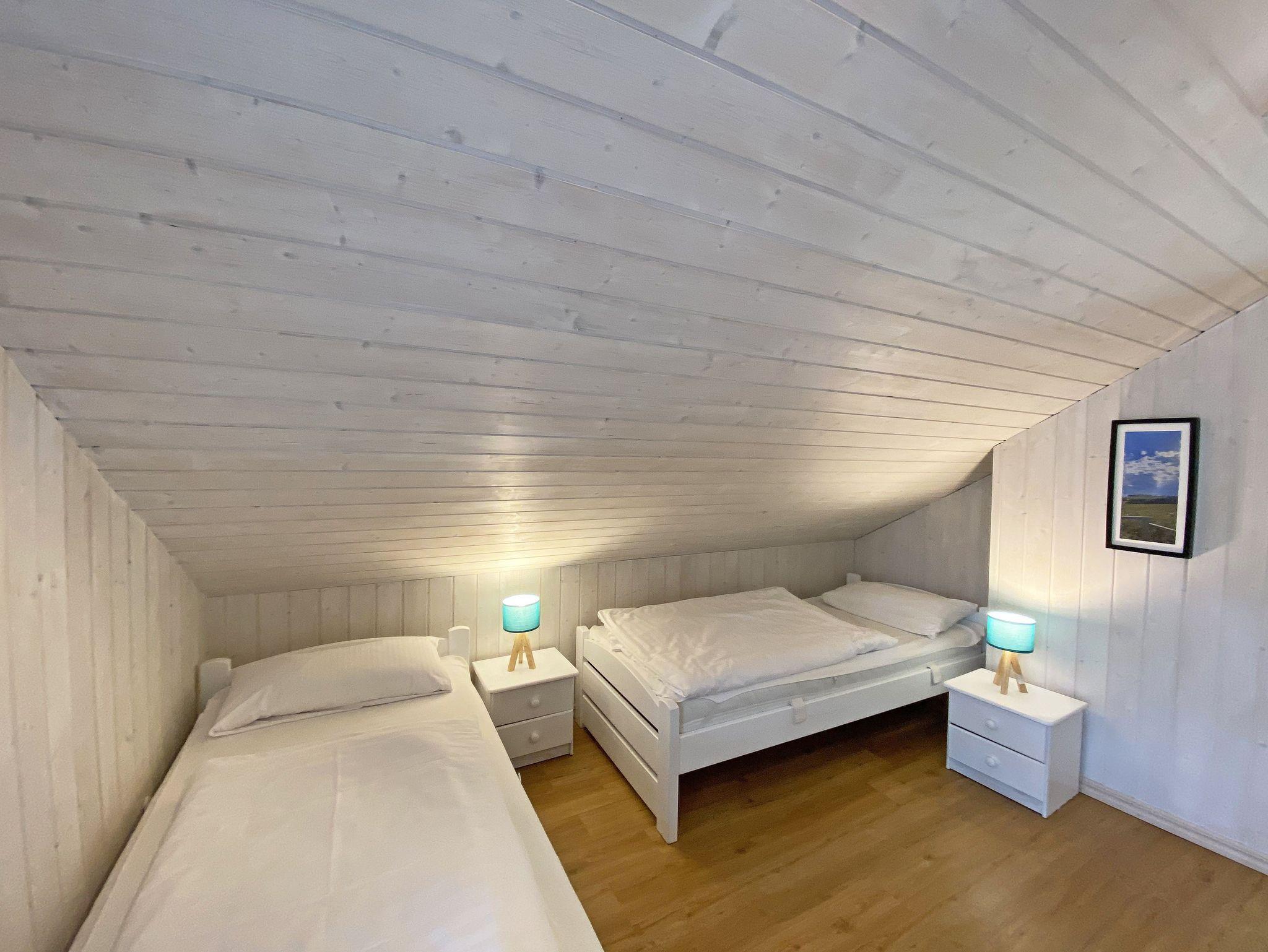 Das Nichtraucherferienhaus ist für max. 6 Erwachsene und 1 Kleinkind bis 3 Jahre im Kinderreisebett ausgestattet. Die 85 m² Wohnfläche ist im Erdgeschoss aufgeteilt in einen großen Wohnbereich mit offener Küche, separaten Essbereich und Sofaecke mit Leselampe, Kamin, Smart-TV mit Blue Ray-Player und Mini-Stereo-Anlage. Eine Kaminholzkiste ist für Sie von Oktober bis März inklusive. Eine Fußbodenheizung sorgt im Bad und im Wohnbereich für angenehme Wärme. Die Küchenzeile ist komplett mit Geschirrspüler, Mikrowelle, Backofen, Kühlschrank mit Eisfach, Cerankochfeld und diversen Küchenutensilien ausgestattet. Der Raum öffnet sich nach oben hin zu der im Obergeschoss liegenden Galerie, die mit zwei gemütlichen Relax Sesseln zum Verweilen einlädt und einen wunderschönen Blick in die Natur freigibt. Die Fensterfront zum Dünenwald nimmt den gesamten Giebelbereich des Hauses ein, sodass diese lichtdurchflutet und freundlich ist. Ebenfalls im Erdgeschoss des Ferienhauses befindet sich das großzügig geschnittene Bad mit Dusche, Whirlpool, Sauna, Fußbodenheizung, Waschplatz, WC, Kosmetikspiegel, Fön und Waschmaschine. Auch ein Schlafzimmer mit Doppelbett (1,60 m x 2,00 m), Nachttischablagen und Kleiderschrank befindet sich hier. Durch eine Holztreppe gelangen Sie ins Obergeschoss wo sich neben der offenen Galerie zwei weitere Schlafzimmer mit einem Doppelbett (1,80 m x 2,00 m) und mit 2 Einzelbetten (á 0,90 m x 2,00 m), Nachttischablagen, Kleiderschrank und jeweils separatem Zugang zum Balkon, befinden. Insektenschutzgitter wurden an den Fenstern angebracht, um Ihnen einen angenehmen Schlaf zu bereiten. Ein Gäste-WC mit Dusche und Waschplatz rundet den oberen Bereich ab. 1x Kinderreisebett (ohne Zusatzmatratze/ ohne Bett Inlett) und 1x Hochstuhl für die kleinsten Gäste sind inklusive vorhanden. Die großflächige und bestuhlte Terrasse (Süd/Ost) mit Zugang vom Wohnbereich bietet Ihnen die Gelegenheit die Natur direkt zu genießen. Sollte sich das Wetter mal nicht von der besten Seite zeigen, holen Sie einfach die vorhandenen Gesellschaftsspiele oder die DVDs heraus und beschließen den Tag mit einem gemütlichen Raclette Abend. Auch auf einen Internetanschluss (WLAN) müssen Sie im Urlaub nicht verzichten. Dieser ist für Sie inklusive. 2 Hunde (keine Katzen) sind gegen eine Gebühr mit eigenem, mitgebrachten Schlafplatz bei uns herzlich willkommen. Ein Sack Kaminholz ist in der Zeit vom 01.Oktober bis 31. März für Sie inklusive. Ein PKW-Stellplatz (Nr. 267) befindet sich in der Nähe des Hauses. Ihre geliehenen oder auch mitgebrachten Fahrräder können Sie im Anbau unterstellen. Die Erstausstattung eines Wäschepaketes (komplette Bettwäsche, 1 Duschhandtuch, 2 kleine Handtücher) können Sie bis 14 Tage vor Anreise gegen einen Aufpreis dazu buchen oder durch eigene ergänzen. Ab 2 gebuchten Paketen erhalten Sie einmalig 1 Geschirrhandtuch und 1 Duschvorleger dazu.