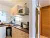 Die offene Küche ist mit einem kleinen Kochfeld, einem Kühlschrank, Kaffeefiltermaschine, Wasserkocher, Toaster sowie einer Mikrowelle ausgestattet. Ein kleiner Essbereich rundet das Gesamtangebot ab. Im Schlafbereich befindet sich ein Doppelstockbett, ein Einzelbett und ein Kleiderschrank.