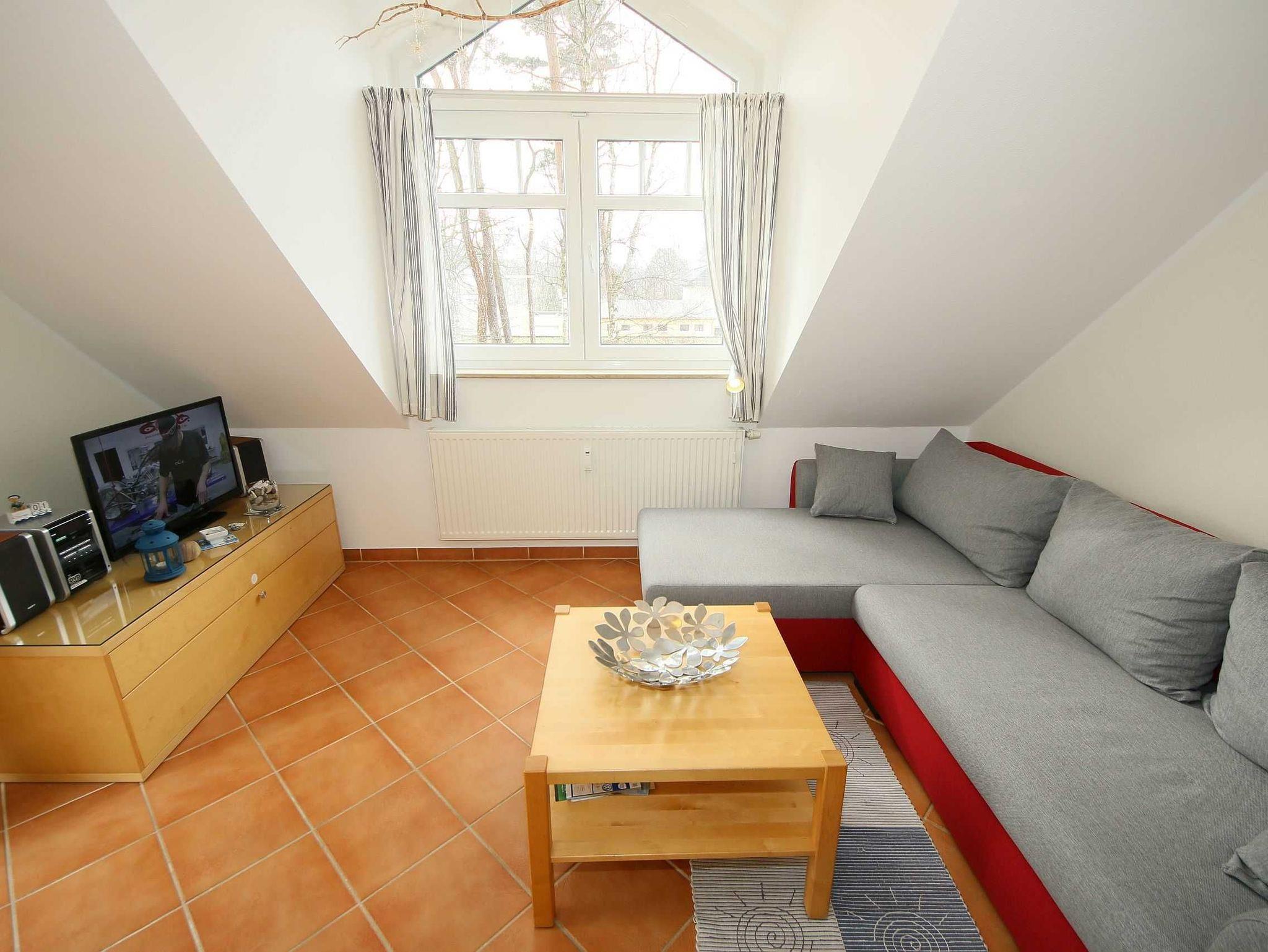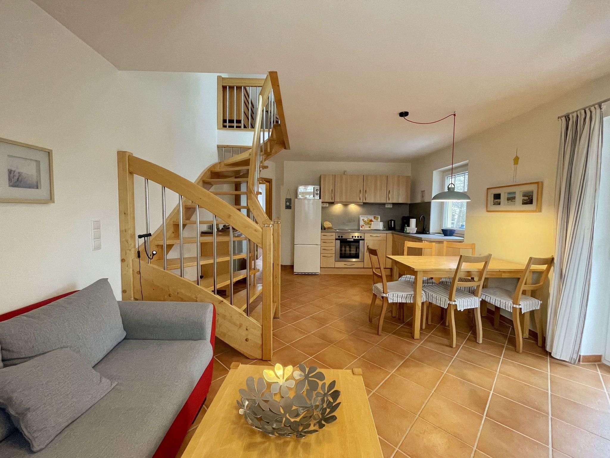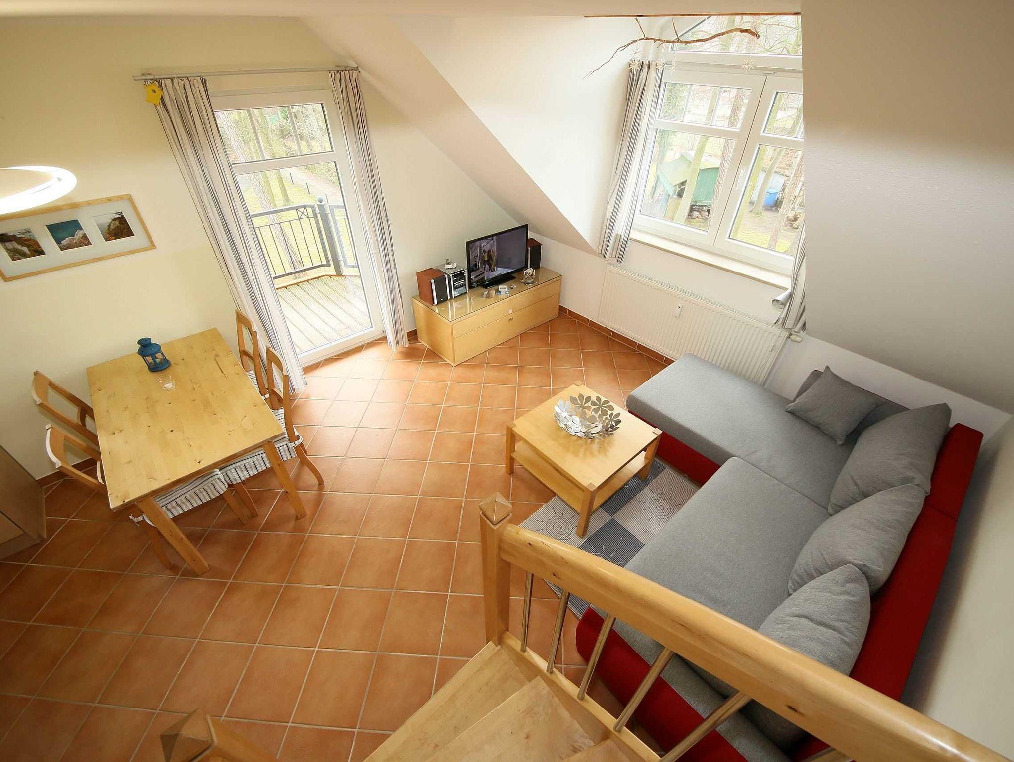 Die helle, freundliche 3-Raum-Maisonettewohnung (Nichtraucher) verläuft über 2 Etagen (mit Dachschrägen). Die Wohnung liegt im 2. Obergeschoss und hat einen großzügigen Wohnraum mit offener Küche, ein separates Schlafzimmer, einen mit einer bequemen Treppe erreichbaren, offenen Bodenraum (2. Schlafzimmer), das Bad sowie einen Abstellraum. Mit ihren ca. 60 m² bietet sie Platz für 2 bis max. 4 Erwachsene und 1 Kleinkind bis 3 Jahre im Kindereisebett. Die technische Ausstattung im Wohnraum lässt keine Wünsche offen: mit Smart-TV, DAB-Radio mit CD-Player sowie einer kostenfreien WLAN/LAN-Verbindung haben Sie alle modernen Informationsmedien an Bord. Eine gemütliche Couchecke mit Couchtisch und Leselampe komplettiert den Wohnraum. Der nach Südosten ausgerichtete, großzügige Balkon mit ca. 10 m² bietet Ihnen Blick auf den alten Baumbestand des Gartens und ist der ideale Platz für ein sonniges Frühstück. Hier kann Sie höchstens das Zwitschern der Vögel stören. Den bestuhlten Balkon erreichen Sie vom Wohnbereich. Das untere Schlafzimmer verfügt über ein Doppelbett mit 2 Einzelkaltschaummatratzen (2 x 0,90 m x 2,00 m), Nachtischablagen, Flachbild-TV und einem Kleiderschrank. Hier findet man auch Platz, um das Kinderreisebett aufzustellen. Im offenen Dachschlafzimmer finden Sie 2 zusammengestellte Einzelbetten (je 0,90 m x 2,00 m) mit Kaltschaummatratzen sowie eine Kommode. Die Betten in beiden Schlafzimmern sind aus Massivholz. Die Schlafräume verfügen über Verdunkelungsmöglichkeiten sowie Insektenschutz. Die solide eingerichtete Küchenzeile lässt mit Cerankochfeld, Backofen, Kühl- Gefrierkombi, Mikrowelle, Spülmaschine, Kaffeemaschine, Wasserkocher, Mixer und Toaster keine Wünsche offen. Damit steht dem Zubereiten von kulinarischen Genüssen nichts im Wege. Der Esstisch mit 4 Stühlen grenzt am Wohnbereich. Das geflieste und mit Fußbodenheizung versehende Badezimmer ist mit Dusche, WC, Waschplatz, Fön und einer Waschmaschine (Münzgerät: 30 min á 0,50 Euro) ausgestattet. Der Heizkörper ist als Handtuchtrockner ausgelegt. Im Abstellraum können Sie Ihre Koffer verstauen. Zusätzlich finden Sie hier auch Reinigungsutensilien, einen Wäscheständer sowie inklusive 1x Kinderreisebett (ohne zusätzliche Matratze und Bett Inlett) und 1x Hochstuhl. Wir haben viel Wert auf eine möglichst allergikerfreundliche Ausstattung gelegt. So haben wir keine textilen Bodenbeläge verwendet. Alle Anstriche sind mit hochwertigen Silikatfarben ausgeführt. Haustiere sind aus diesem Grund auch nicht erlaubt. Ein PKW-Stellplatz Nr. 09 befindet sich direkt am Objekt. Die Erstausstattung eines Wäschepaketes (komplette Bettwäsche, 1 Duschhandtuch, 1 kleines Handtuch) können Sie bis 14 Tage vor Anreise gegen einen Aufpreis dazu buchen oder durch eigene ergänzen. Ab 2 gebuchten Paketen erhalten Sie einmalig 1 Geschirrhandtuch und 1 Duschvorleger hinzu.