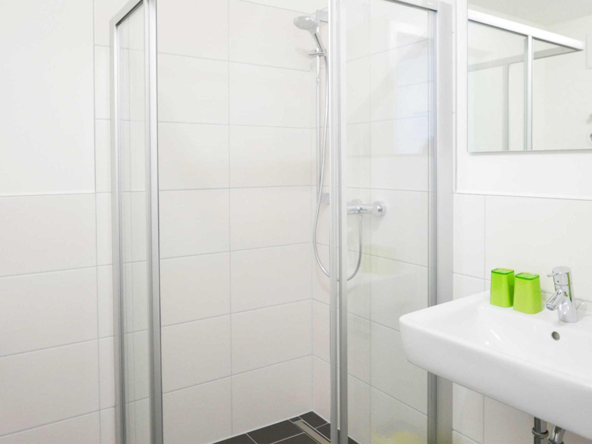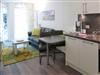 Der Wohn-/Essbereich verfügt über eine moderne Küchenzeile, einem Essplatz sowie einem gemütlichen Sofabereich und Zugang zu der Terrasse. Zwei Flachbildfernseher sind ebenfalls vorhanden. Grüne Farbakzente sorgen für eine freundliche Atmosphäre. Genießen sie den Blick ins Freie von der schönen kleinen Terrasse.