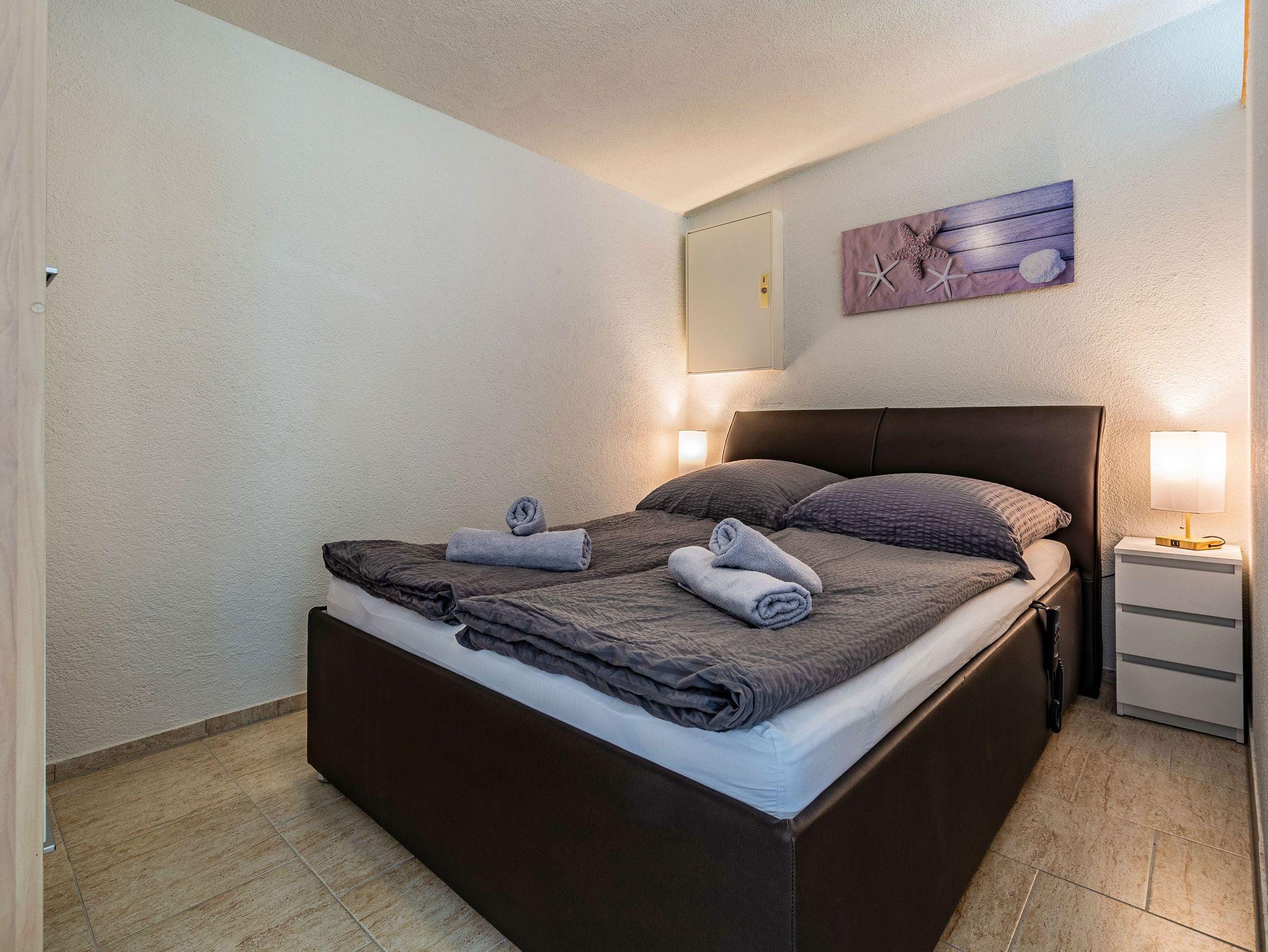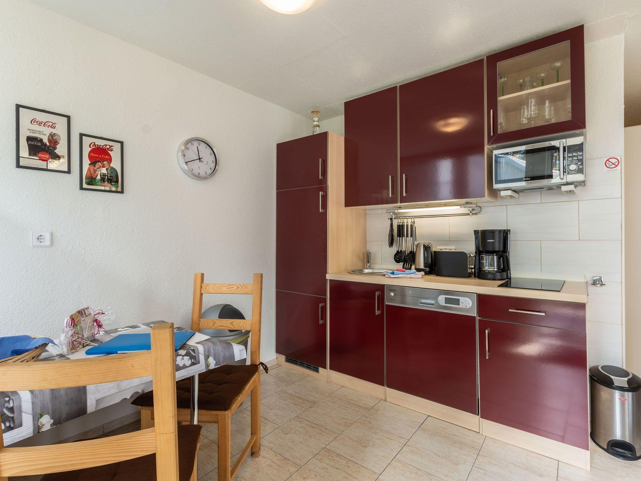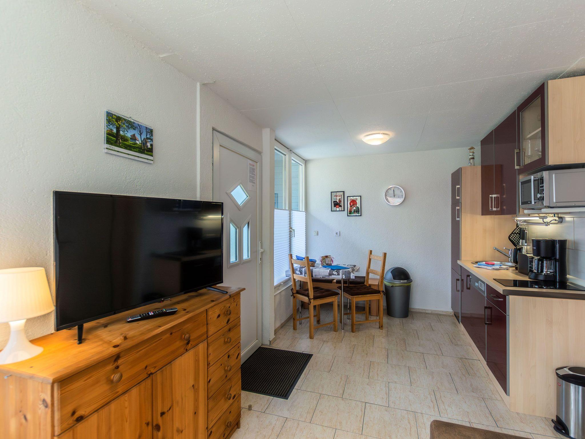 Die offene Küche ist mit einem kleinen Kochfeld, einem Geschirrspüler, einem Kühlschrank mit Tiefkühlfach, Kaffeefiltermaschine, Wasserkocher, Toaster sowie einer Mikrowelle ausgestattet. Ein kleiner Essbereich rundet das Gesamtangebot ab. Im Schlafbereich befinden sich 2 Einzelbetten und ein Kleiderschrank.