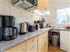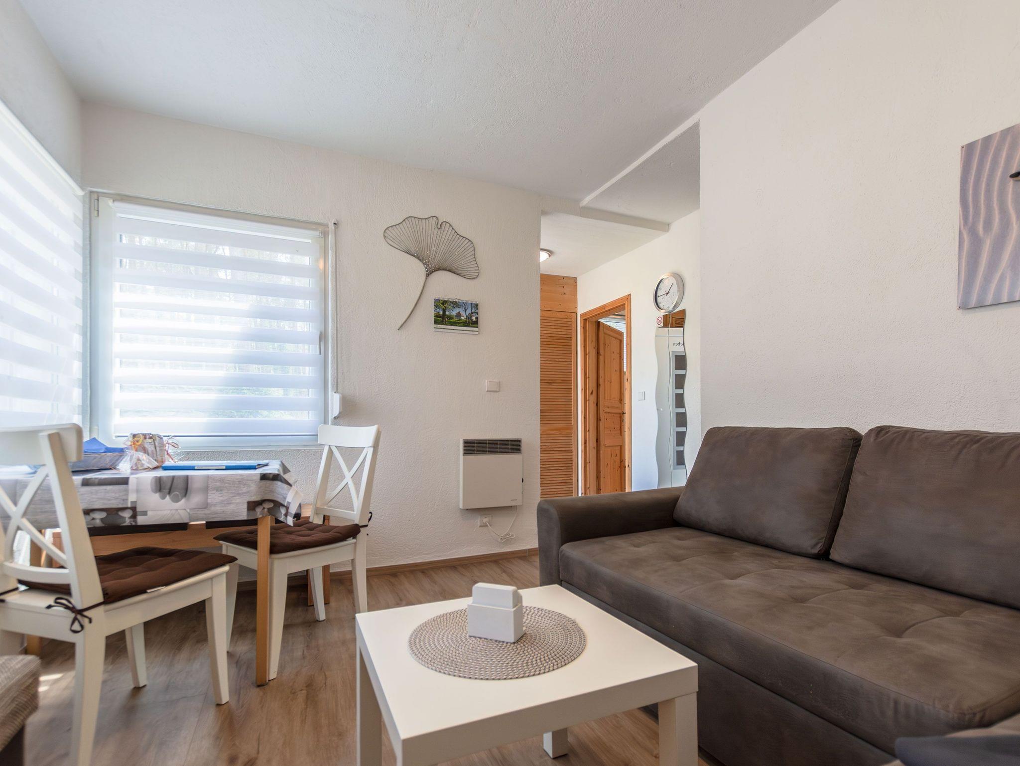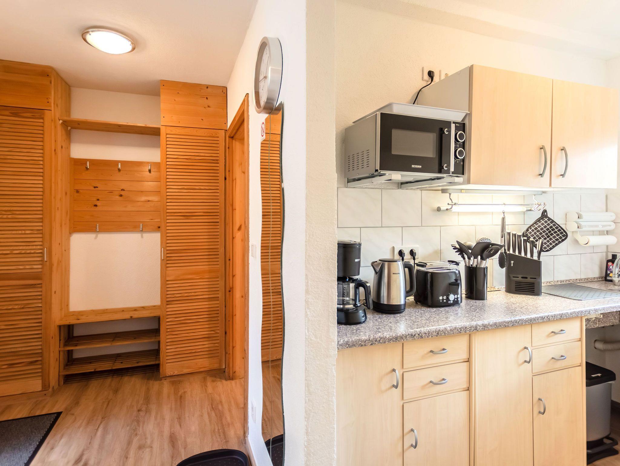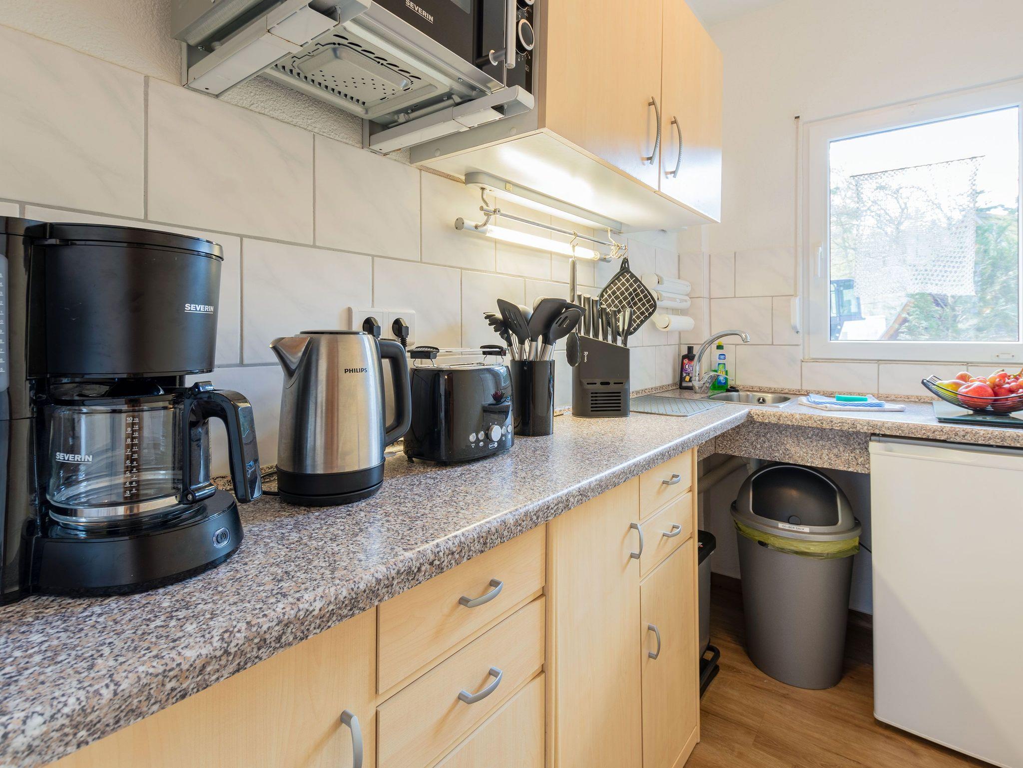 Die offene Küche ist mit einem kleinen Kochfeld, einem Kühlschrank, Kaffeefiltermaschine, Wasserkocher, Toaster sowie einer Mikrowelle ausgestattet. Ein kleiner Essbereich rundet das Gesamtangebot ab. Im Schlafbereich befindet sich ein Doppelbett (140x200) und ein Kleiderschrank.