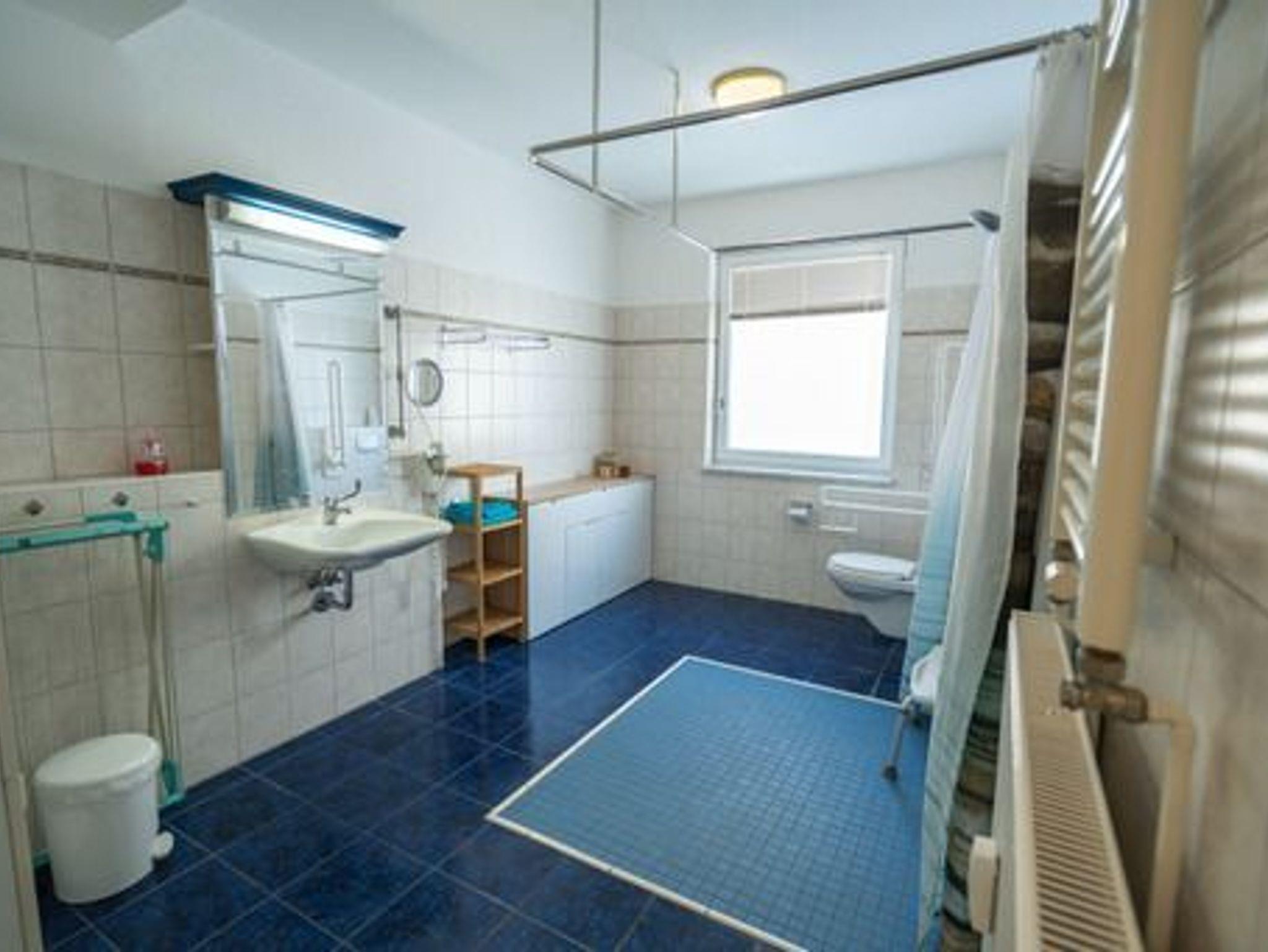 Wir bieten ihnen einen kombinierten Wohn und Schlafraum mit integrierter Küchenzeile. Rollstuhlgerechtes Badezimmer mit ebenerdig befahrbarer Dusche, Duschklappsitz, - Haltegriffe an Dusche sowie WC, Waschbecken unterfahrbar, Spiegel in Sitzposition - Waschmaschine- Kleiderschrank mit Zimmersafe, Garderobe, Koffer- und Schuhständer. Die Küche ist mit einem Kühlschrank, Kochfeld, Backofen, Geschirrspüler, Toaster, Wasserkocher, Kaffeemaschine sowie einer Mikrowelle ausgestattet.Küchenutensilien sowie vom Teller bis zum Löffel ist alles vorhanden.(Herd und Waschbecken sind unterfahrbar). LCD-Flachbildfernseher mit Satellitenreceiver.