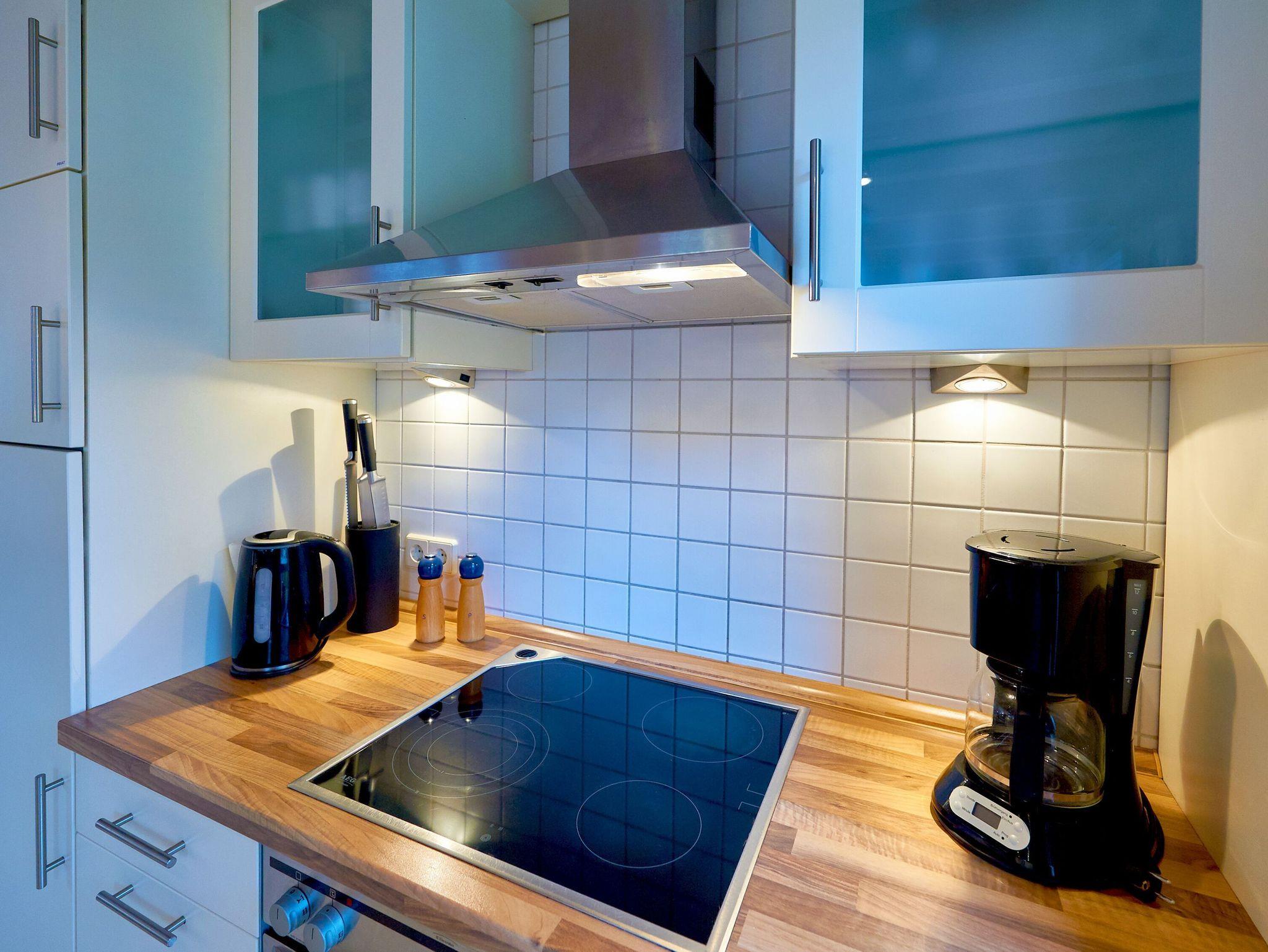Im Erdgeschoss befindet sich das kombinierte Wohn-/Esszimmer mit großem Esstisch, einer bequemen Polsterecke, Kaminofen, Flachbild-TV und Stereoanlage. Die vorgelagerte Terrasse ist saisonal von ca. Mai bis Ende September möbliert. Die harmonisch in den Raum integrierte Küchenzeile ist mit einem 4-Platten-Cerankochfeld, Backofen, Kühlschrank, Geschirrspülmaschine, Mikrowelle und diversem Kleininventar ausgestattet, so dass man sich bequem selbst bekochen kann. In fußläufiger Entfernung vom Ferienhaus gibt es darüber hinaus einige einladende Restaurants und natürlich auch einen Backshop.