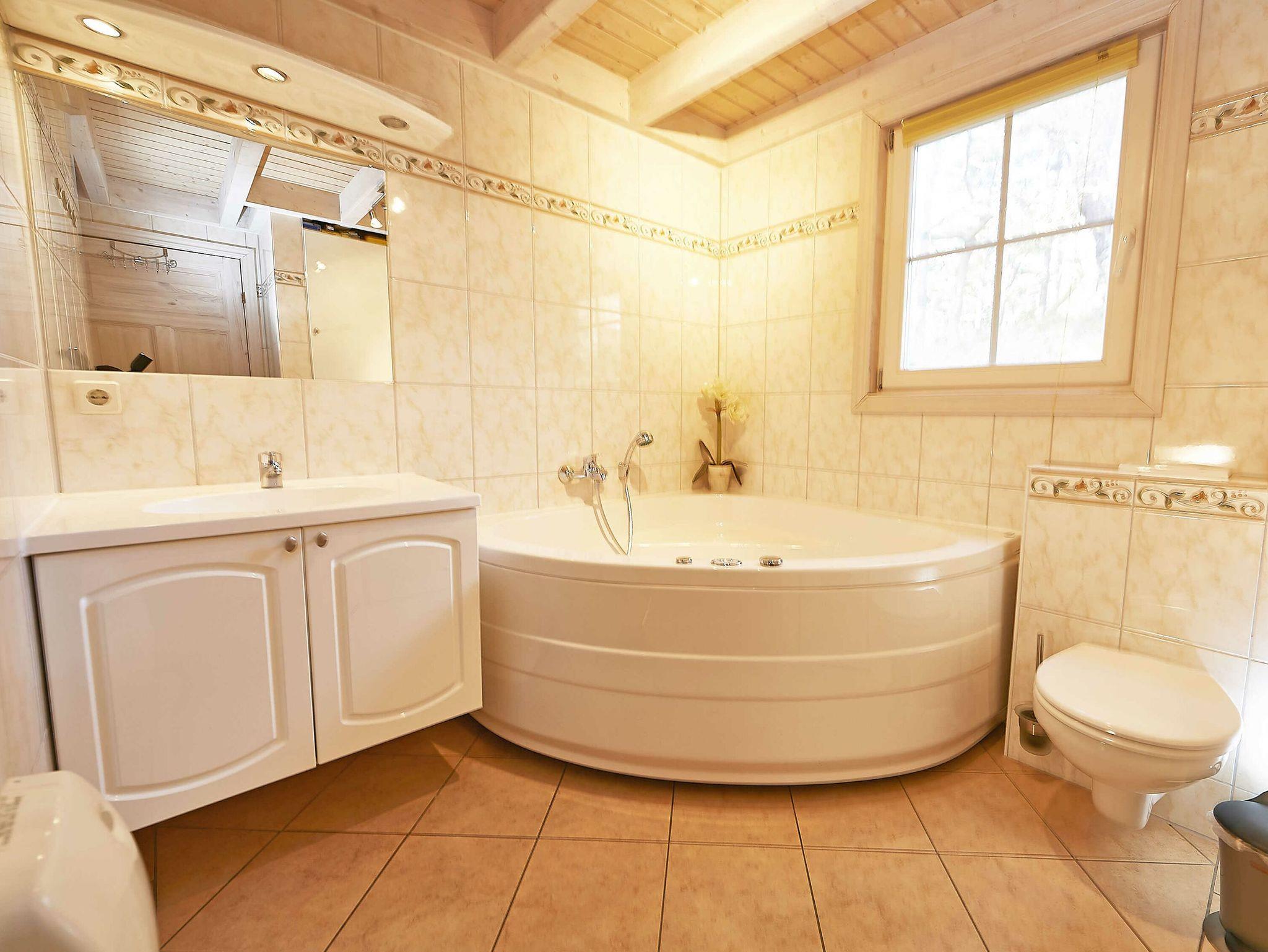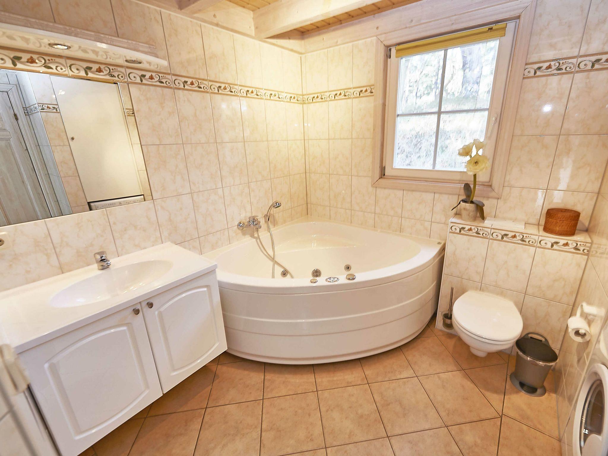 Weiterhin gibt es im Erdgeschoss das Hauptbadezimmer mit Dusche/WC, Badewanne mit Whirlpoolfunktion, privater Sauna und Waschmaschine sowie eines der insgesamt drei Schlafzimmer, ausgestattet mit einem komfortablen Doppelbett.