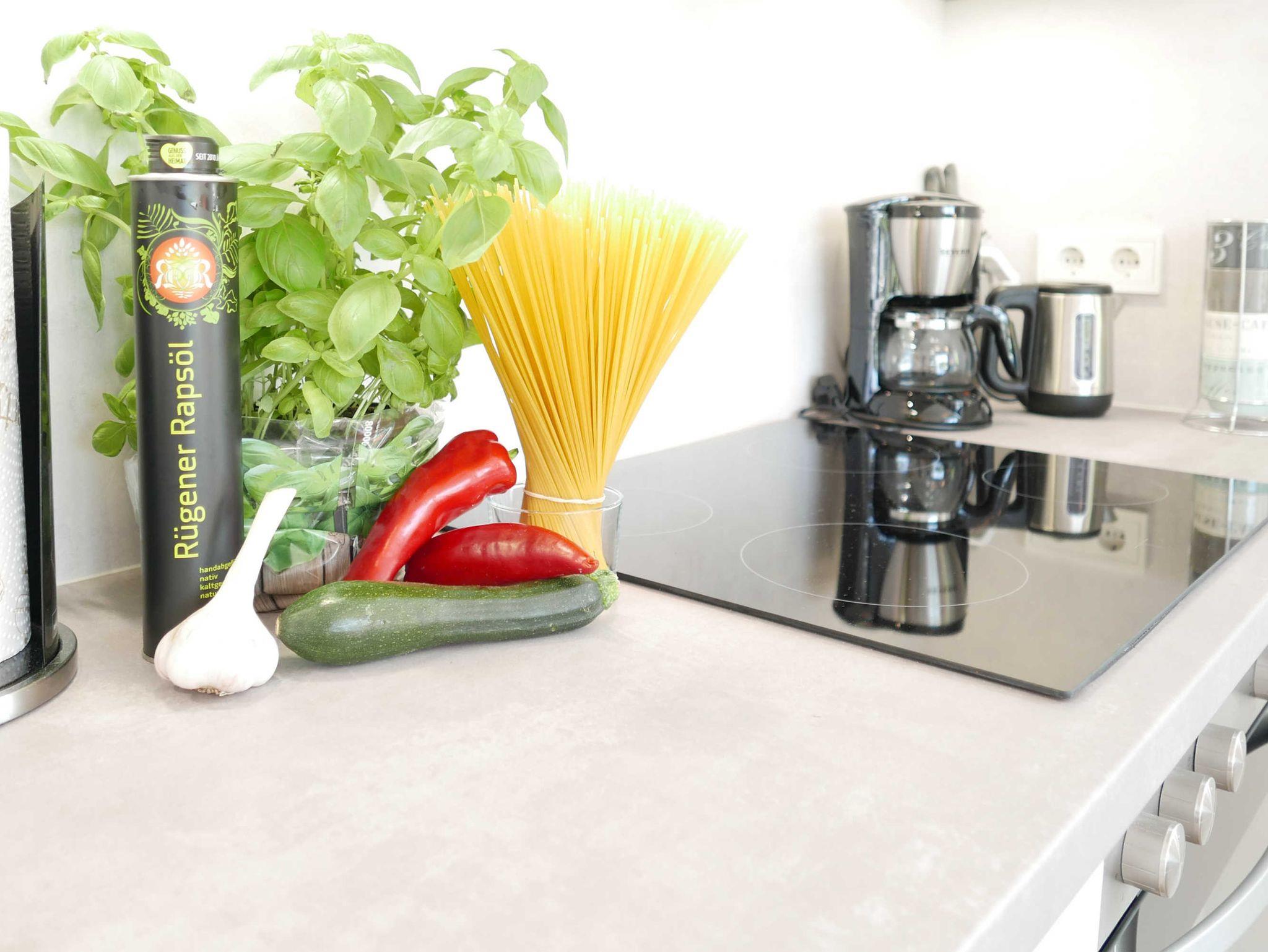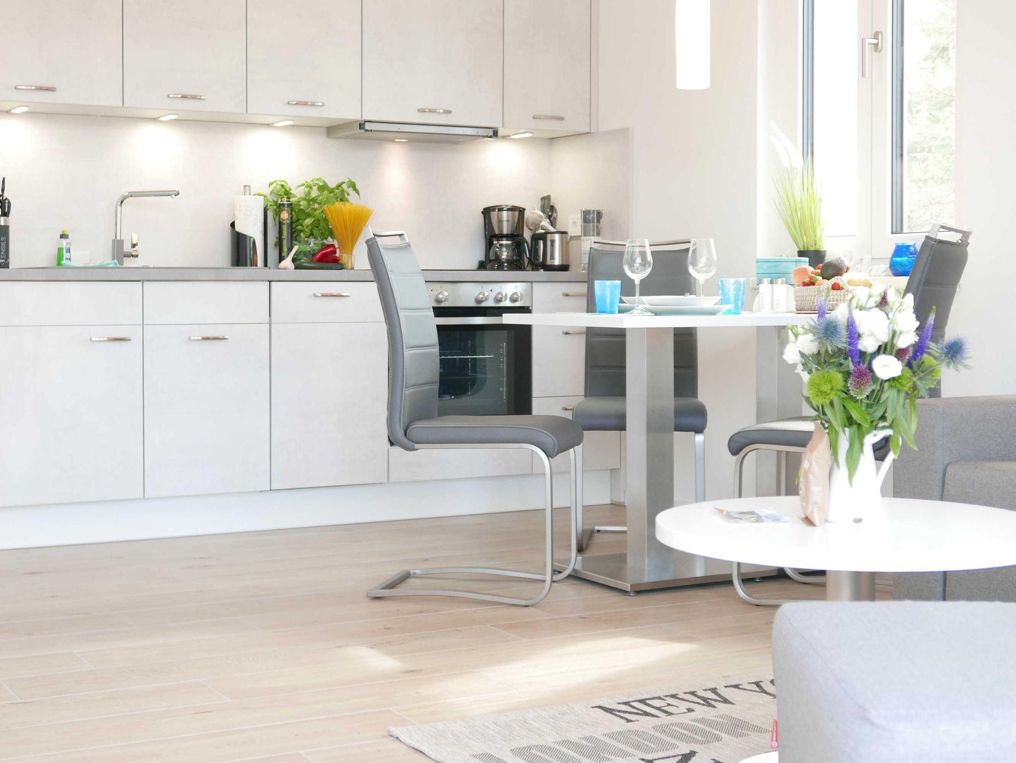 Die Küche ist umfassend mit Geschirrspüler, Heißluft-Backofen und 4-Platten-Ceranfeld, Kühlschrank und Gefrierfach, Wasserkocher, Toaster sowie Kaffee- und Espresso-Maschine ausgestattet.