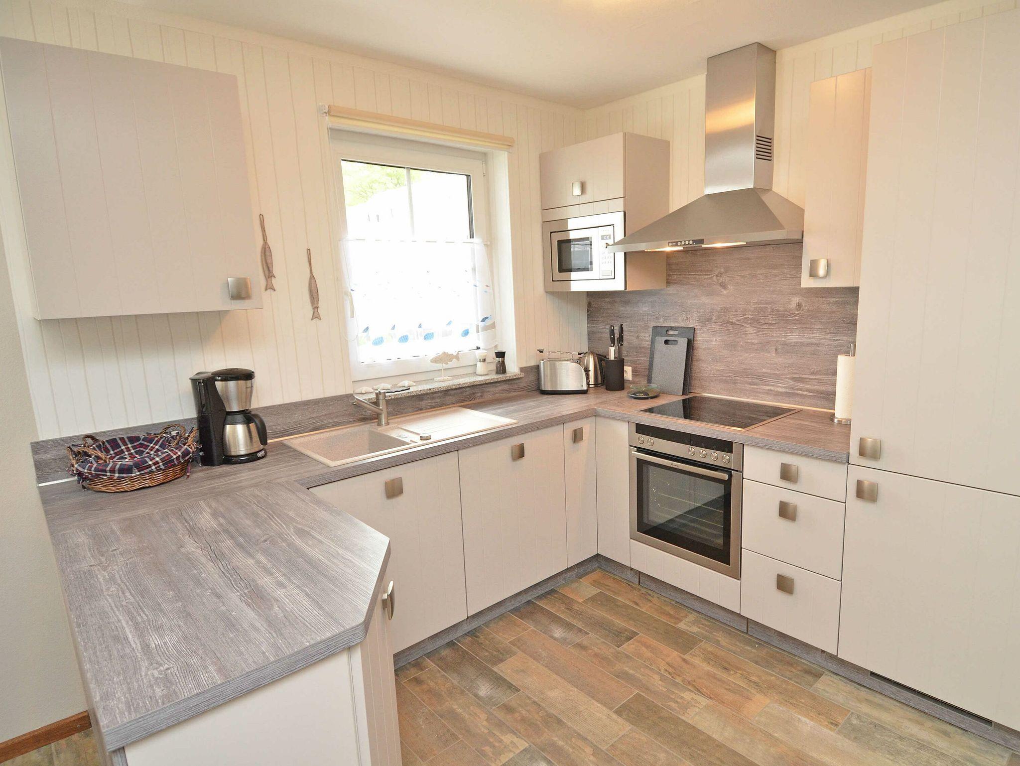 Die harmonisch im Wohnbereich integrierte hochwertig ausgestattete Nolte Küche verfügt über eine Spülmaschine, einen Backofen, ein 4-Platten-Induktionskochfeld, einem Kühlschrank mit extra Gefrierschrank, Mikrowelle, Kaffeemaschine, Toaster, Wasserkocher sowie diverses Kleininventar, das die Küchenausstattung komplettiert.