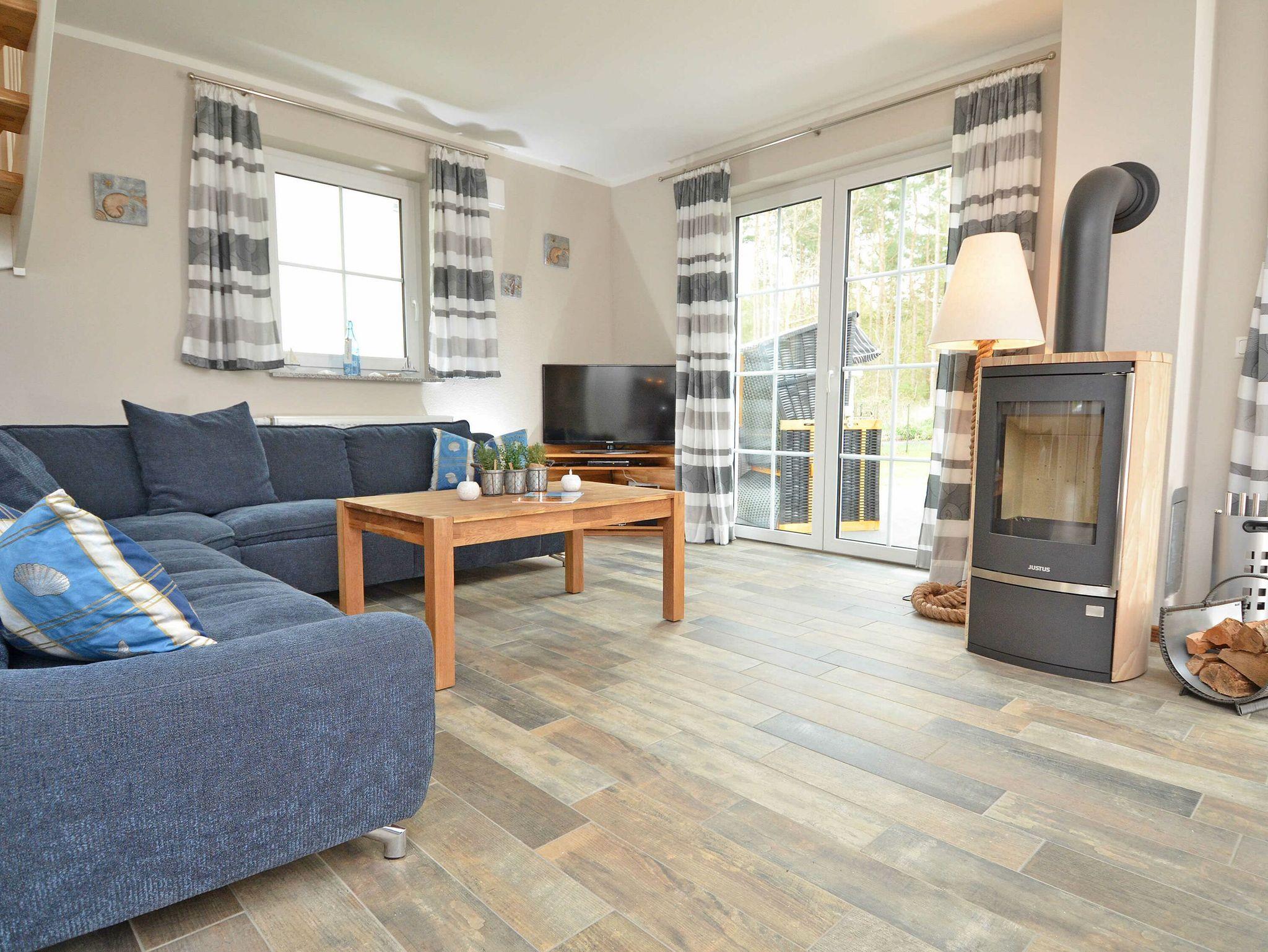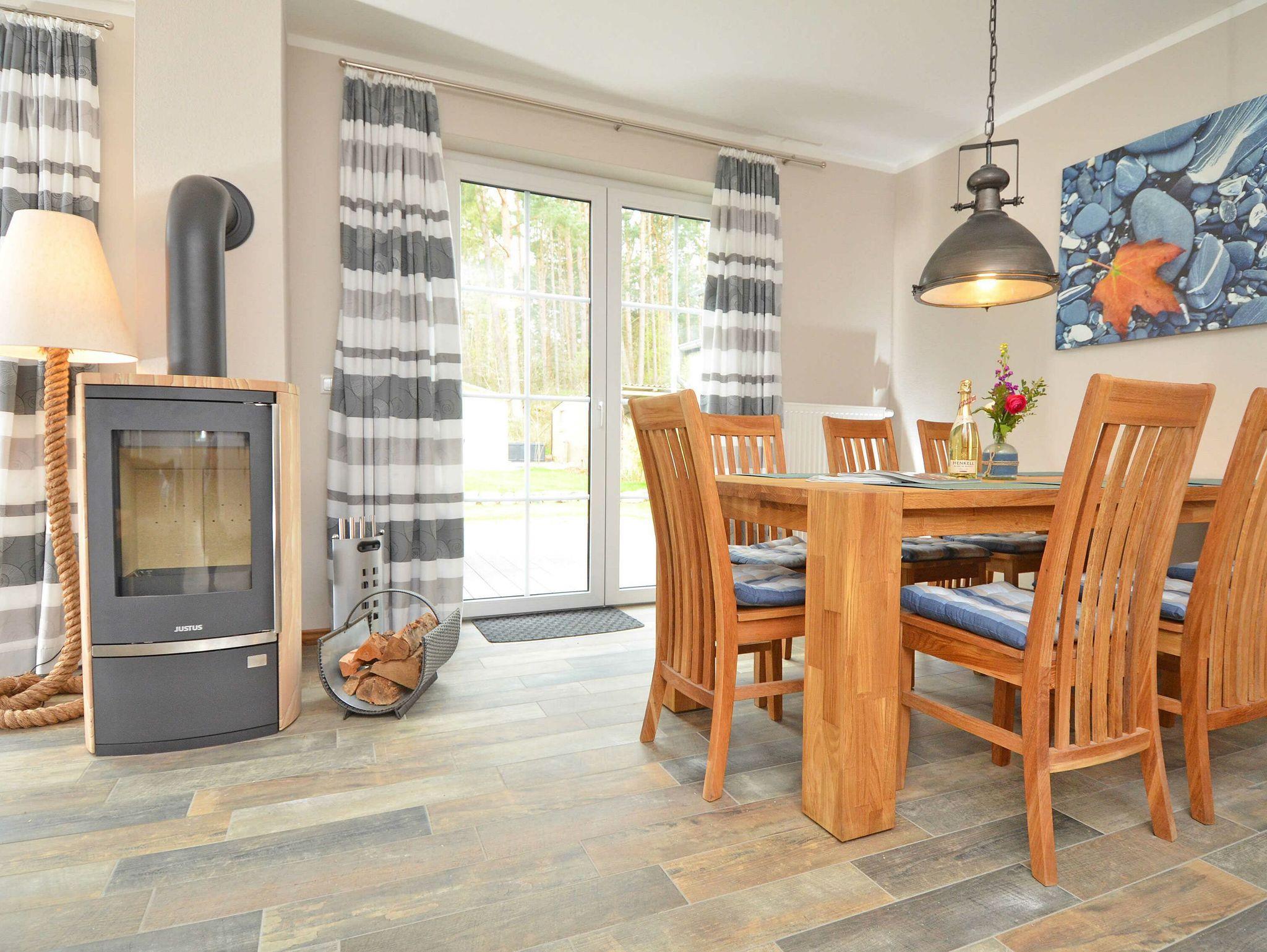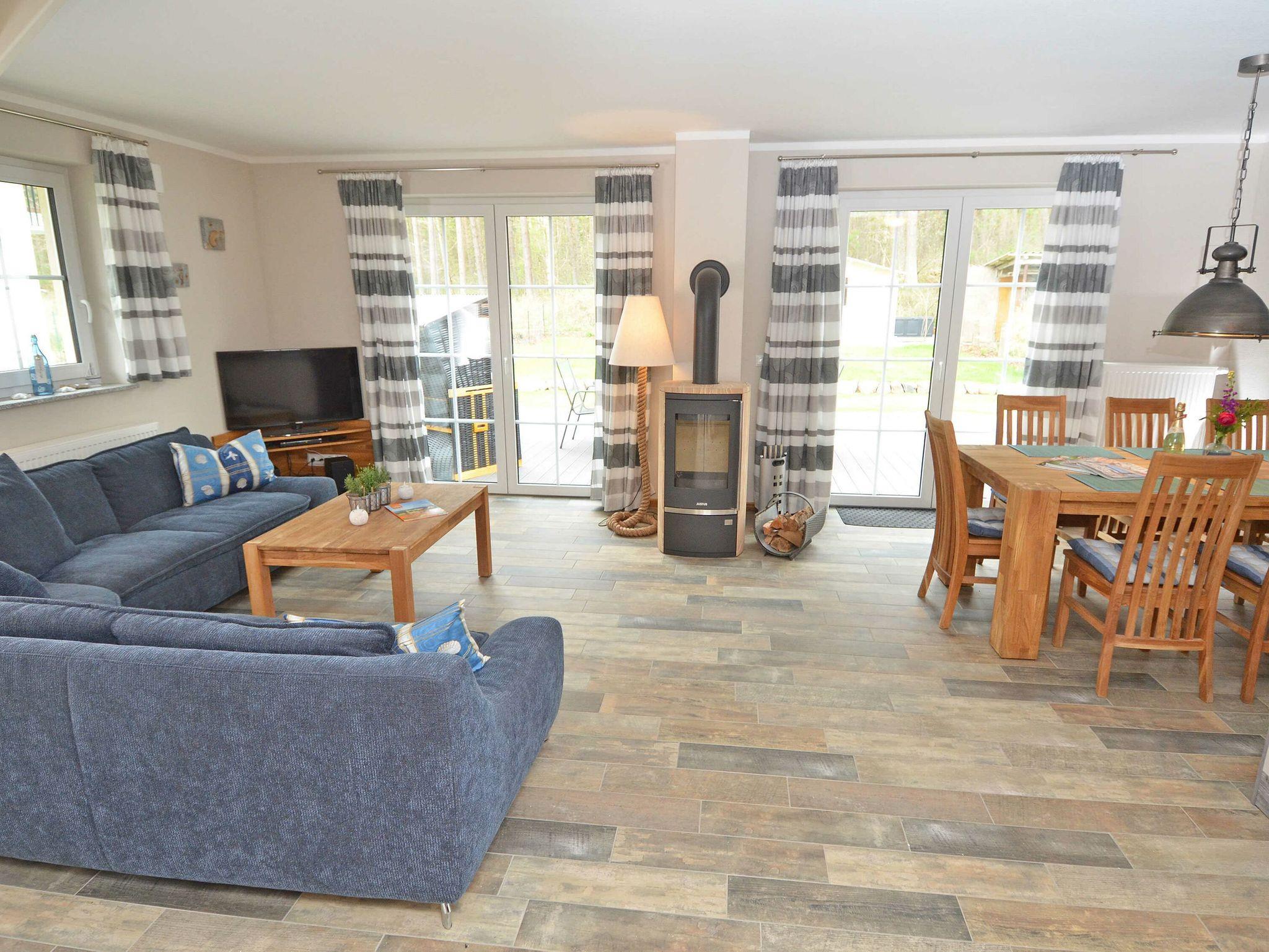 Im Erdgeschoss befindet sich das sehr geräumige, hochwertig eingerichtete Wohn- und Esszimmer mit einem großen Esstisch. Der Wohnbereich sorgt mit einer modernen Sitzecke und Möbeln aus Echtholz für viel Gemütlichkeit sowie mit einem Kamin für kuschlige Tage. Für den Kamin steht Ihnen kostenfrei Kaminholz vor Ort zur Verfügung. Für gute Unterhaltung nach einem erlebnisreichen Urlaubstag sorgt hier ein Flachbild-Fernseher, eine Musikanlage mit CD-, DVD-, USB- und IPod Anschluss.