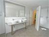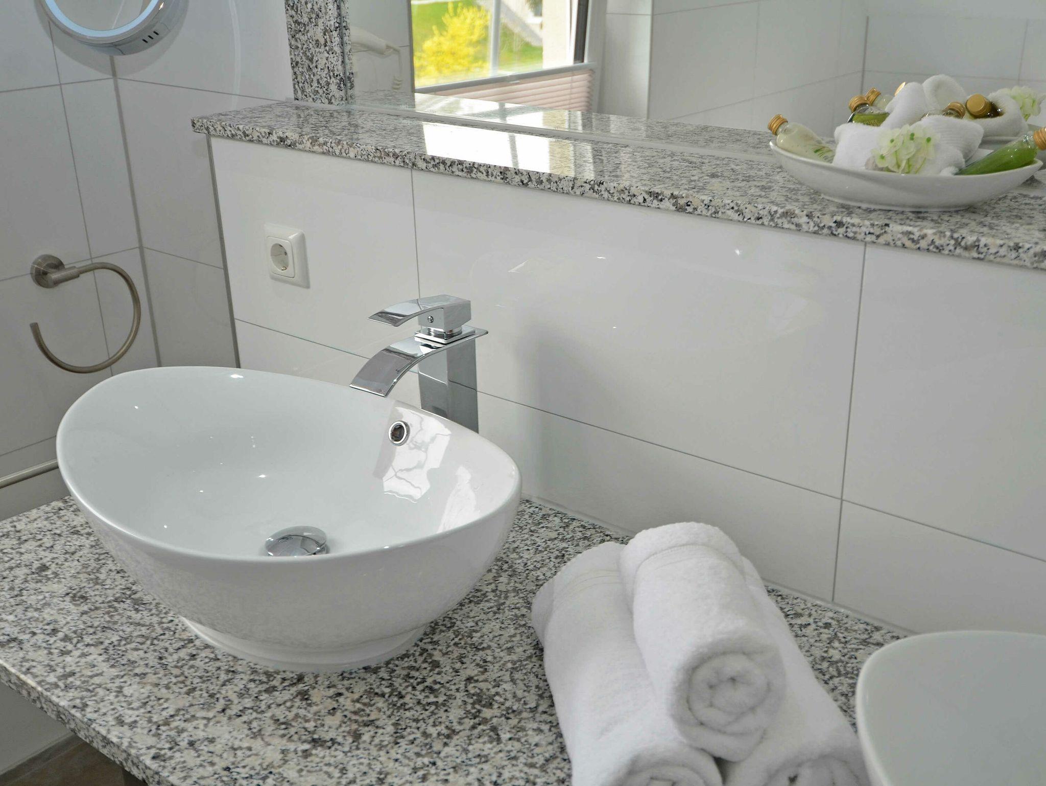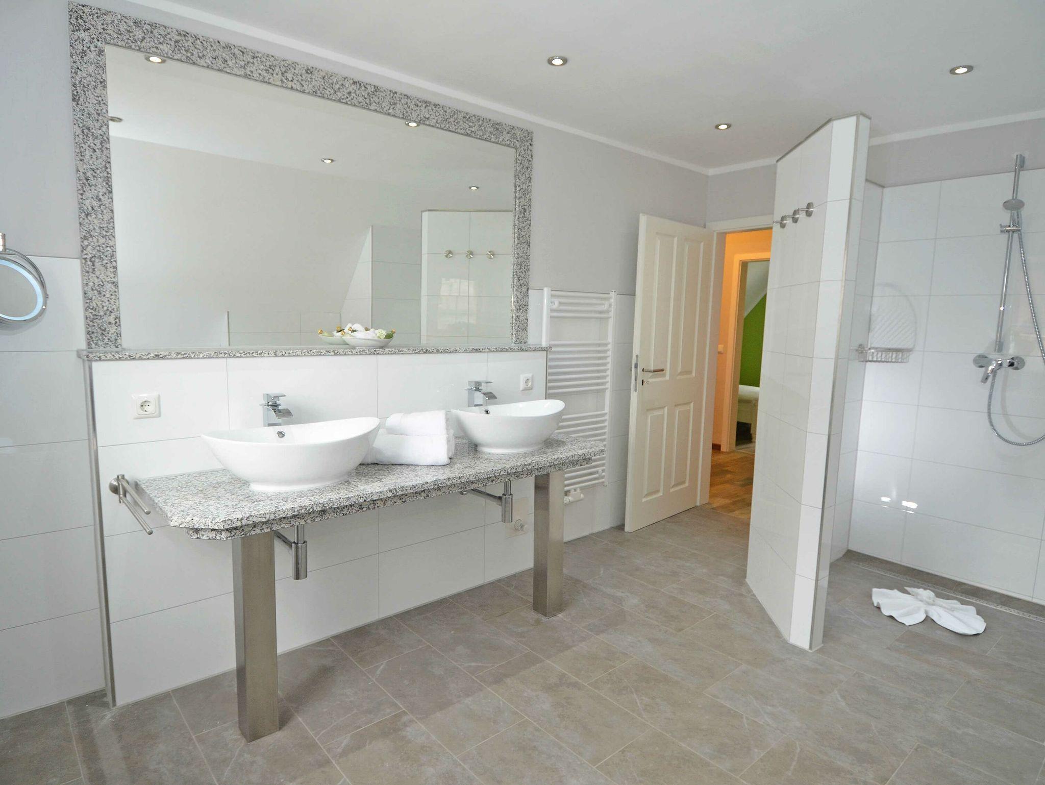 Das große Badezimmer im Obergeschoss besticht durch eine ebenerdige Dusche (1,20 x 1,40m), einer Eckbadewanne sowie einem großen Doppelwaschbecken auf einer Granitplatte. Auch dieses Bad ist mit einer Fußbodenheizung versehen sowie mit einem LED Kosmetikspiegel und Hotel Fön.