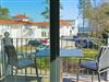 Die bodentiefen Fenster im Wohnbereich bieten einen Blick bis zum Meer. Auf dem Balkon befinden sich Stühle und Tische, auf denen Sie den Blick aufs Meer genießen können.