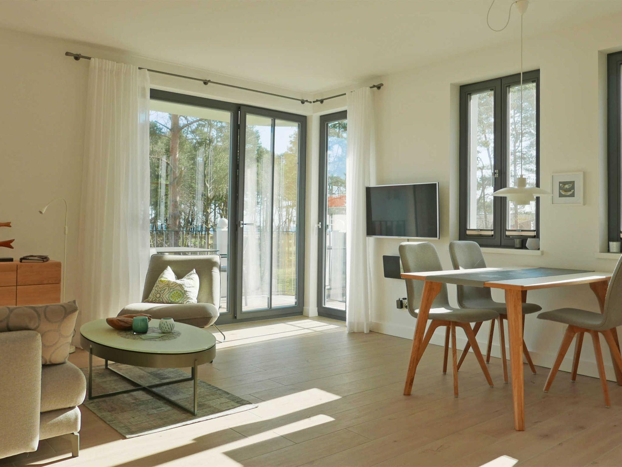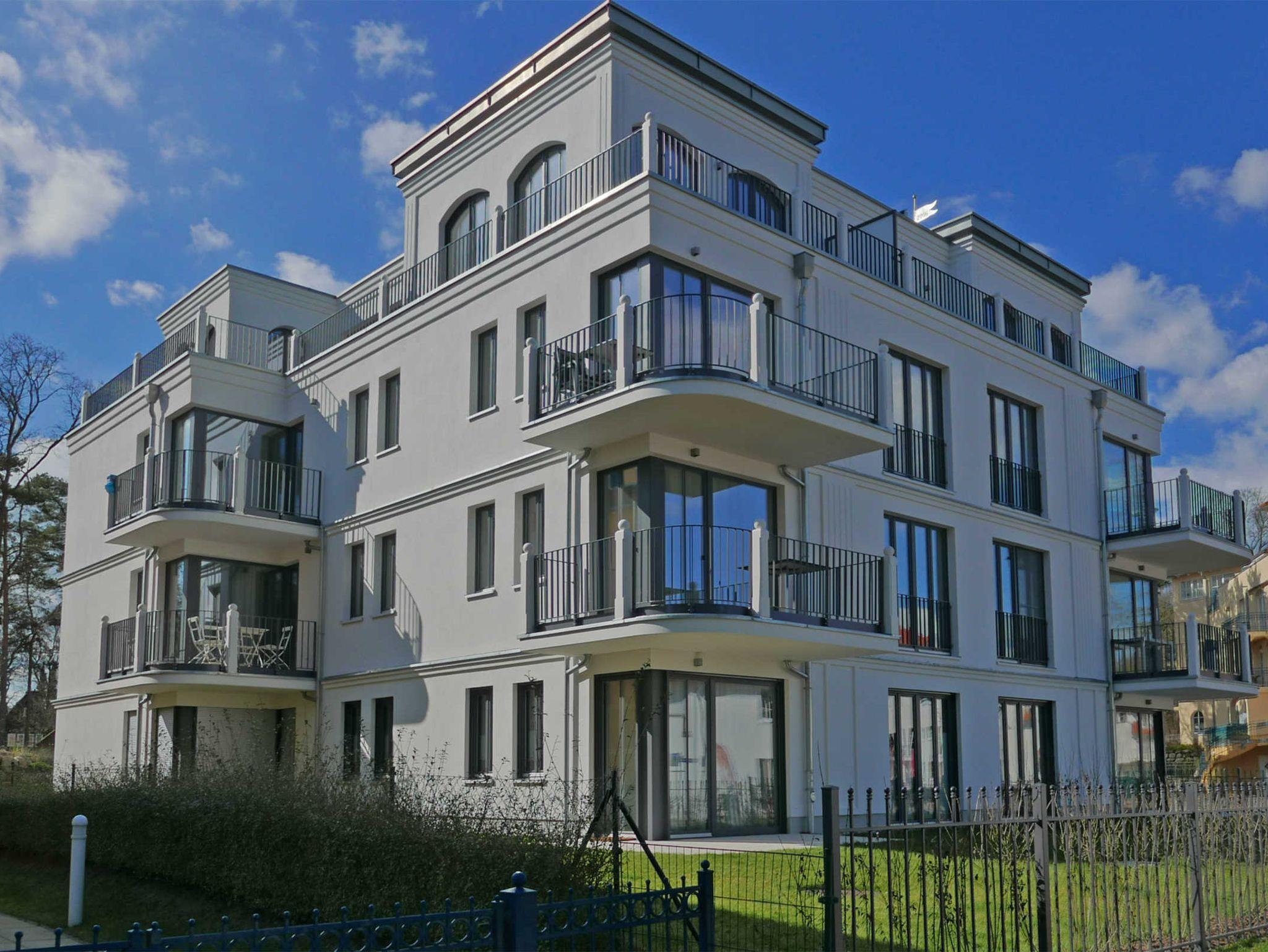 Wunderschöne neu gebaute Villa vis a vis dem Strand, an der Promenade von Baabe. Exquisite Ferienwohnung mit Meerblick für 4 Personen in der Villa Andrea. Die 68 qm große Wohnung mit Balkon verfügt über 2 Schlafzimmer mit je einem Flachbildschirm, eines mit Doppelbett (180 x 200 Meter) und eines mit 2 Einzelbetten (je 90 x 200 Meter). Ein schöner Luxus sind die beiden Duschbäder mit WC, eines davon ensuite zum Doppelschlafzimmer. Die Küche ist mit Induktionsherd, Backofen, Geschirrspülmaschine und vielen mehr bestens ausgestattet.