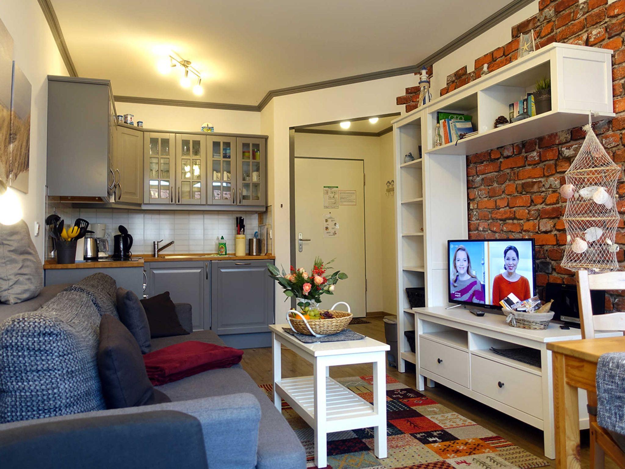 Der Wohn-/Essbereicht mit integrierter Küchenzeile ist gemütlich mit Essplatz, TV und Radio sowie Schlafsofa (200 x 150 cm) für 2 Kinder oder einen Erwachsenen ausgestattet.