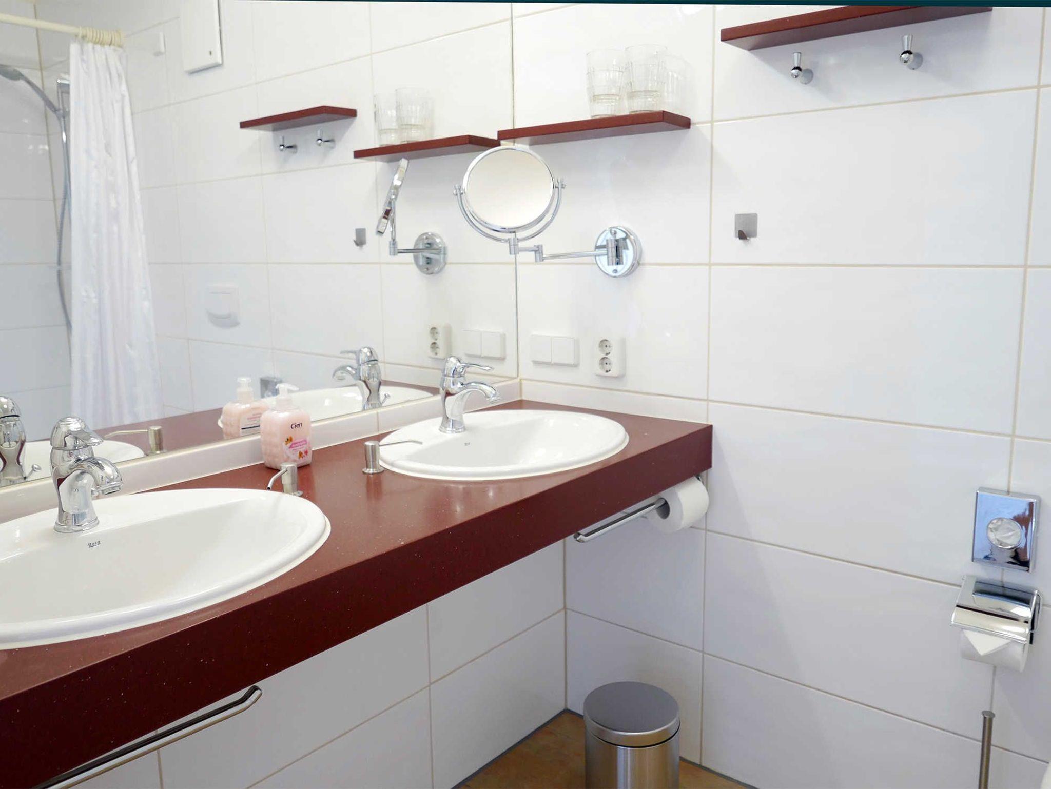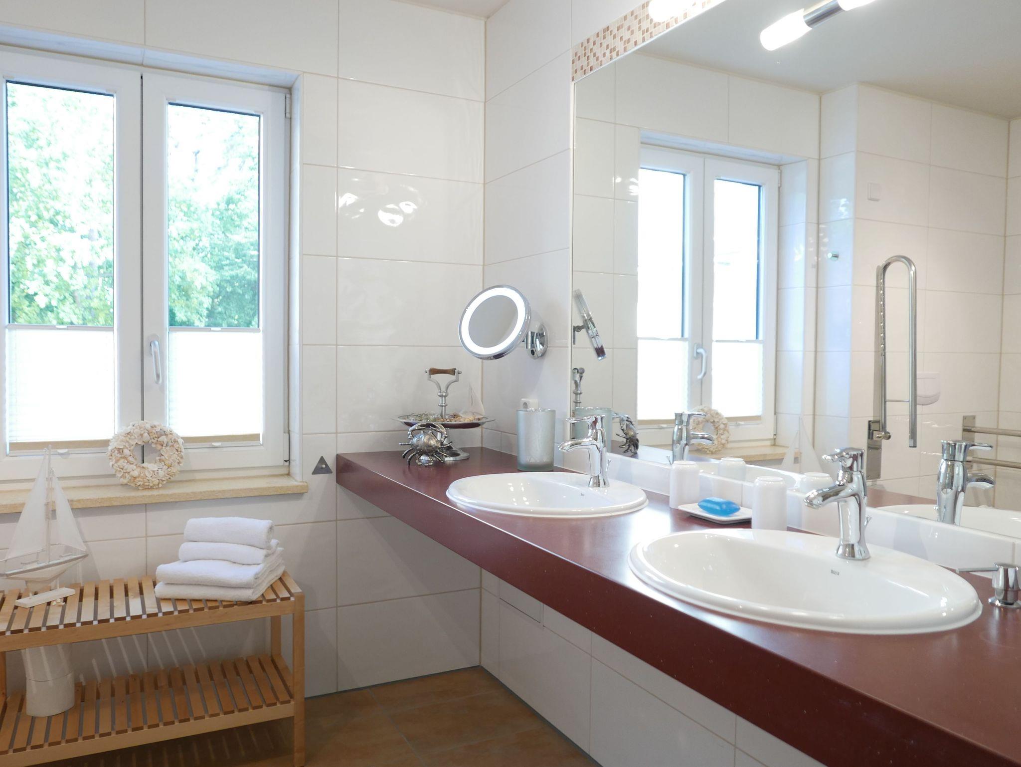 Das Badezimmer verfügt über eine großzügige, ebenerdige Dusche sowie einen großen Waschtisch, der viel Platz bietet. Ebenfalls finden Sie dort einen Haartrockner.